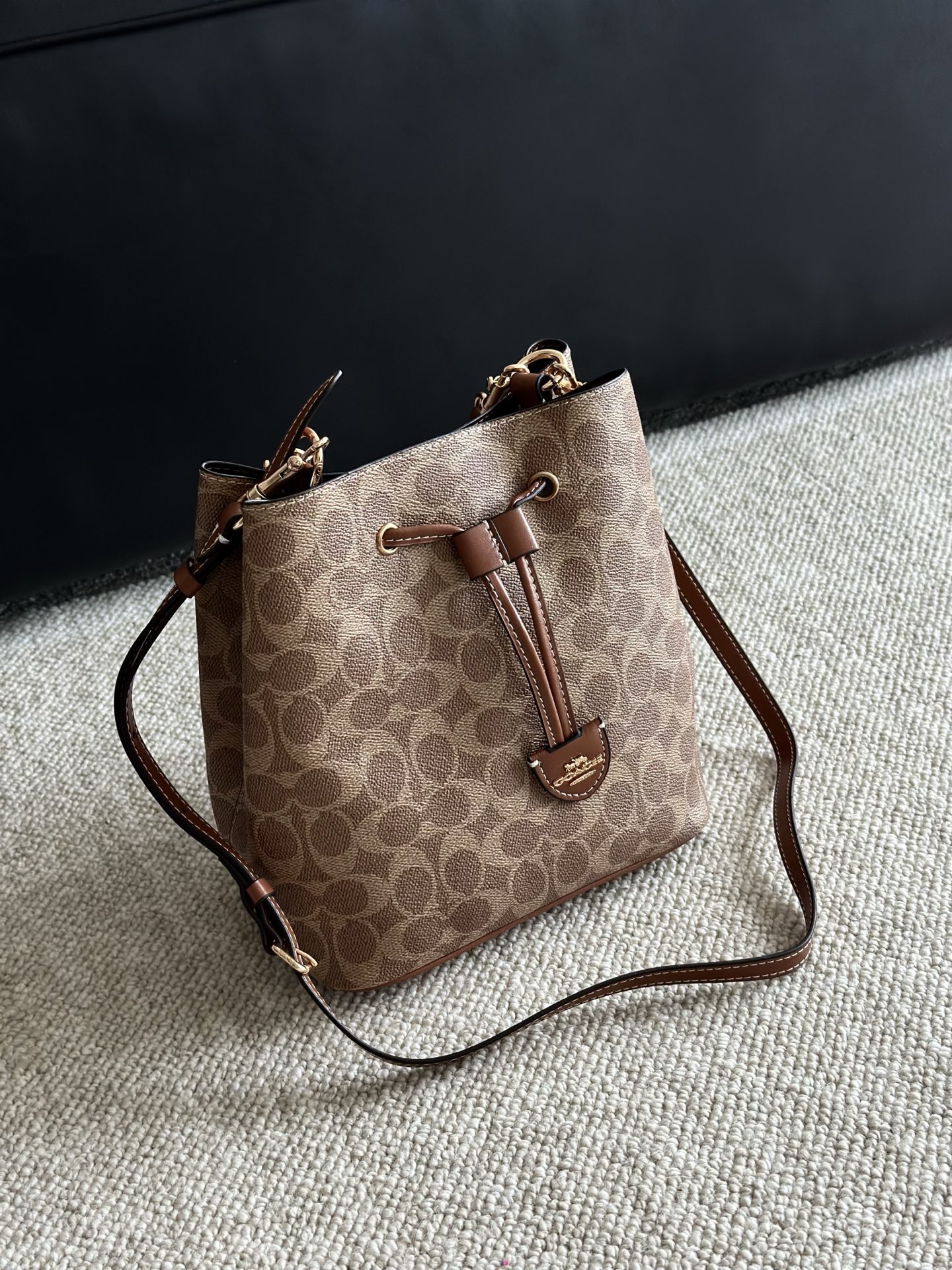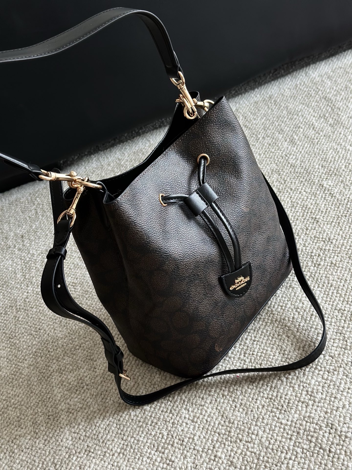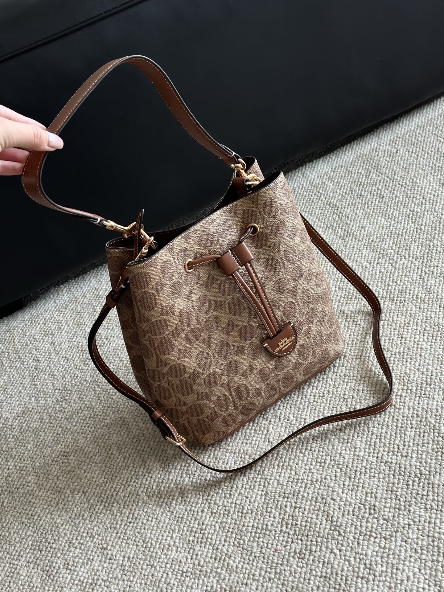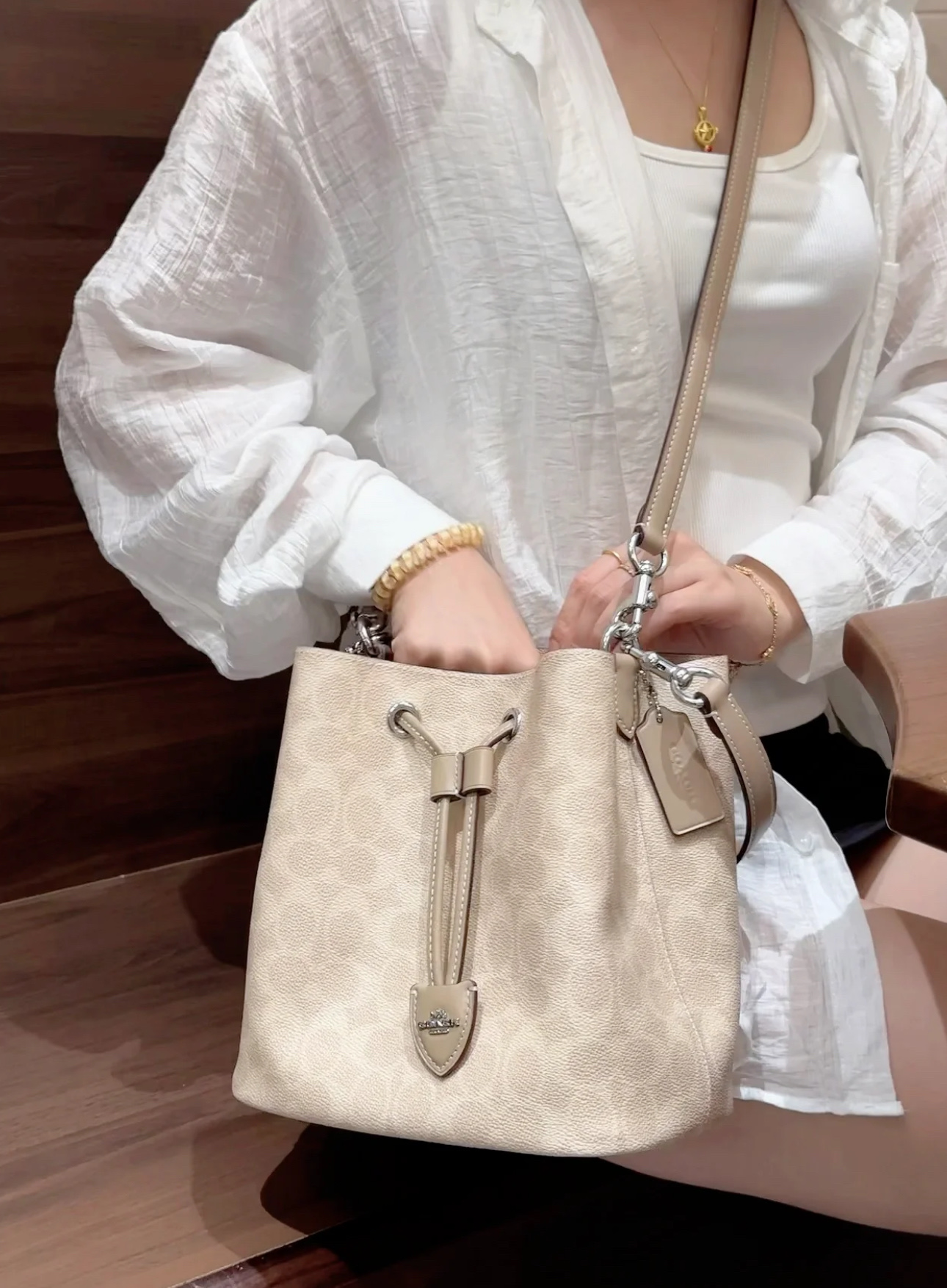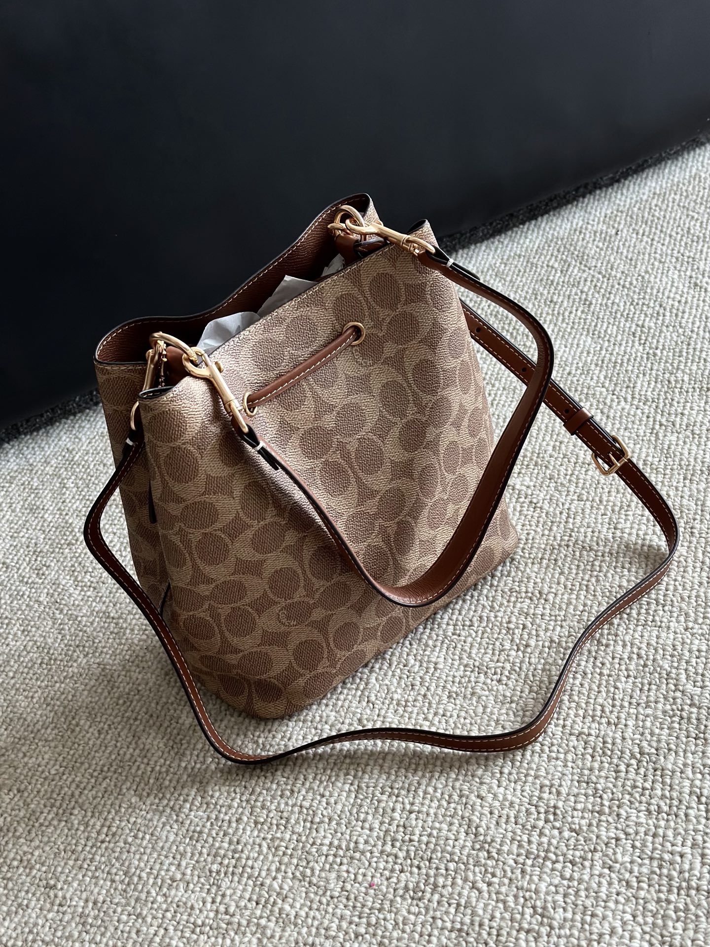 6月新品!蔻驰 CBH07 经典老花Rowan抽绳水桶包 子母包搭配可拆卸长短带,可手提腋下单肩斜挎多功能用法,可拆卸拉链手包、中央开放式隔层,抽绳设计开口 ,今天的价格买到就是赚到,摸着都是一种享受!!这种细节一看就知道大厂工艺!coa在我这就是口碑!买过的都知道品质!这款包真的是集时尚与实用于一身,老花复古又百搭,而且款式设计很别致,包身采用柔软的皮质材料,触感舒适且耐用,容量也很可观,非常适合日常出行使用! 尺寸约:长21cm x 高21cm x 宽14cm
