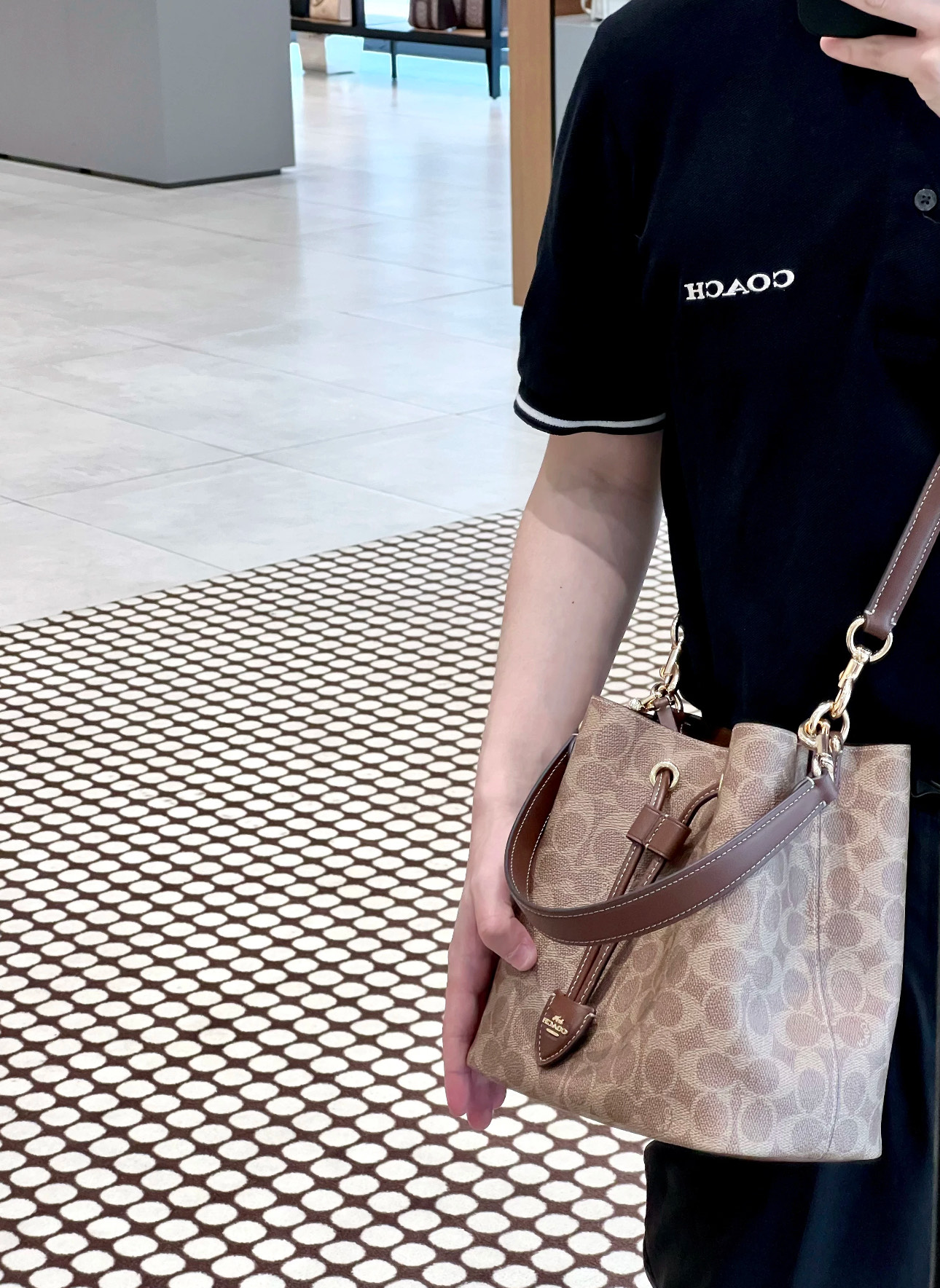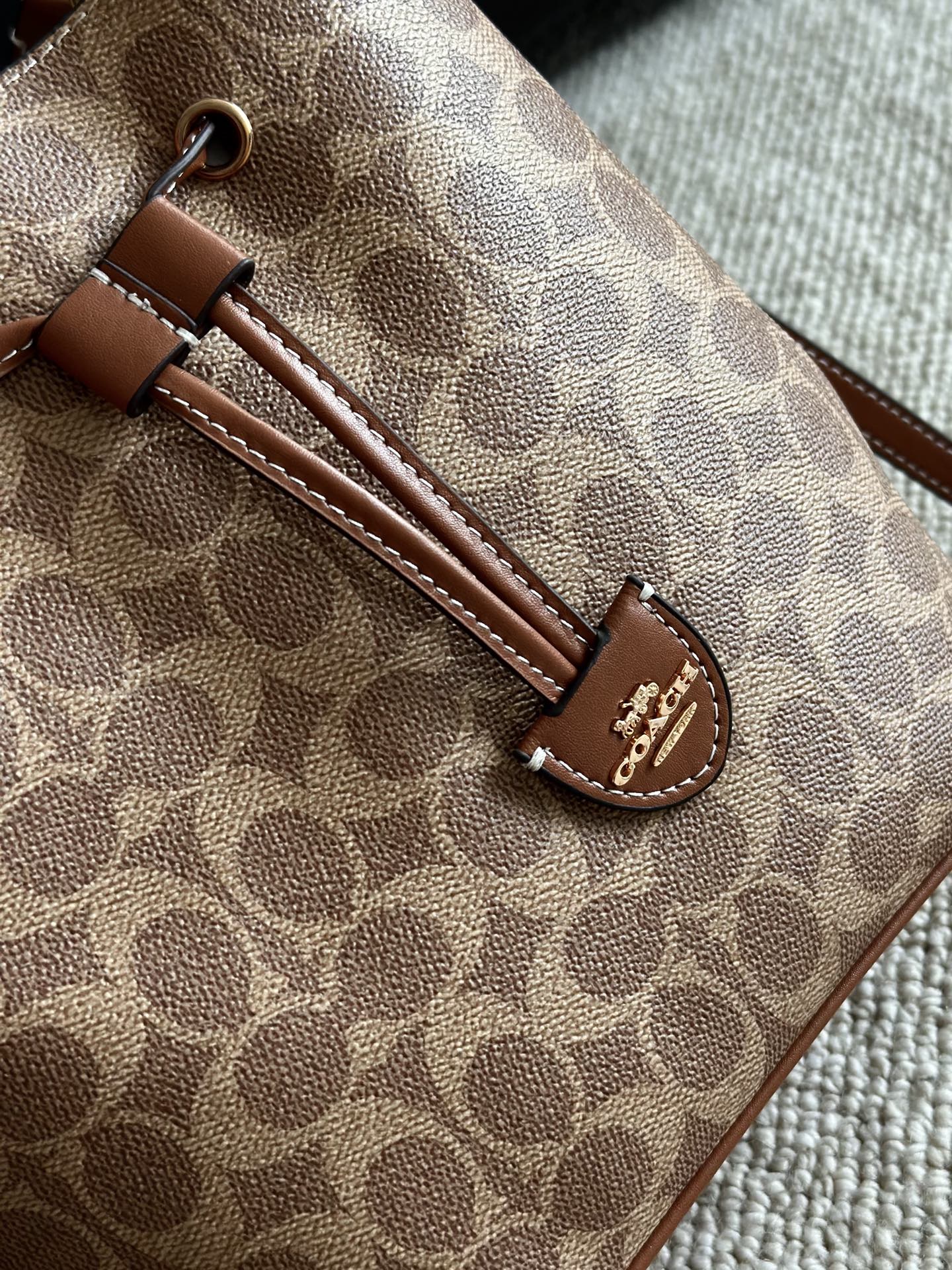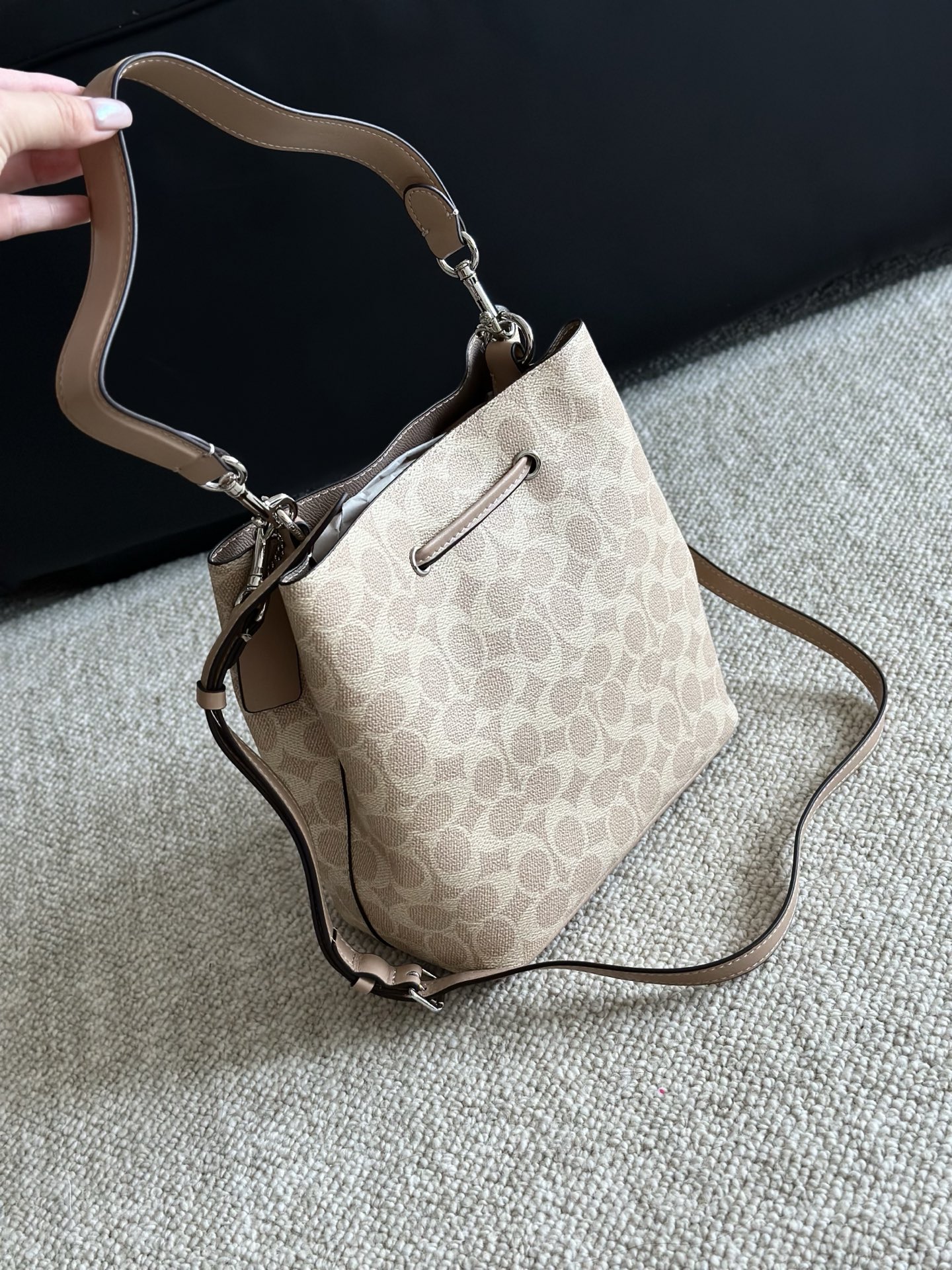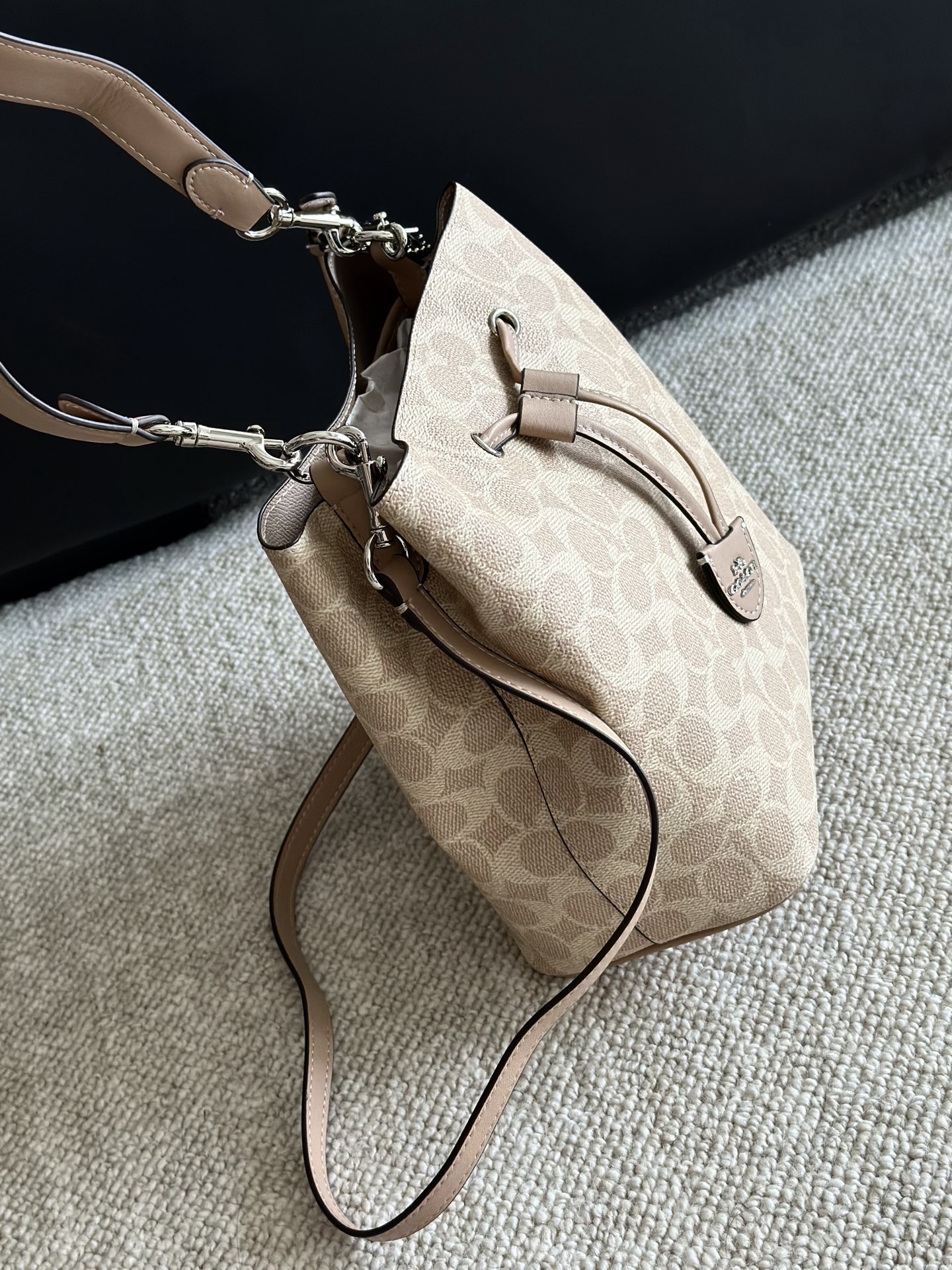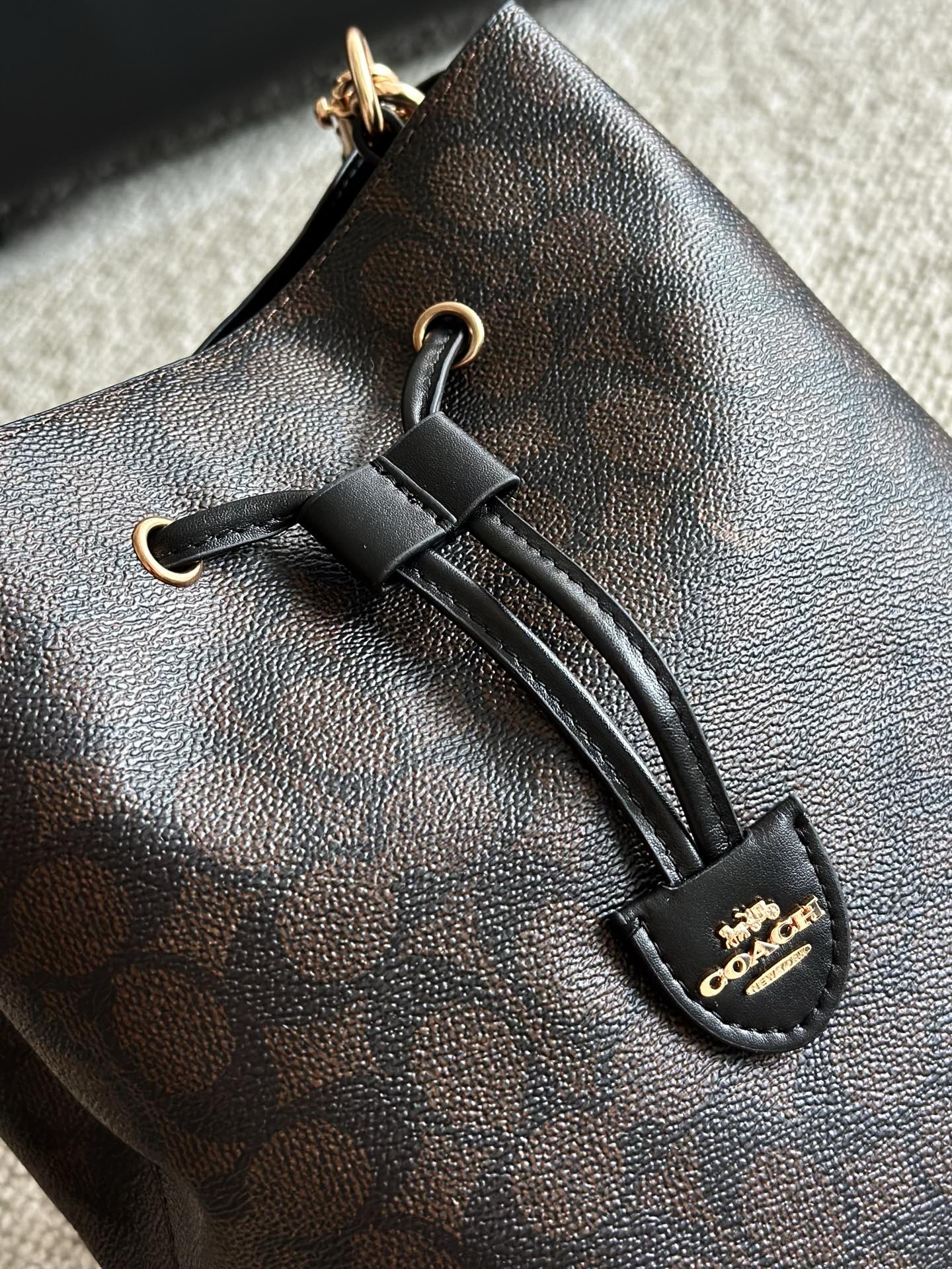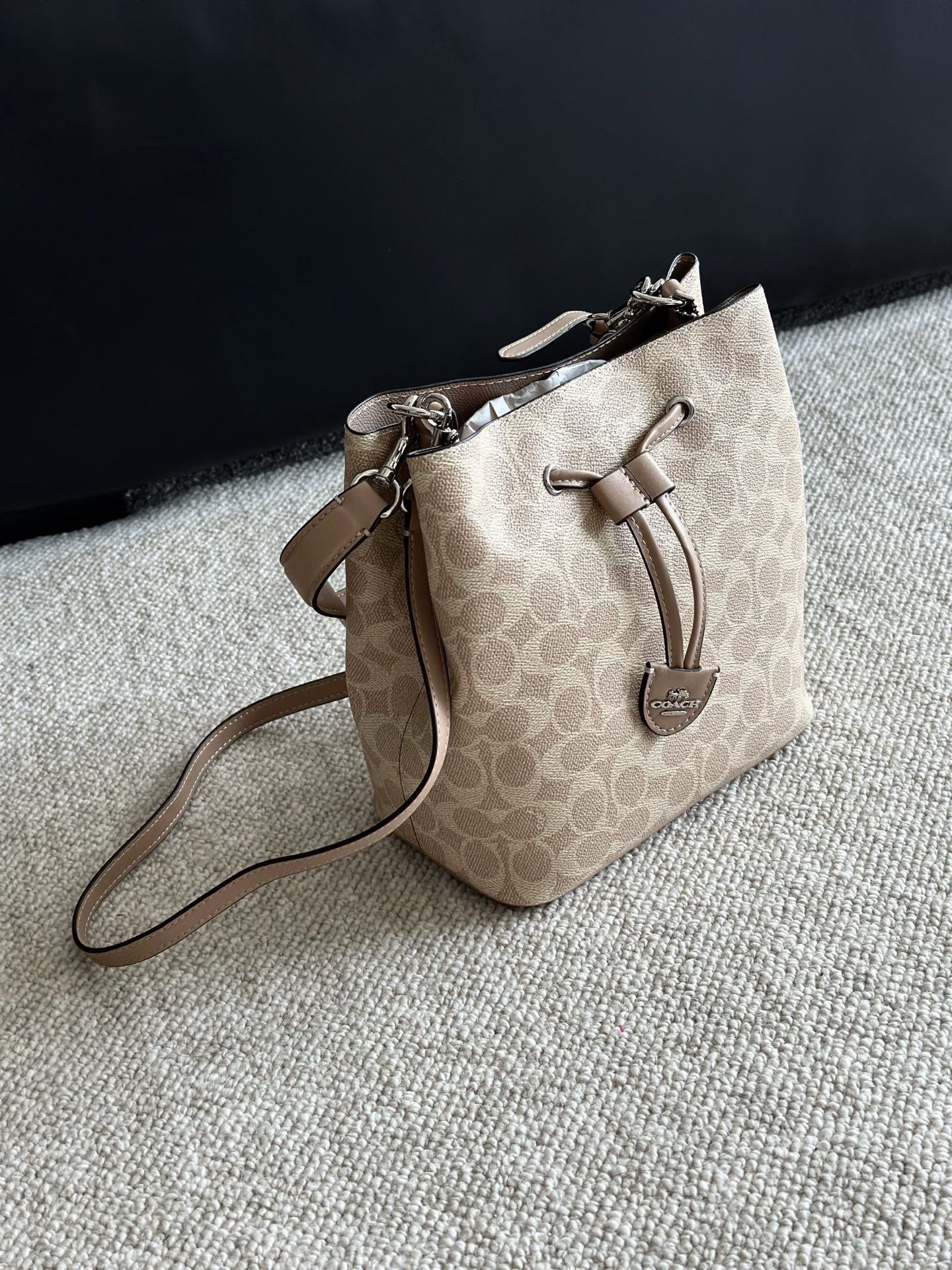 6月新品!蔻驰 CBH07 经典老花Rowan抽绳水桶包 子母包搭配可拆卸长短带,可手提腋下单肩斜挎多功能用法,可拆卸拉链手包、中央开放式隔层,抽绳设计开口 ,今天的价格买到就是赚到,摸着都是一种享受!!这种细节一看就知道大厂工艺!coa在我这就是口碑!买过的都知道品质!这款包真的是集时尚与实用于一身,老花复古又百搭,而且款式设计很别致,包身采用柔软的皮质材料,触感舒适且耐用,容量也很可观,非常适合日常出行使用! 尺寸约:长21cm x 高21cm x 宽14cm