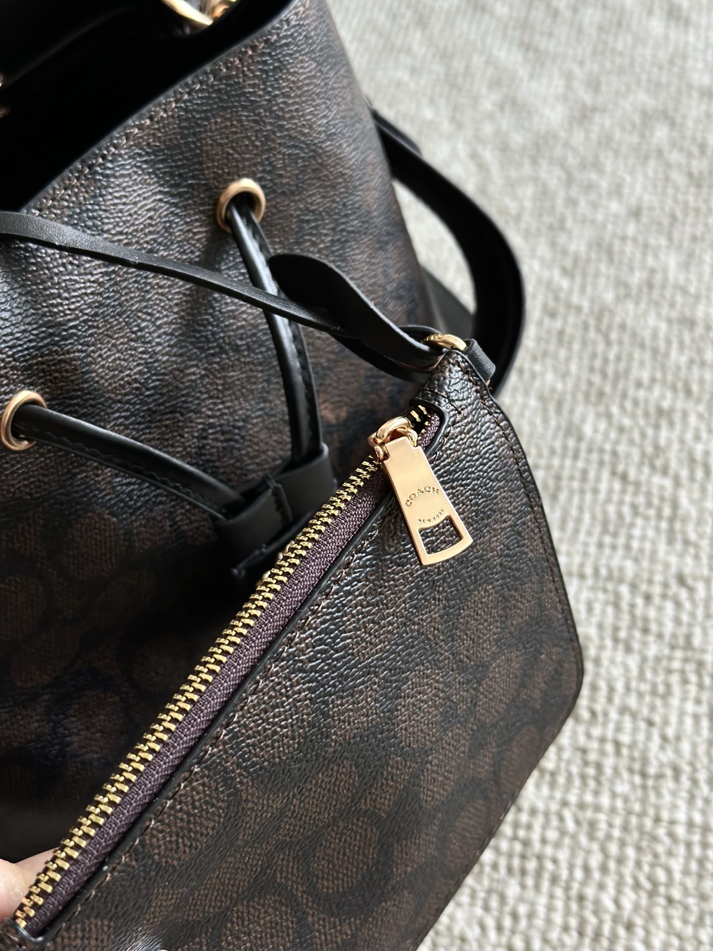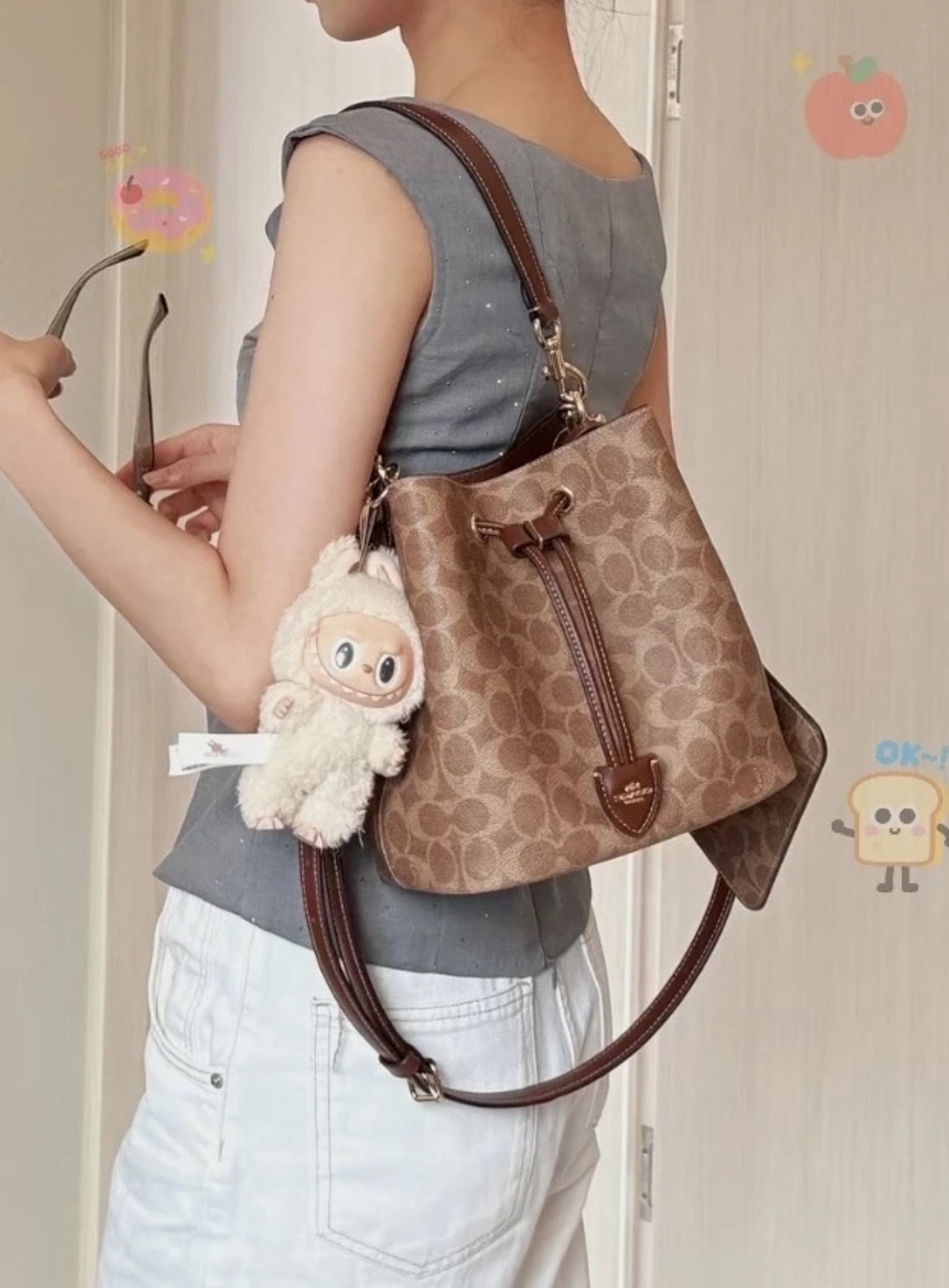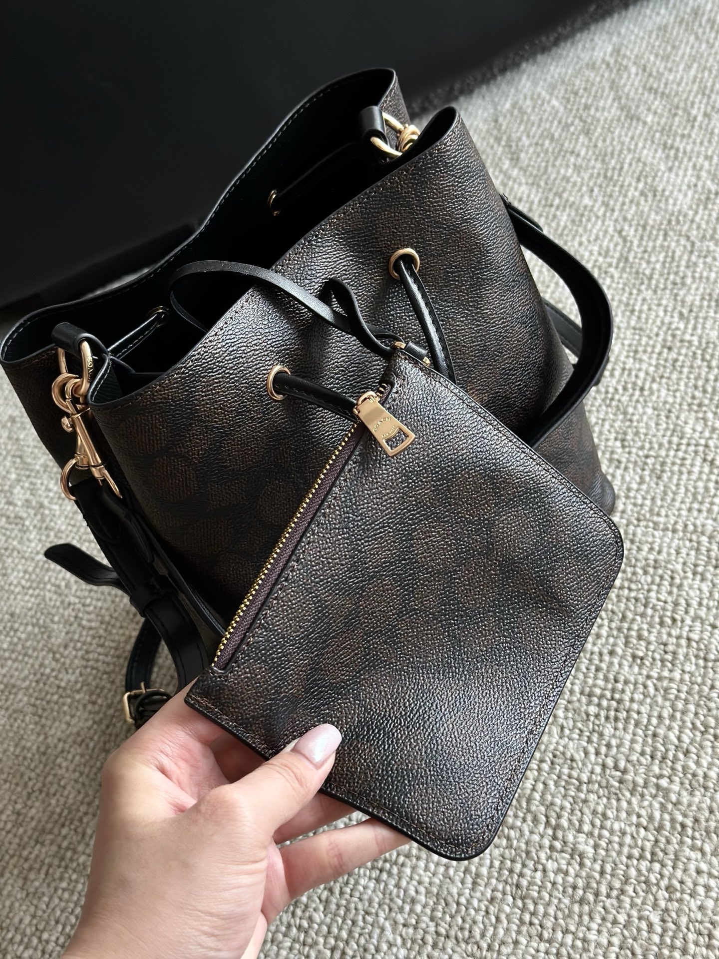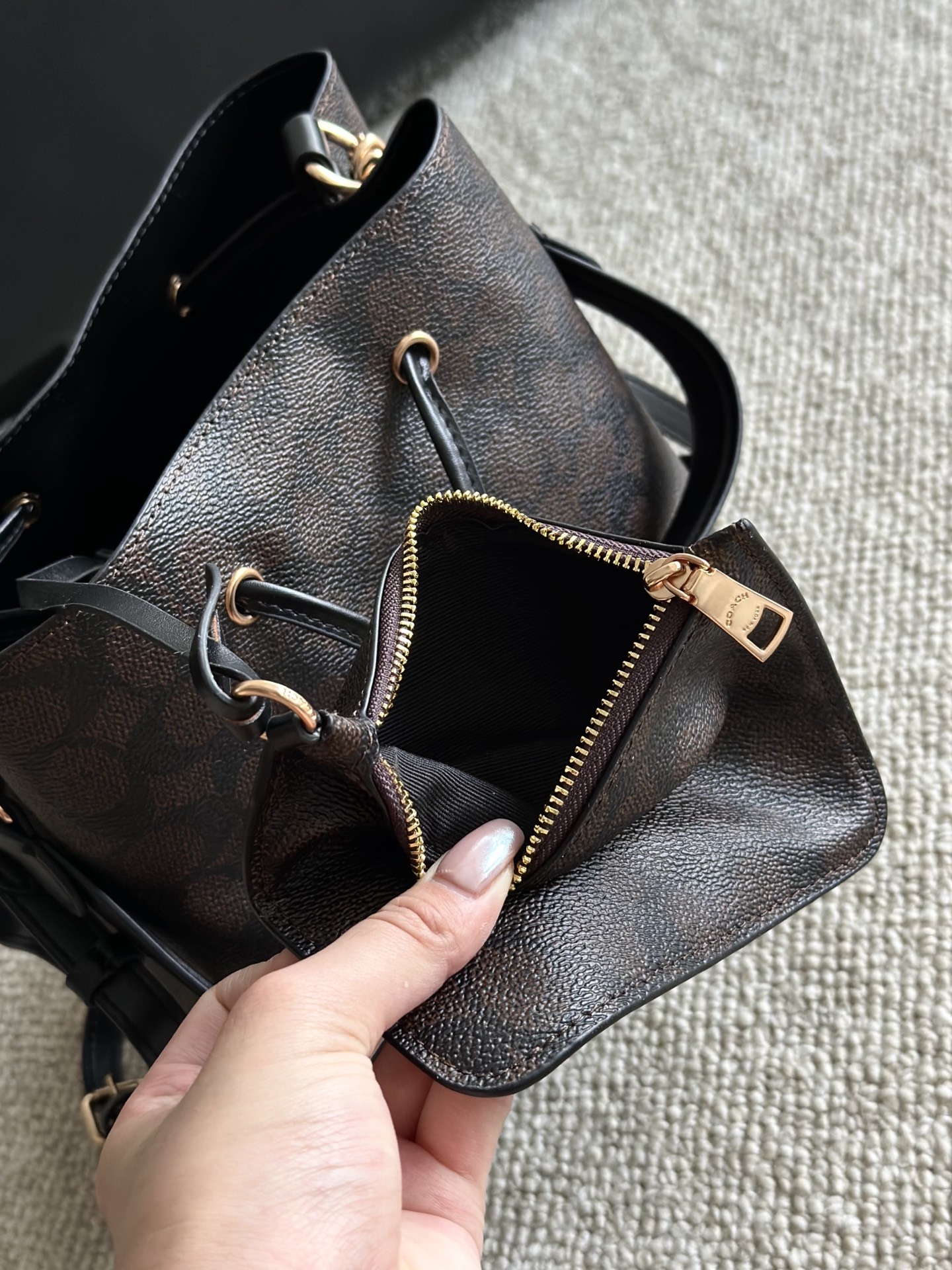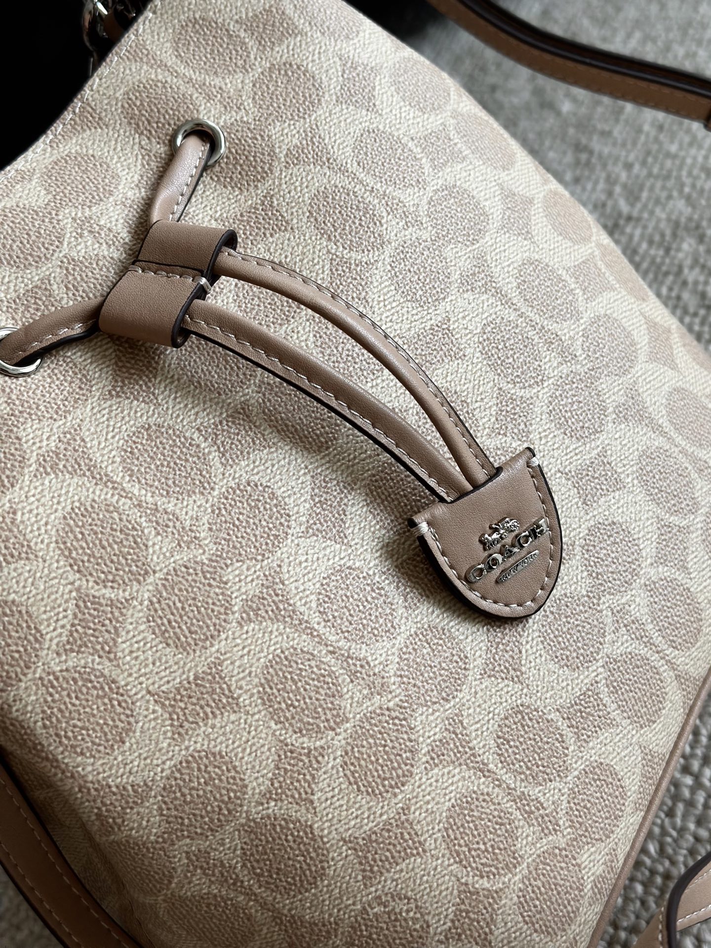 6月新品!蔻驰 CBH07 经典老花Rowan抽绳水桶包 子母包搭配可拆卸长短带,可手提腋下单肩斜挎多功能用法,可拆卸拉链手包、中央开放式隔层,抽绳设计开口 ,今天的价格买到就是赚到,摸着都是一种享受!!这种细节一看就知道大厂工艺!coa在我这就是口碑!买过的都知道品质!这款包真的是集时尚与实用于一身,老花复古又百搭,而且款式设计很别致,包身采用柔软的皮质材料,触感舒适且耐用,容量也很可观,非常适合日常出行使用! 尺寸约:长21cm x 高21cm x 宽14cm