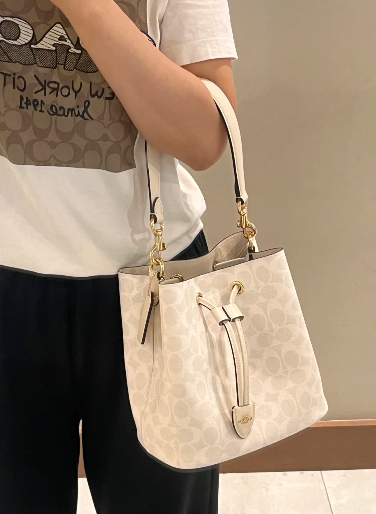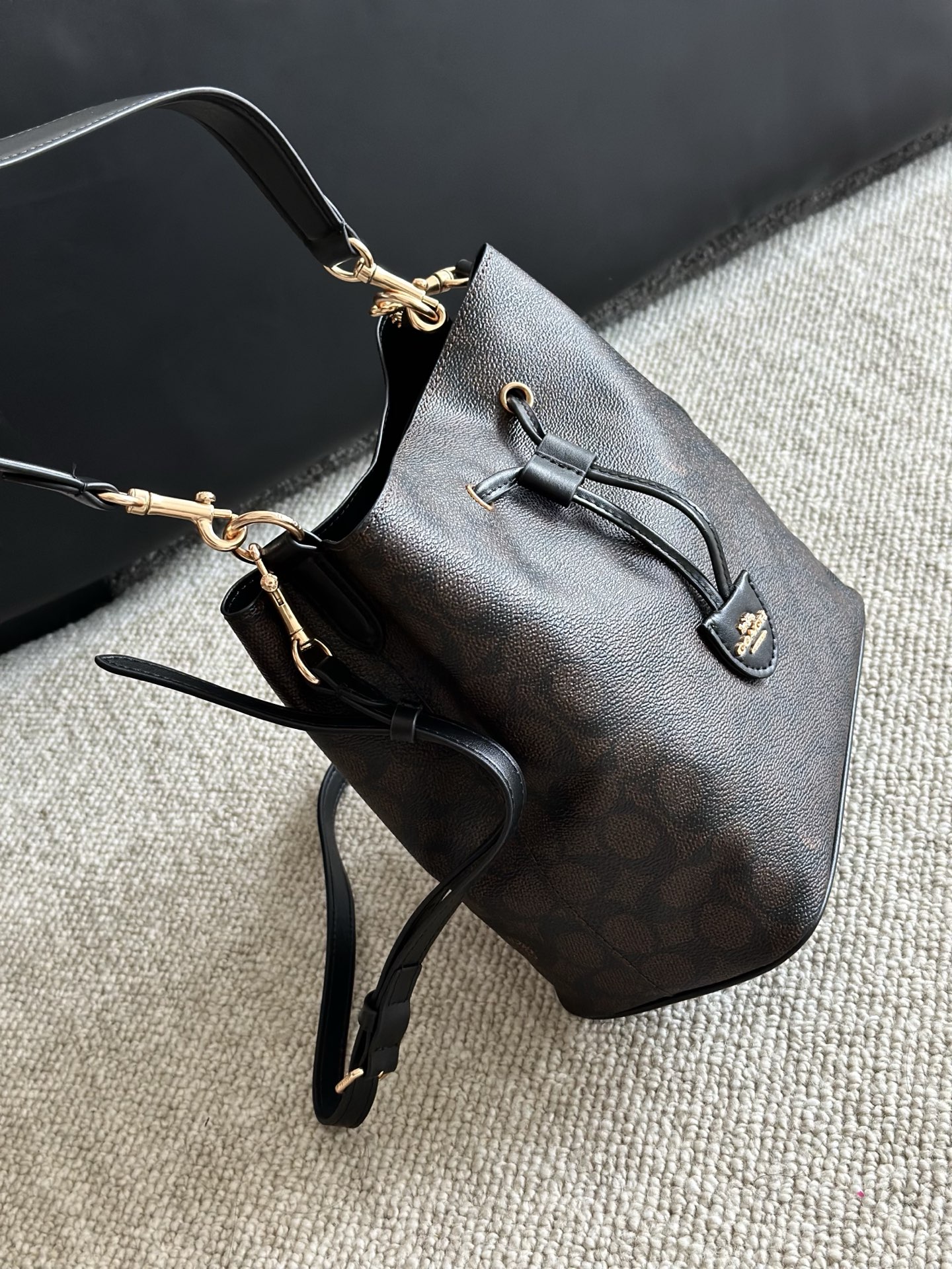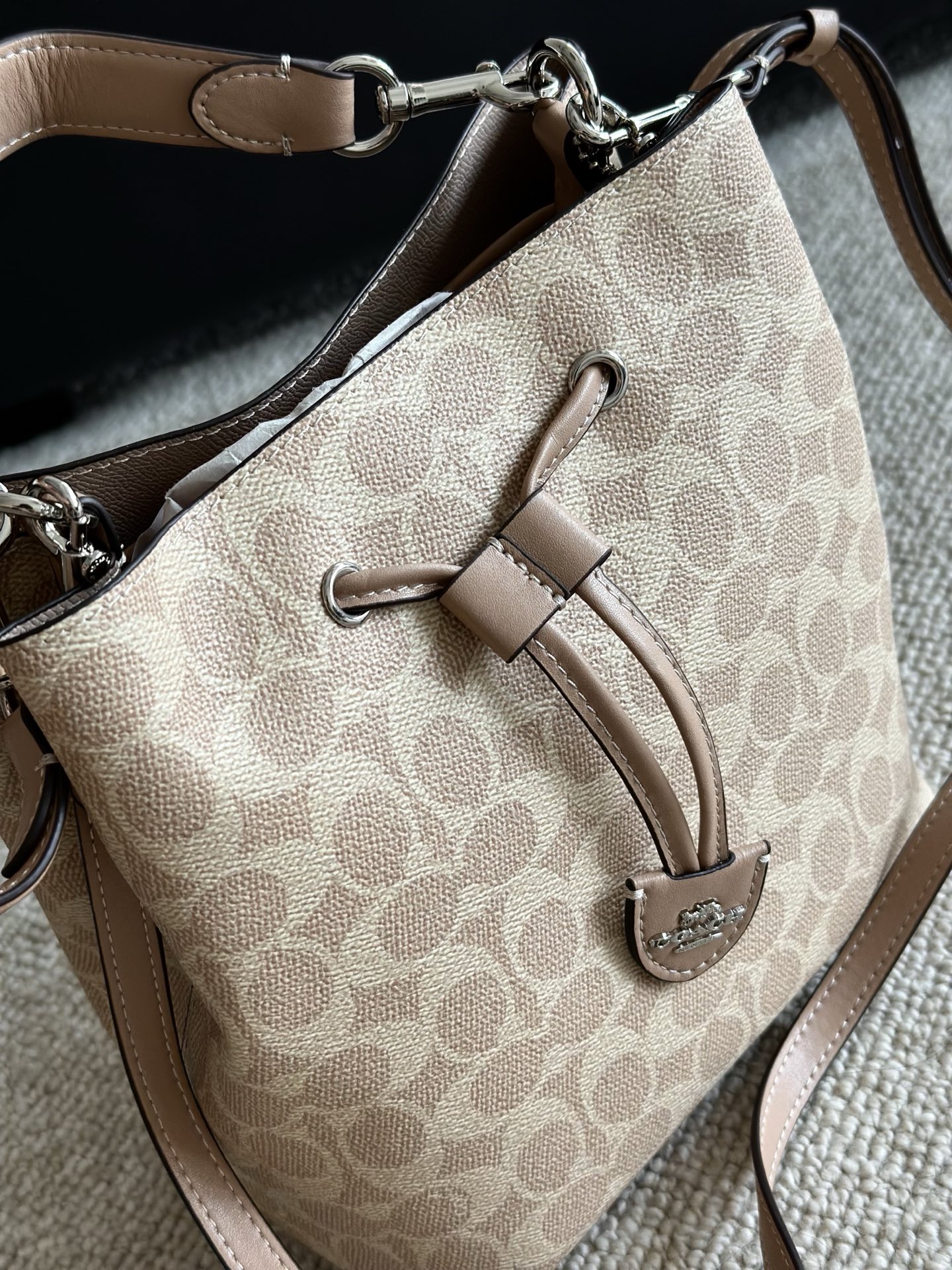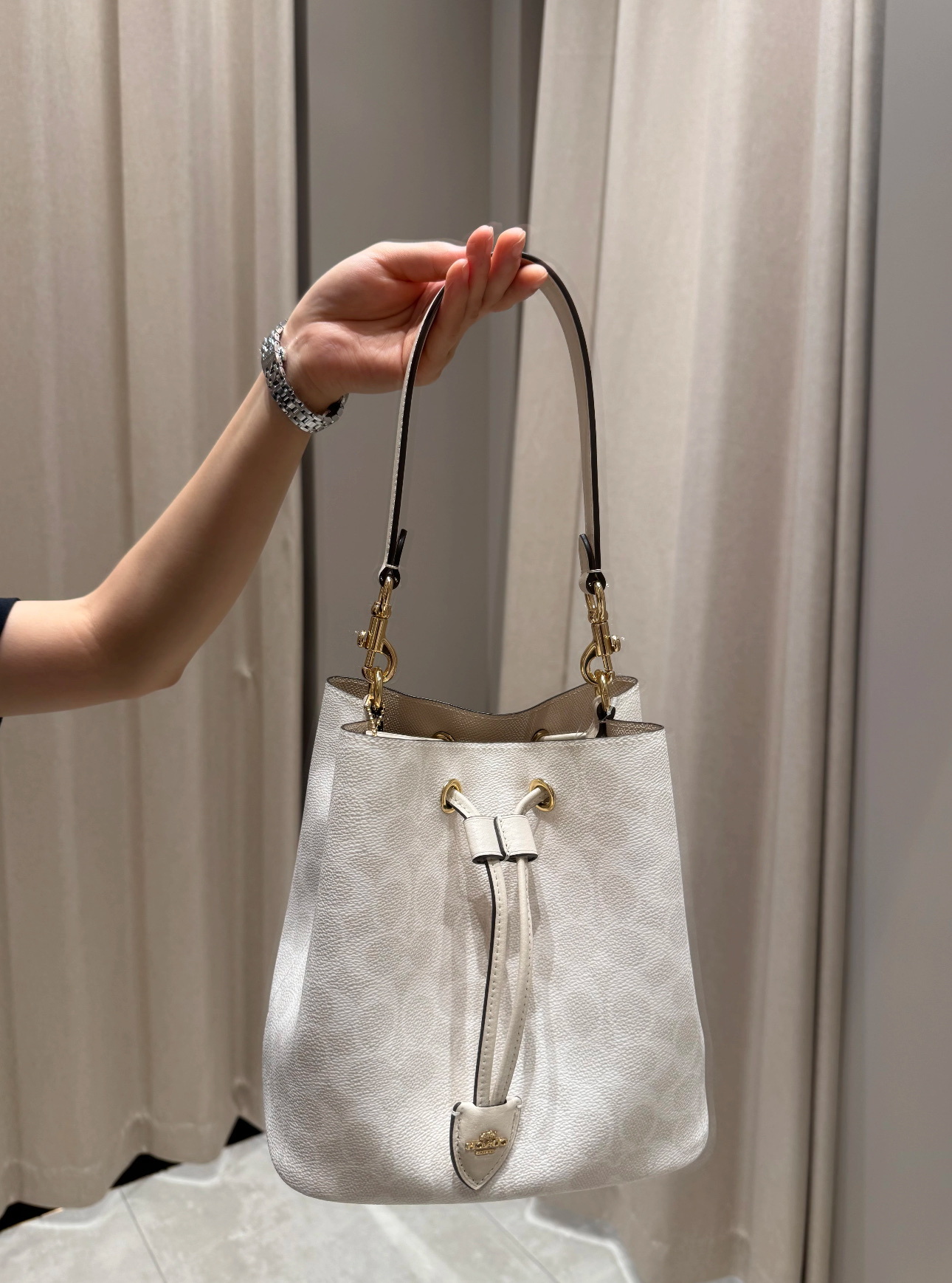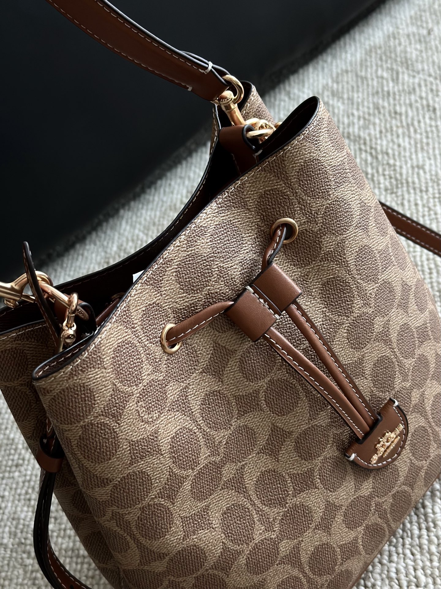 6月新品!蔻驰 CBH07 经典老花Rowan抽绳水桶包 子母包搭配可拆卸长短带,可手提腋下单肩斜挎多功能用法,可拆卸拉链手包、中央开放式隔层,抽绳设计开口 ,今天的价格买到就是赚到,摸着都是一种享受!!这种细节一看就知道大厂工艺!coa在我这就是口碑!买过的都知道品质!这款包真的是集时尚与实用于一身,老花复古又百搭,而且款式设计很别致,包身采用柔软的皮质材料,触感舒适且耐用,容量也很可观,非常适合日常出行使用! 尺寸约:长21cm x 高21cm x 宽14cm