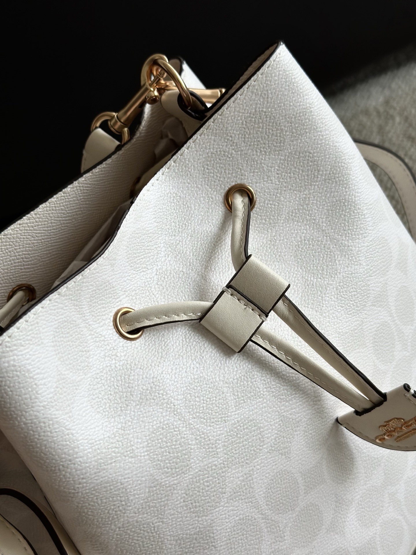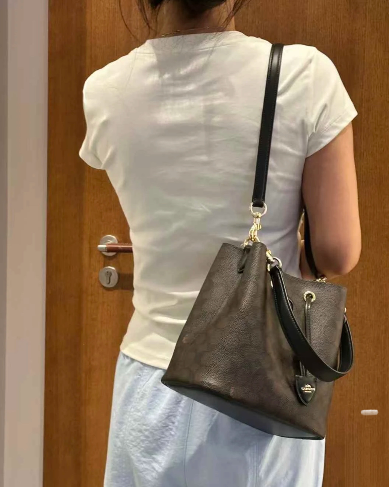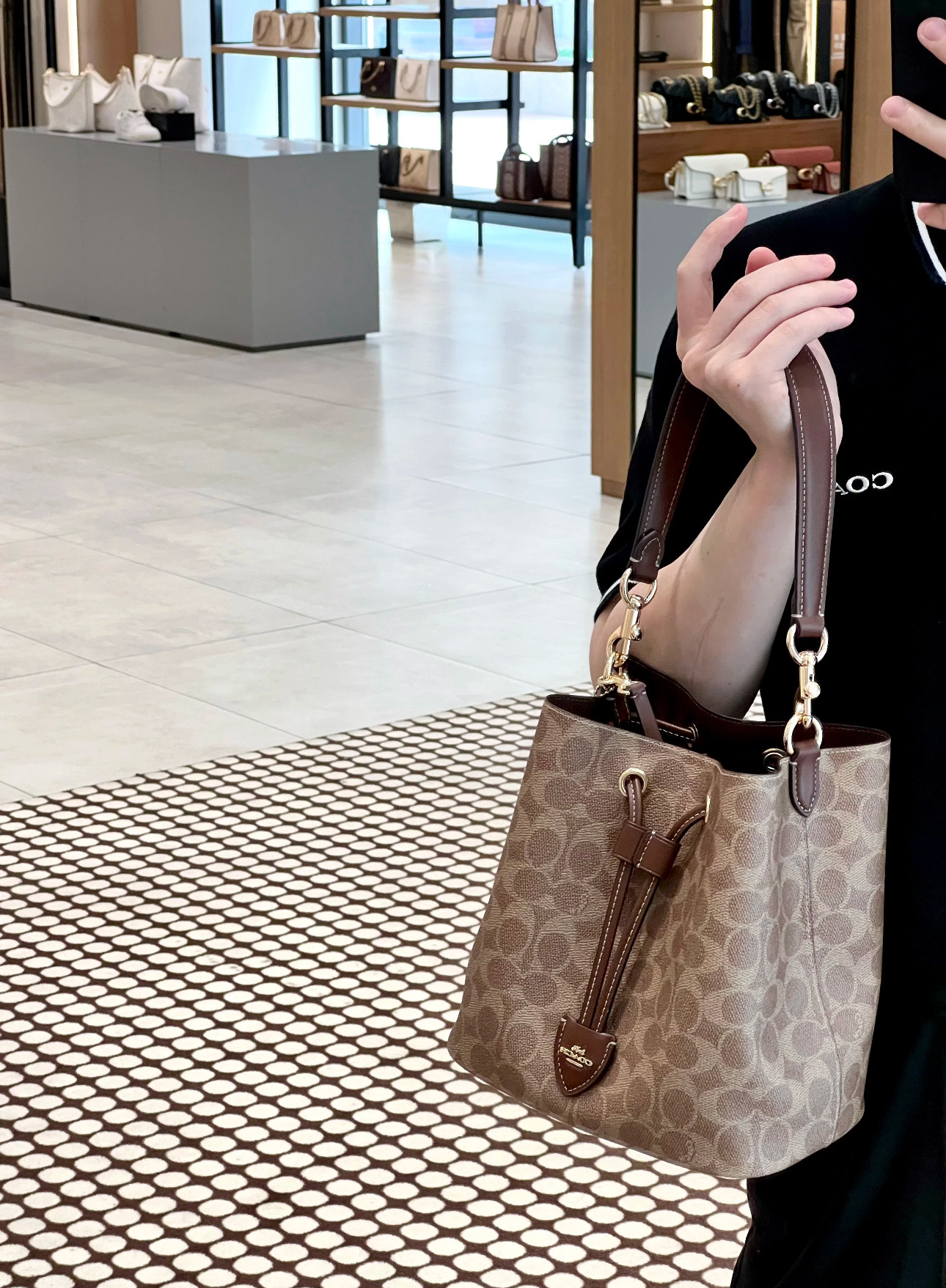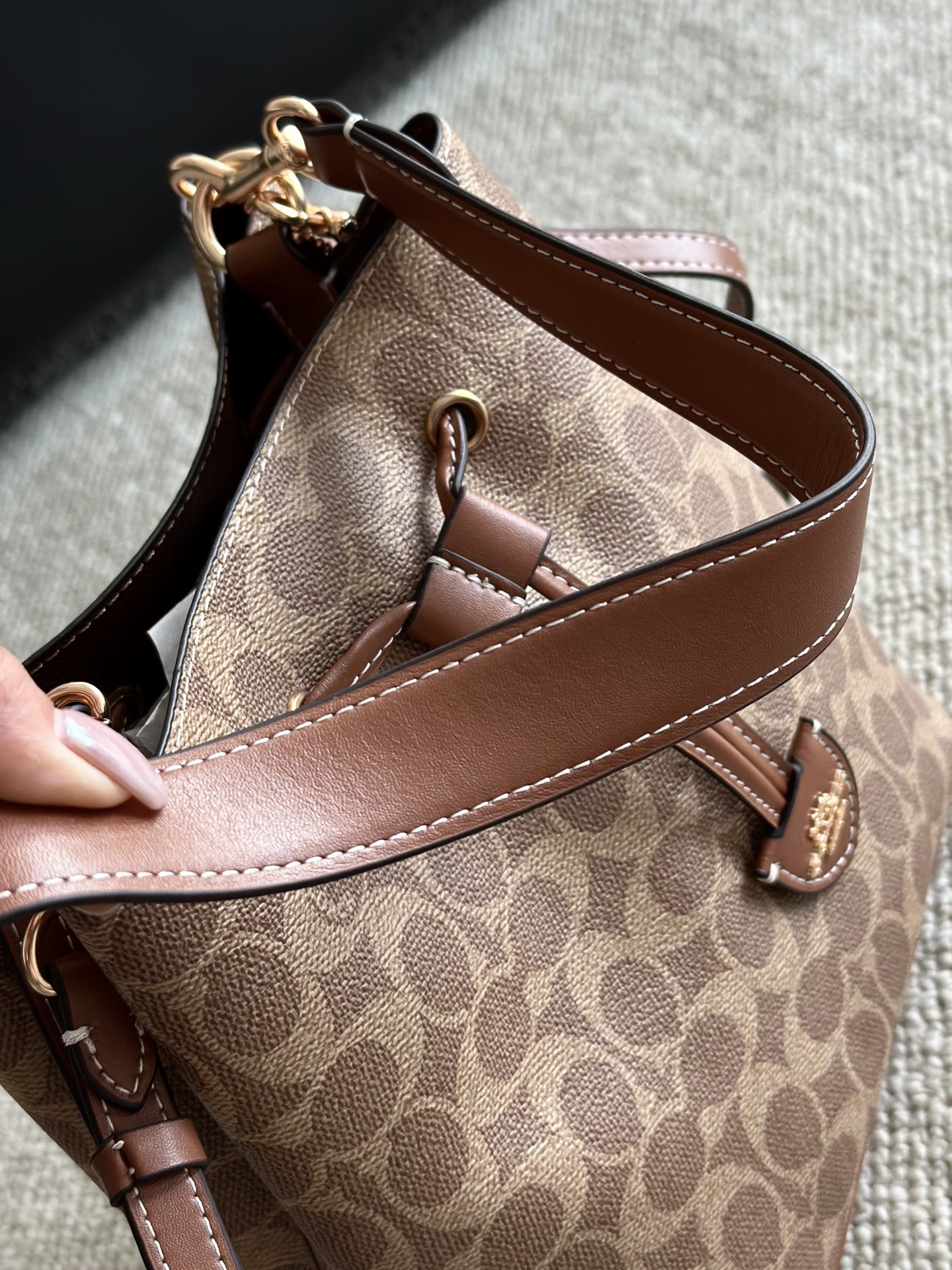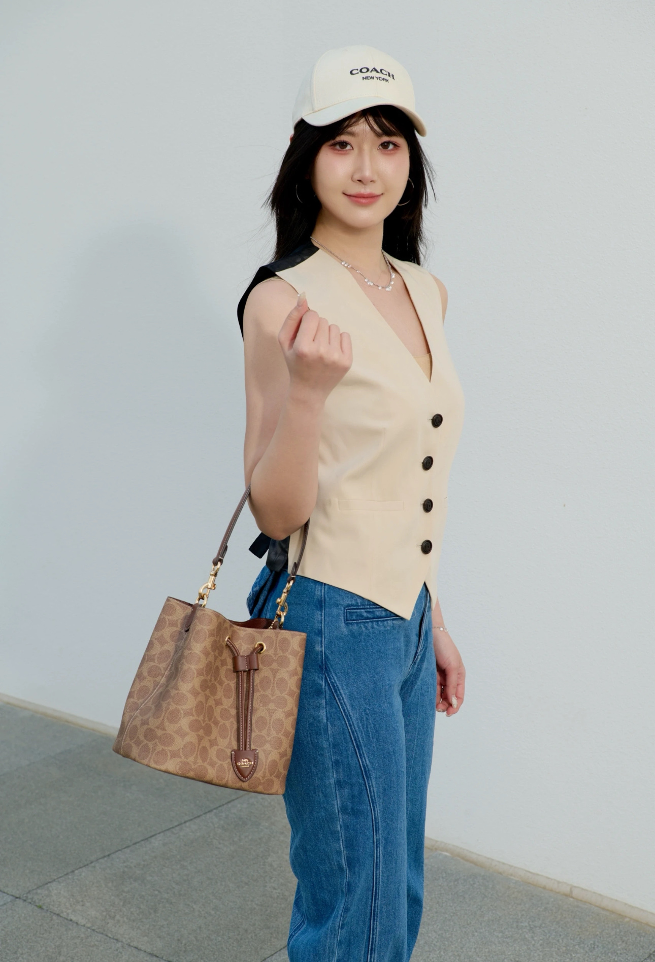 6月新品!蔻驰 CBH07 经典老花Rowan抽绳水桶包 子母包搭配可拆卸长短带,可手提腋下单肩斜挎多功能用法,可拆卸拉链手包、中央开放式隔层,抽绳设计开口 ,今天的价格买到就是赚到,摸着都是一种享受!!这种细节一看就知道大厂工艺!coa在我这就是口碑!买过的都知道品质!这款包真的是集时尚与实用于一身,老花复古又百搭,而且款式设计很别致,包身采用柔软的皮质材料,触感舒适且耐用,容量也很可观,非常适合日常出行使用! 尺寸约:长21cm x 高21cm x 宽14cm