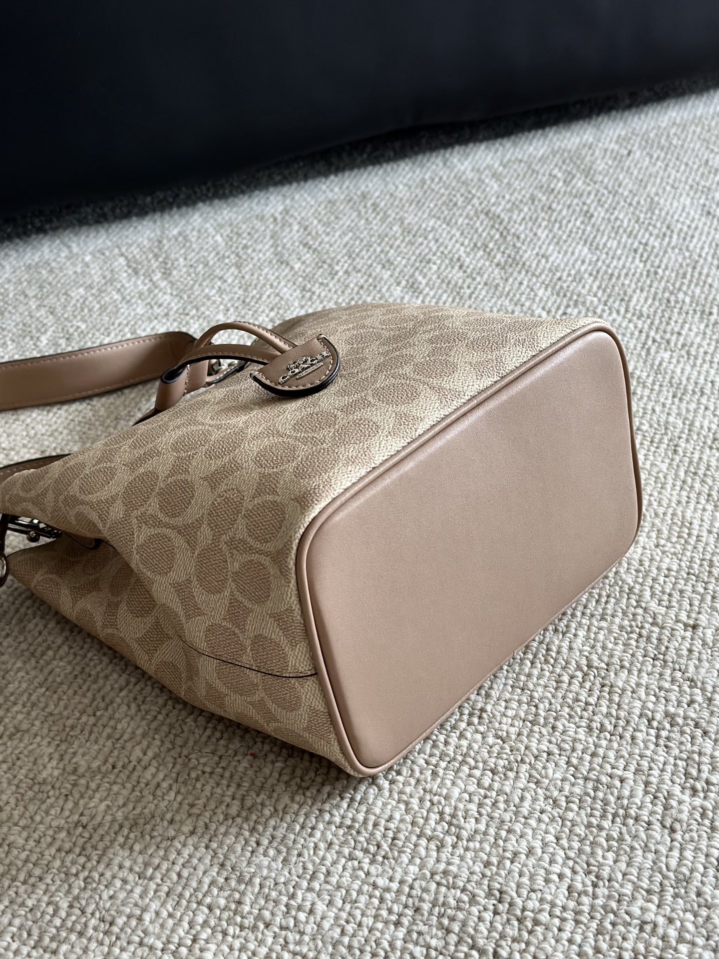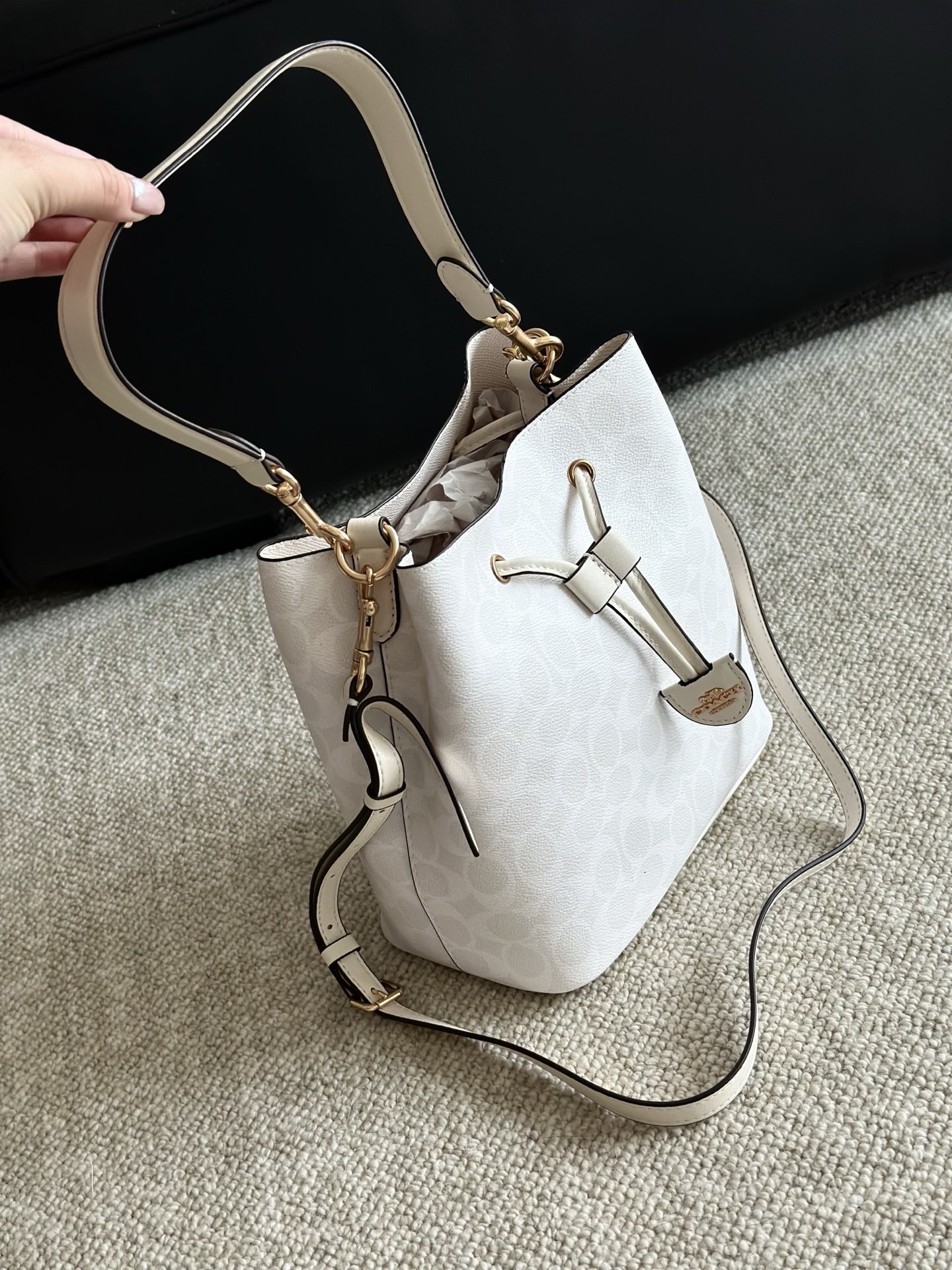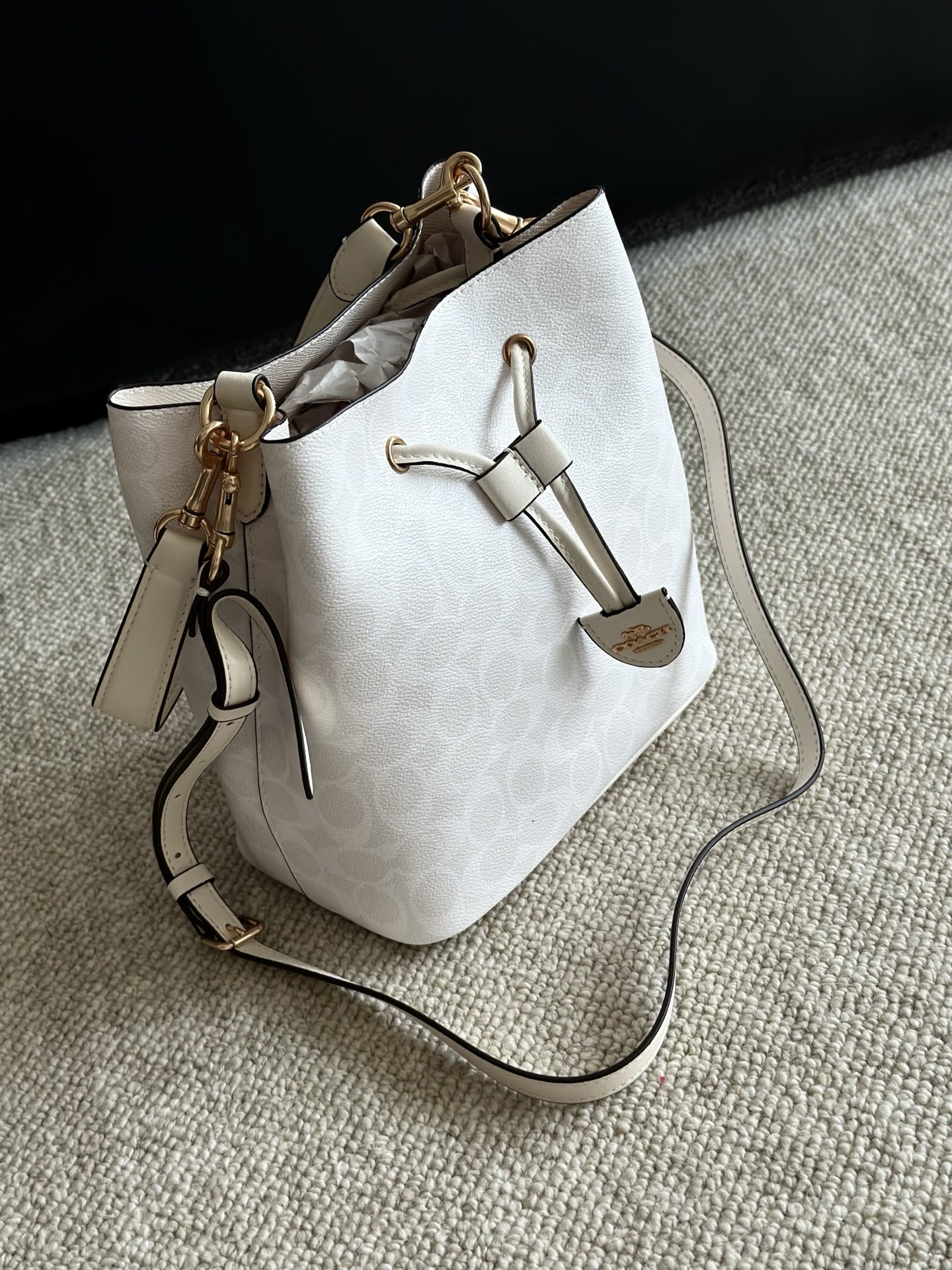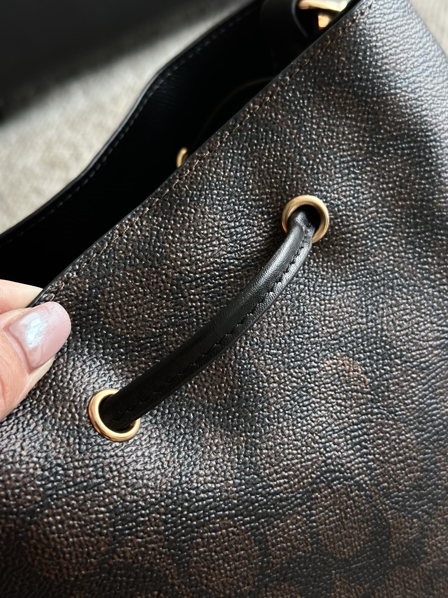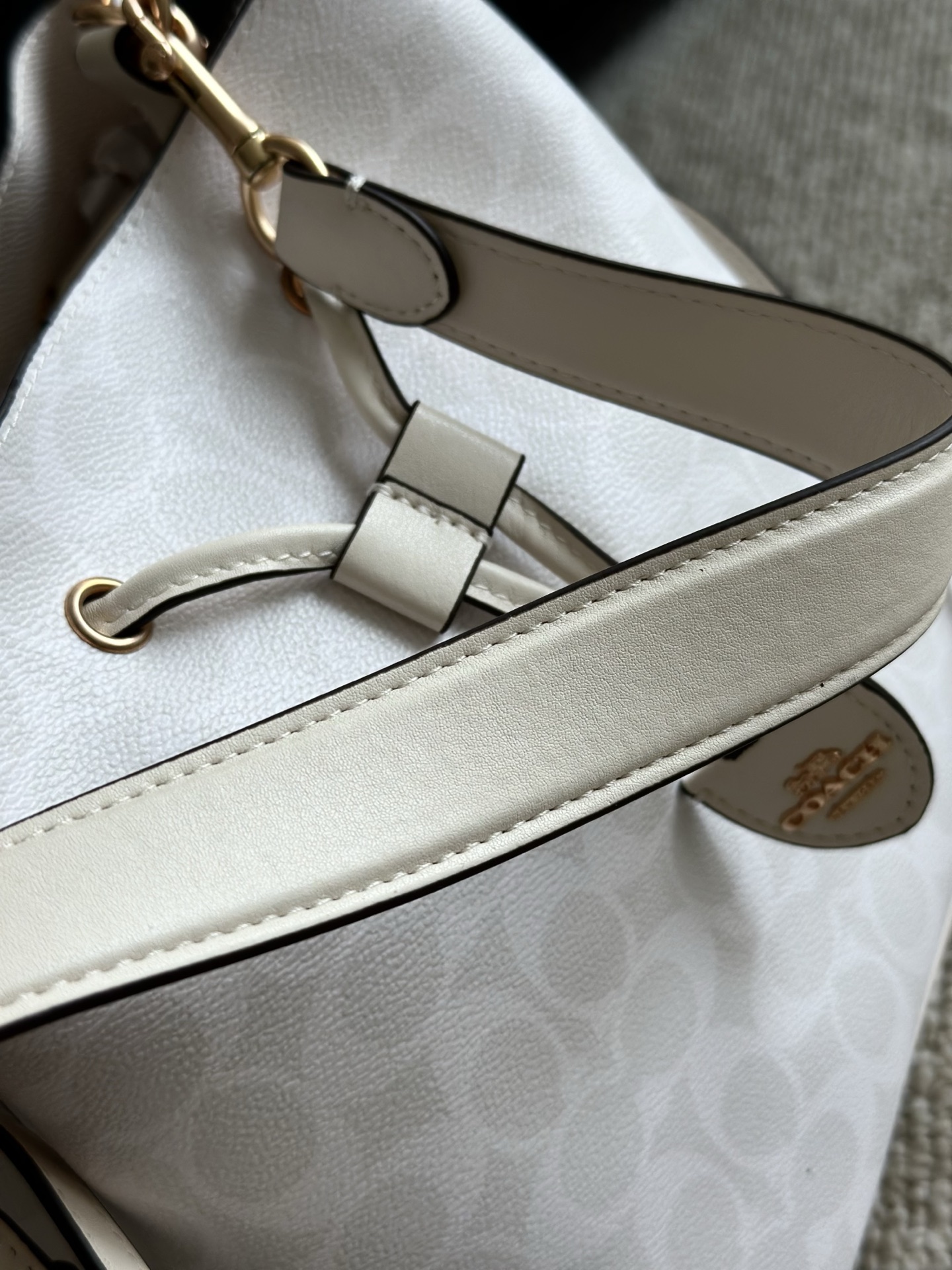6月新品!蔻驰 CBH07 经典老花Rowan抽绳水桶包 子母包搭配可拆卸长短带,可手提腋下单肩斜挎多功能用法,可拆卸拉链手包、中央开放式隔层,抽绳设计开口 ,今天的价格买到就是赚到,摸着都是一种享受!!这种细节一看就知道大厂工艺!coa在我这就是口碑!买过的都知道品质!这款包真的是集时尚与实用于一身,老花复古又百搭,而且款式设计很别致,包身采用柔软的皮质材料,触感舒适且耐用,容量也很可观,非常适合日常出行使用! 尺寸约:长21cm x 高21cm x 宽14cm