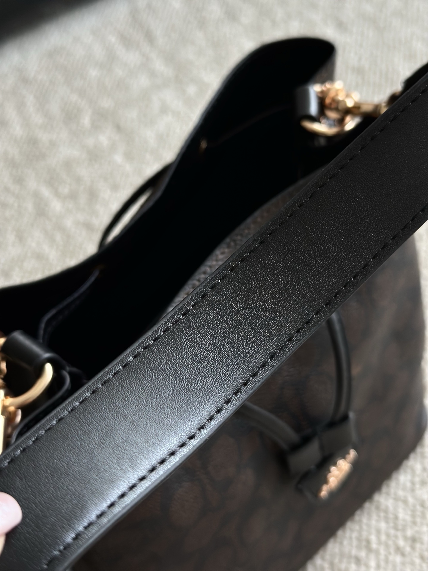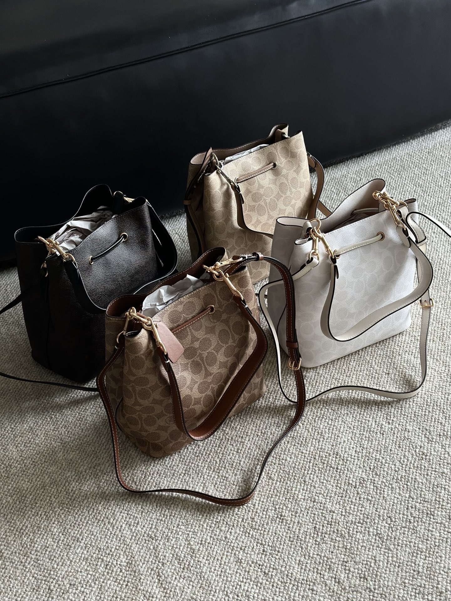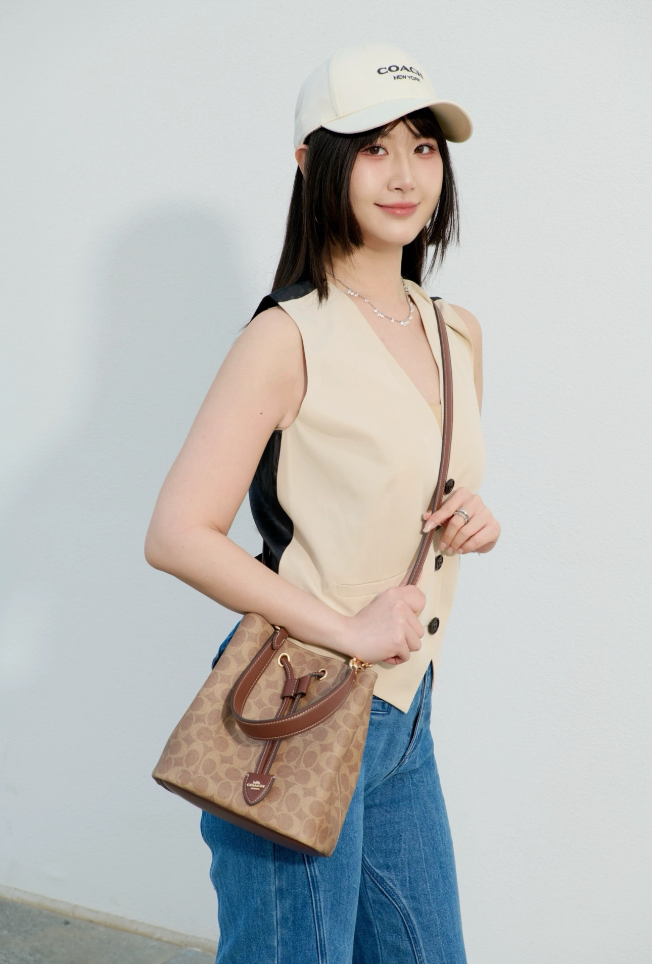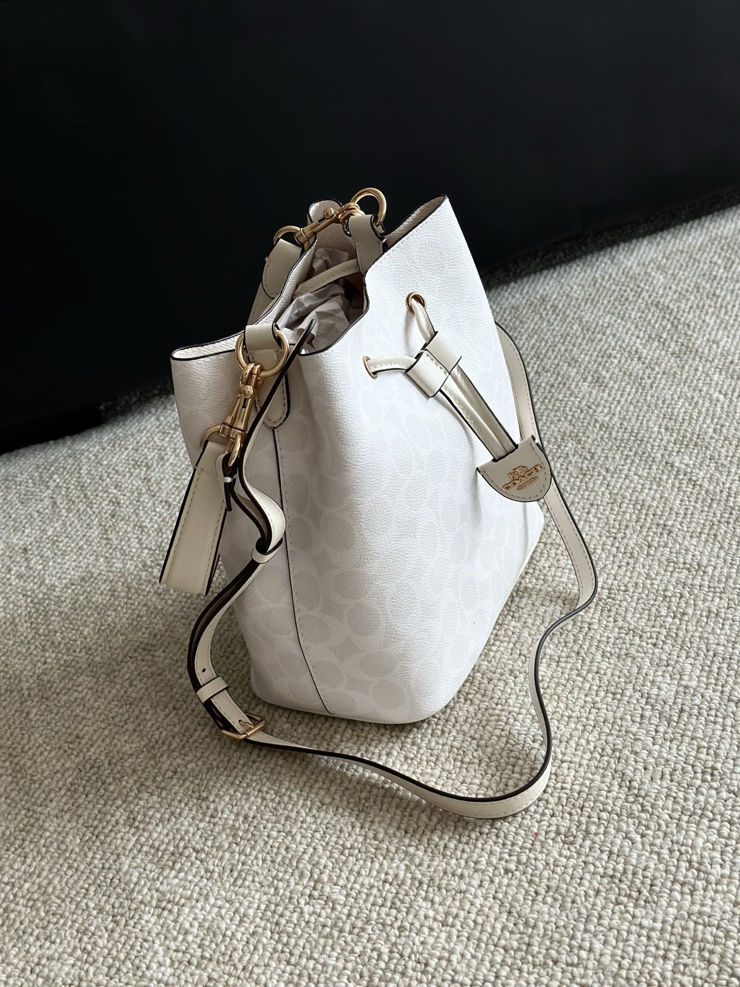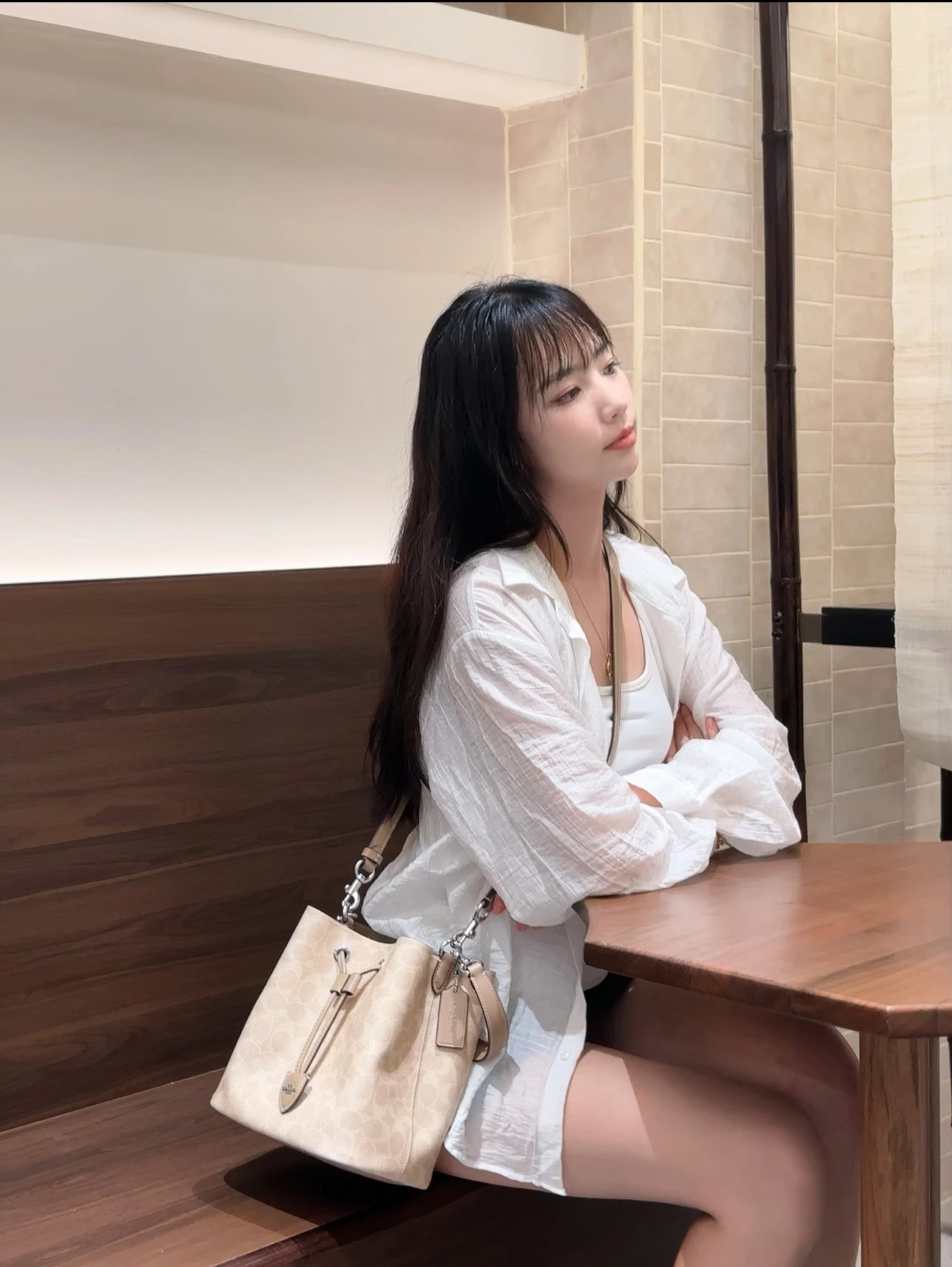 6月新品!蔻驰 CBH07 经典老花Rowan抽绳水桶包 子母包搭配可拆卸长短带,可手提腋下单肩斜挎多功能用法,可拆卸拉链手包、中央开放式隔层,抽绳设计开口 ,今天的价格买到就是赚到,摸着都是一种享受!!这种细节一看就知道大厂工艺!coa在我这就是口碑!买过的都知道品质!这款包真的是集时尚与实用于一身,老花复古又百搭,而且款式设计很别致,包身采用柔软的皮质材料,触感舒适且耐用,容量也很可观,非常适合日常出行使用! 尺寸约:长21cm x 高21cm x 宽14cm