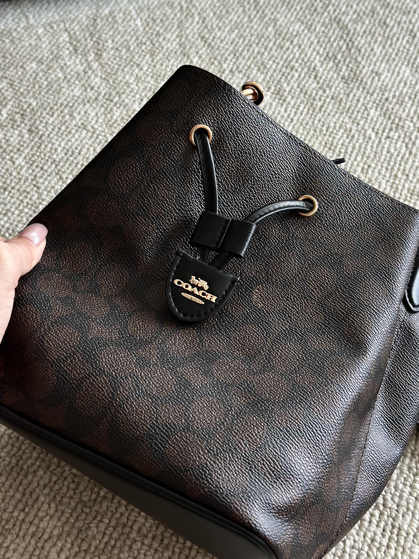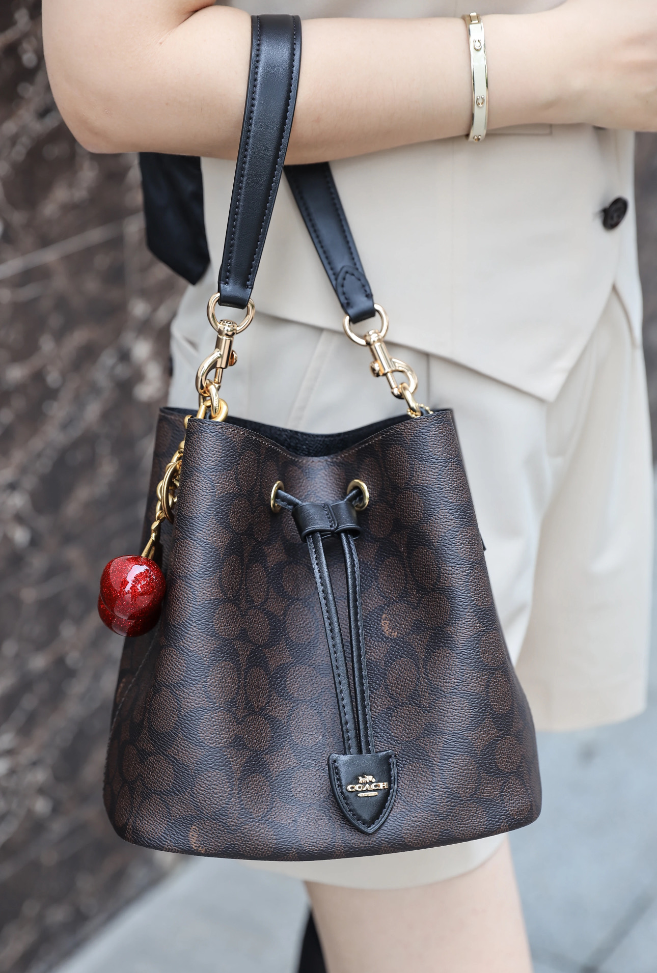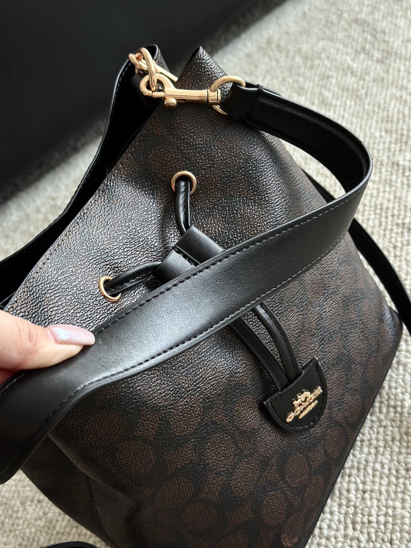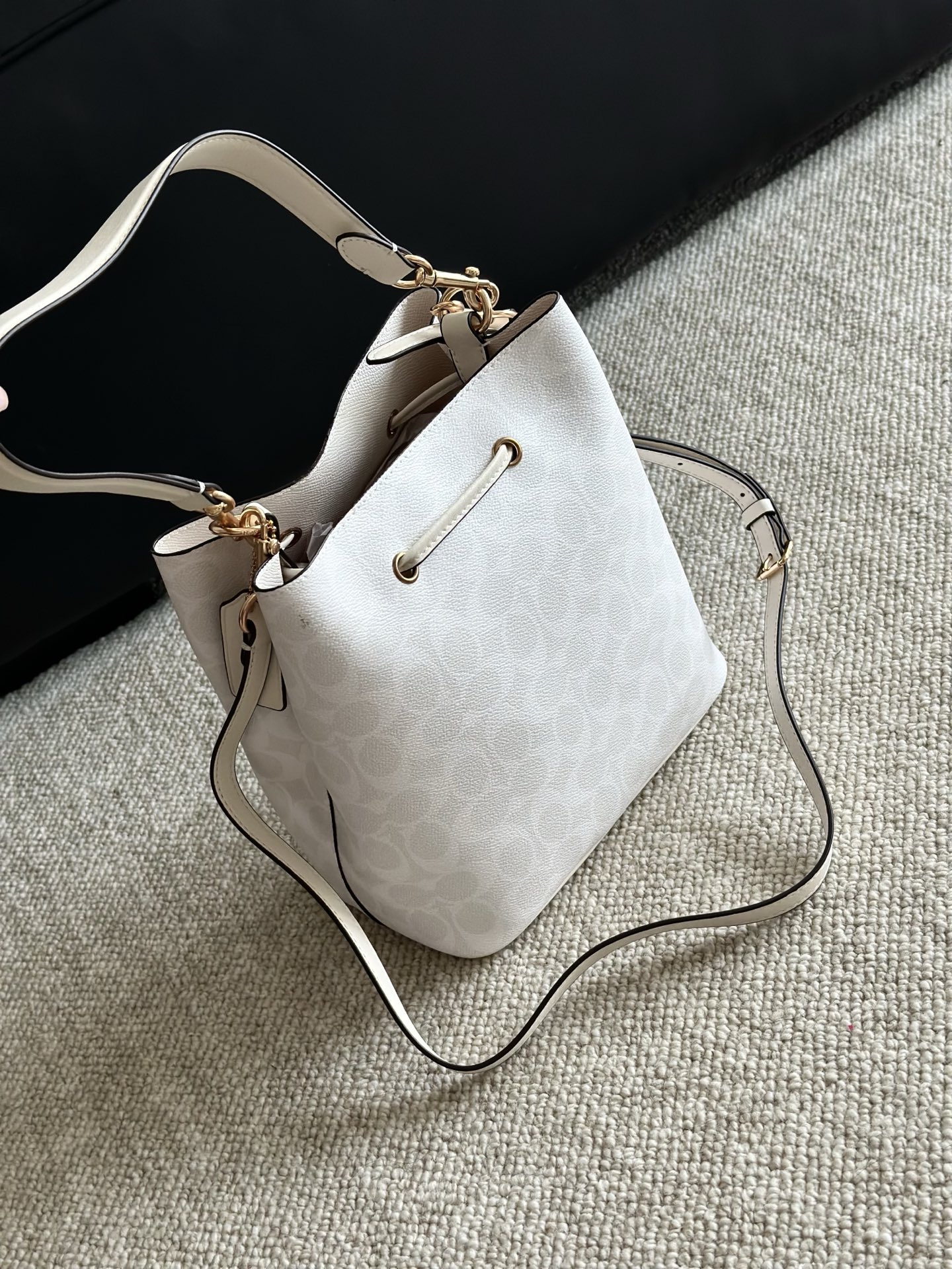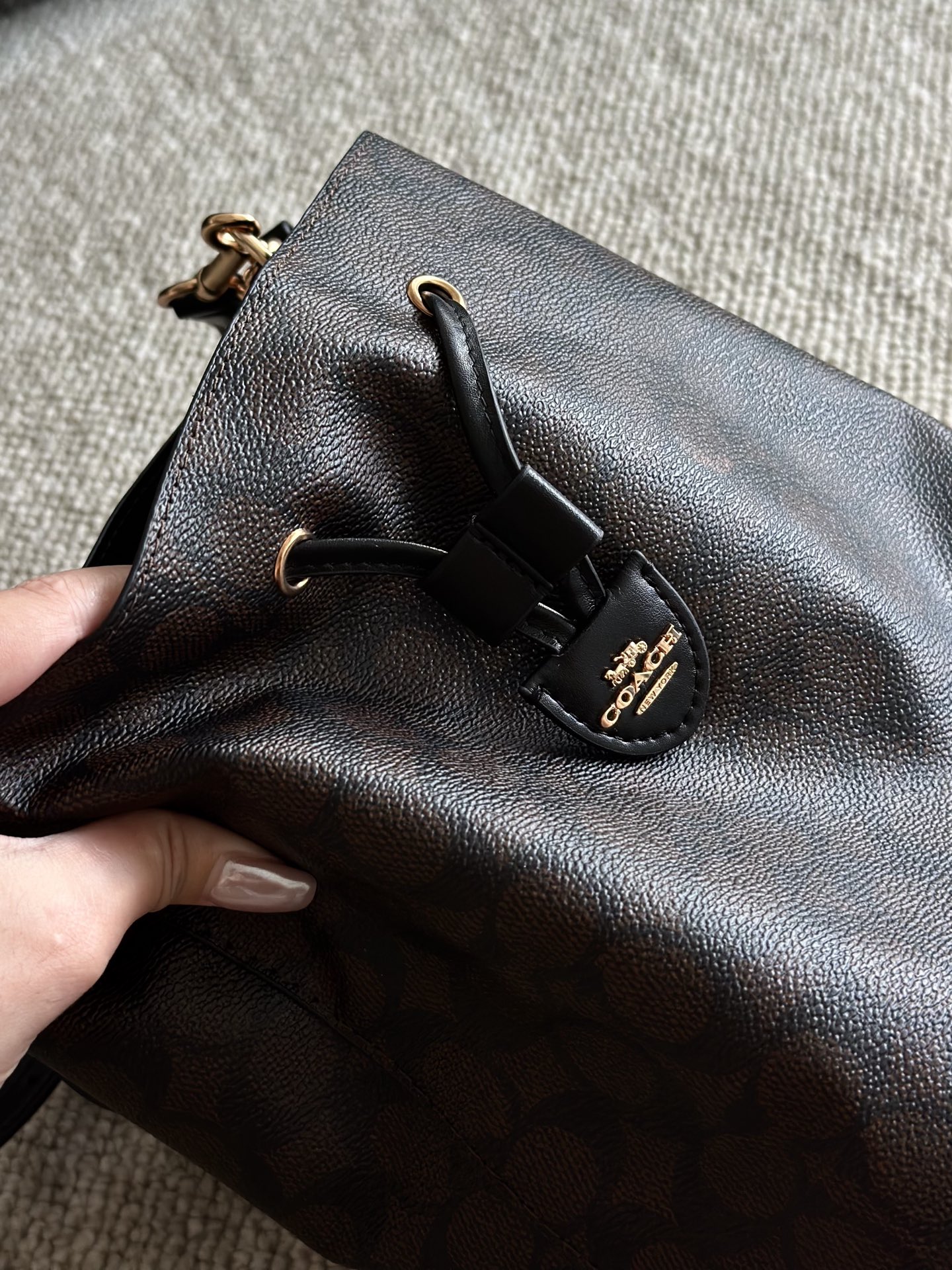 6月新品!蔻驰 CBH07 经典老花Rowan抽绳水桶包 子母包搭配可拆卸长短带,可手提腋下单肩斜挎多功能用法,可拆卸拉链手包、中央开放式隔层,抽绳设计开口 ,今天的价格买到就是赚到,摸着都是一种享受!!这种细节一看就知道大厂工艺!coa在我这就是口碑!买过的都知道品质!这款包真的是集时尚与实用于一身,老花复古又百搭,而且款式设计很别致,包身采用柔软的皮质材料,触感舒适且耐用,容量也很可观,非常适合日常出行使用! 尺寸约:长21cm x 高21cm x 宽14cm