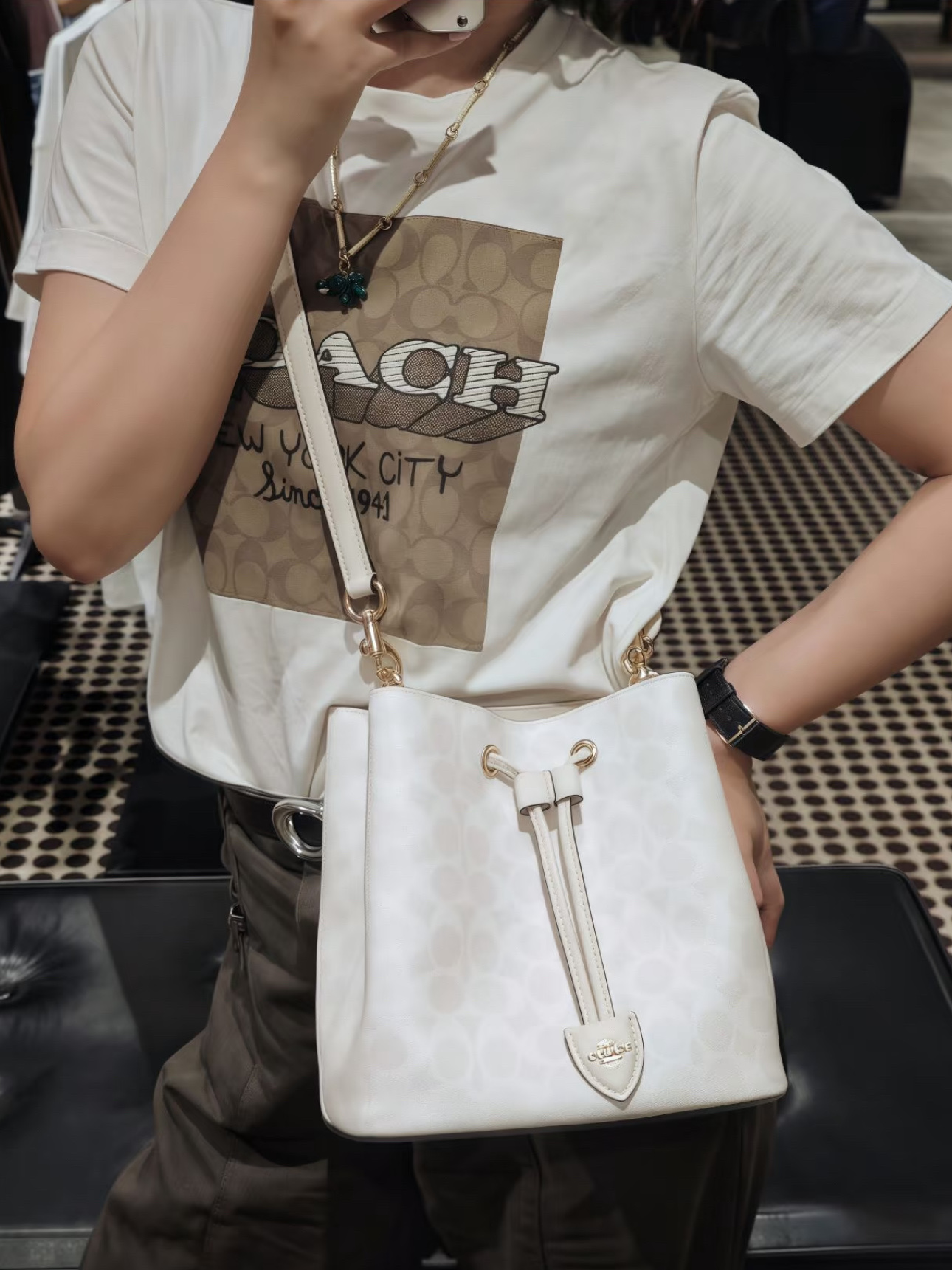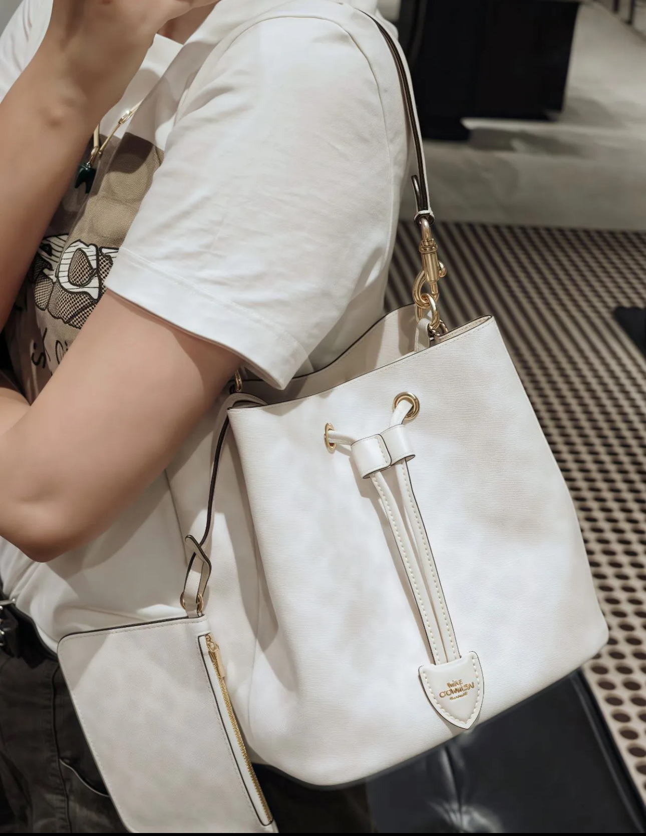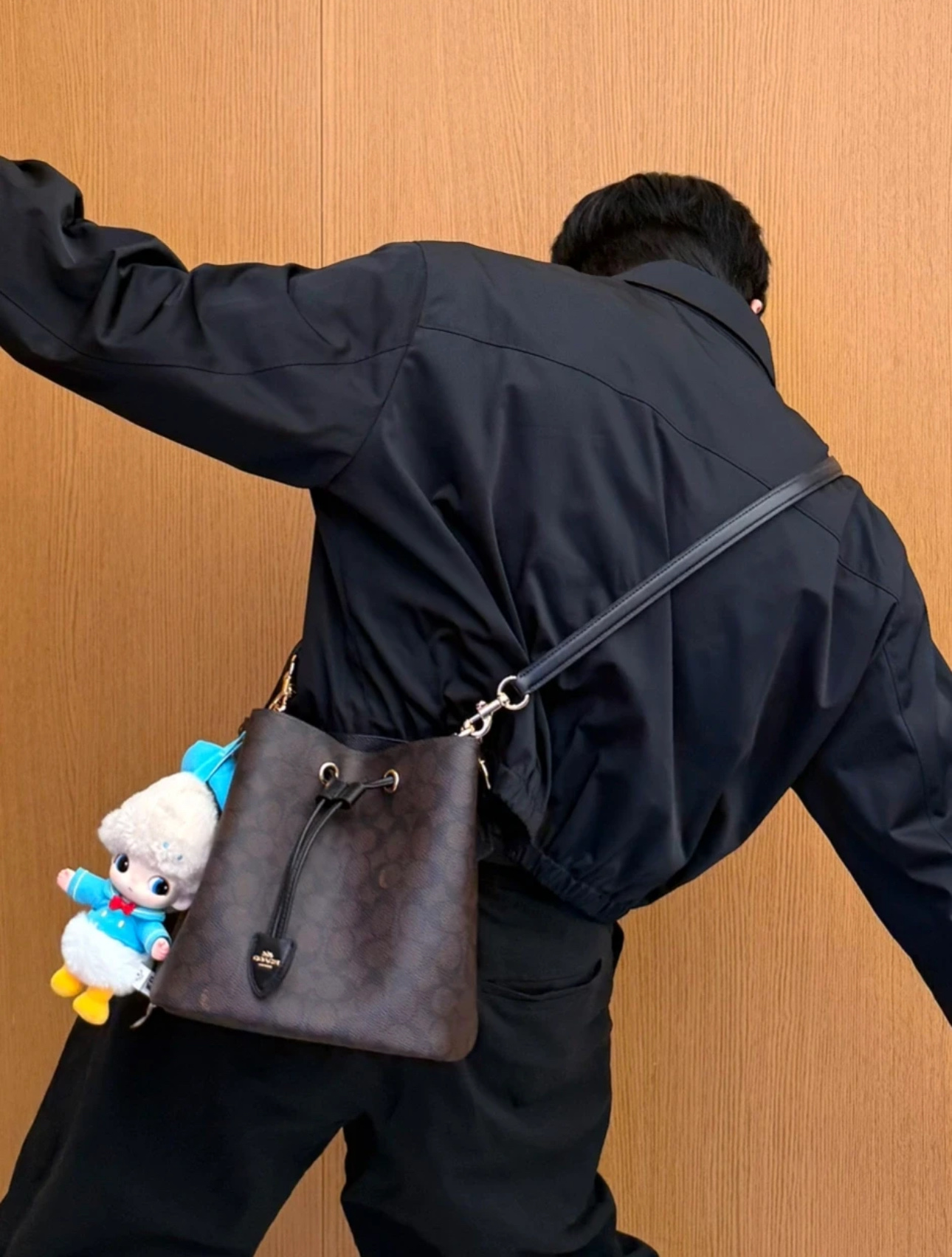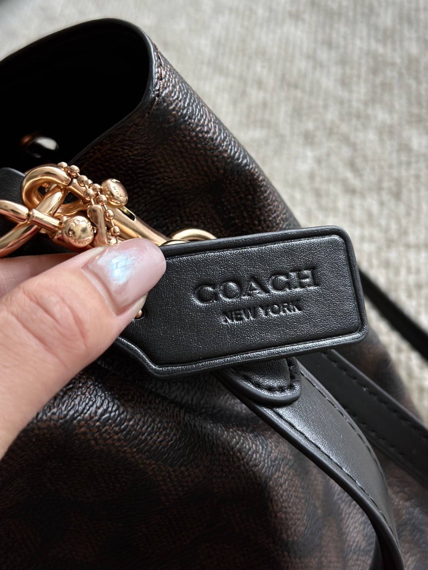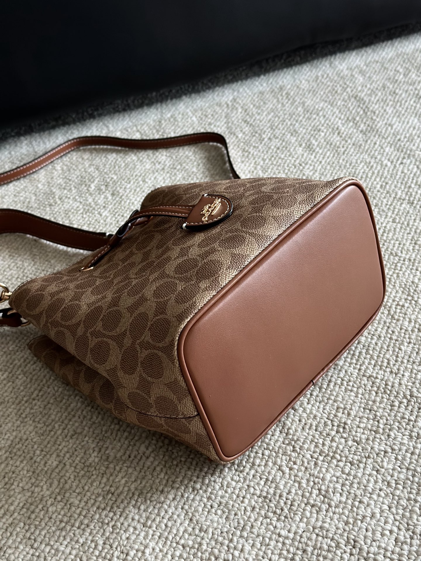 6月新品!蔻驰 CBH07 经典老花Rowan抽绳水桶包 子母包搭配可拆卸长短带,可手提腋下单肩斜挎多功能用法,可拆卸拉链手包、中央开放式隔层,抽绳设计开口 ,今天的价格买到就是赚到,摸着都是一种享受!!这种细节一看就知道大厂工艺!coa在我这就是口碑!买过的都知道品质!这款包真的是集时尚与实用于一身,老花复古又百搭,而且款式设计很别致,包身采用柔软的皮质材料,触感舒适且耐用,容量也很可观,非常适合日常出行使用! 尺寸约:长21cm x 高21cm x 宽14cm