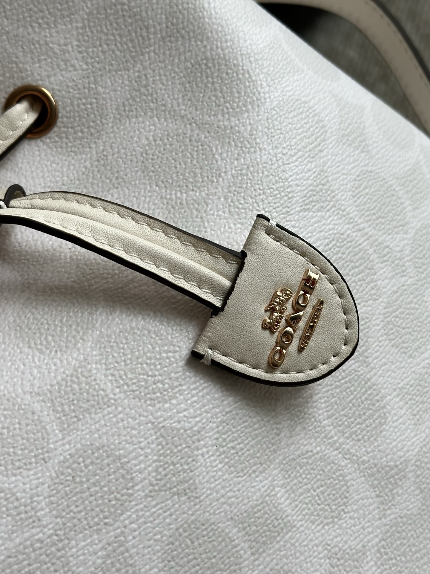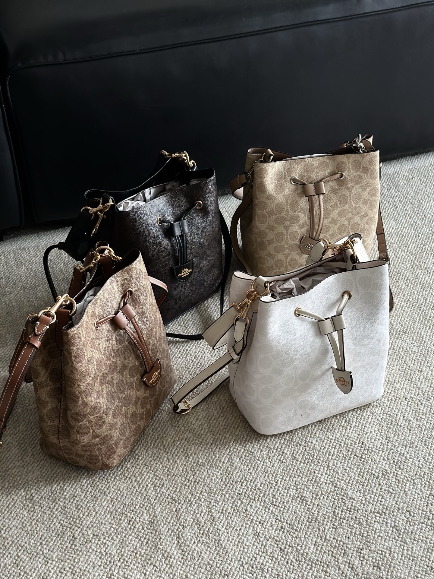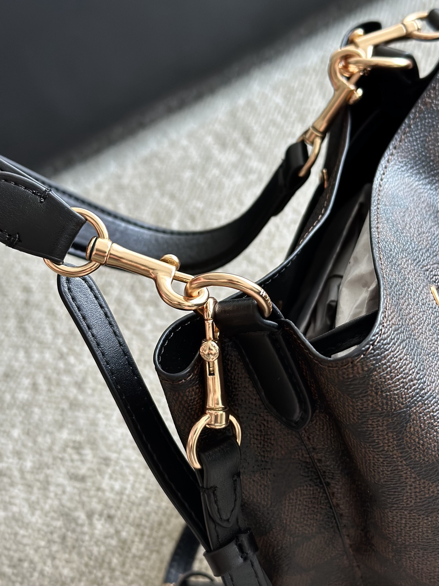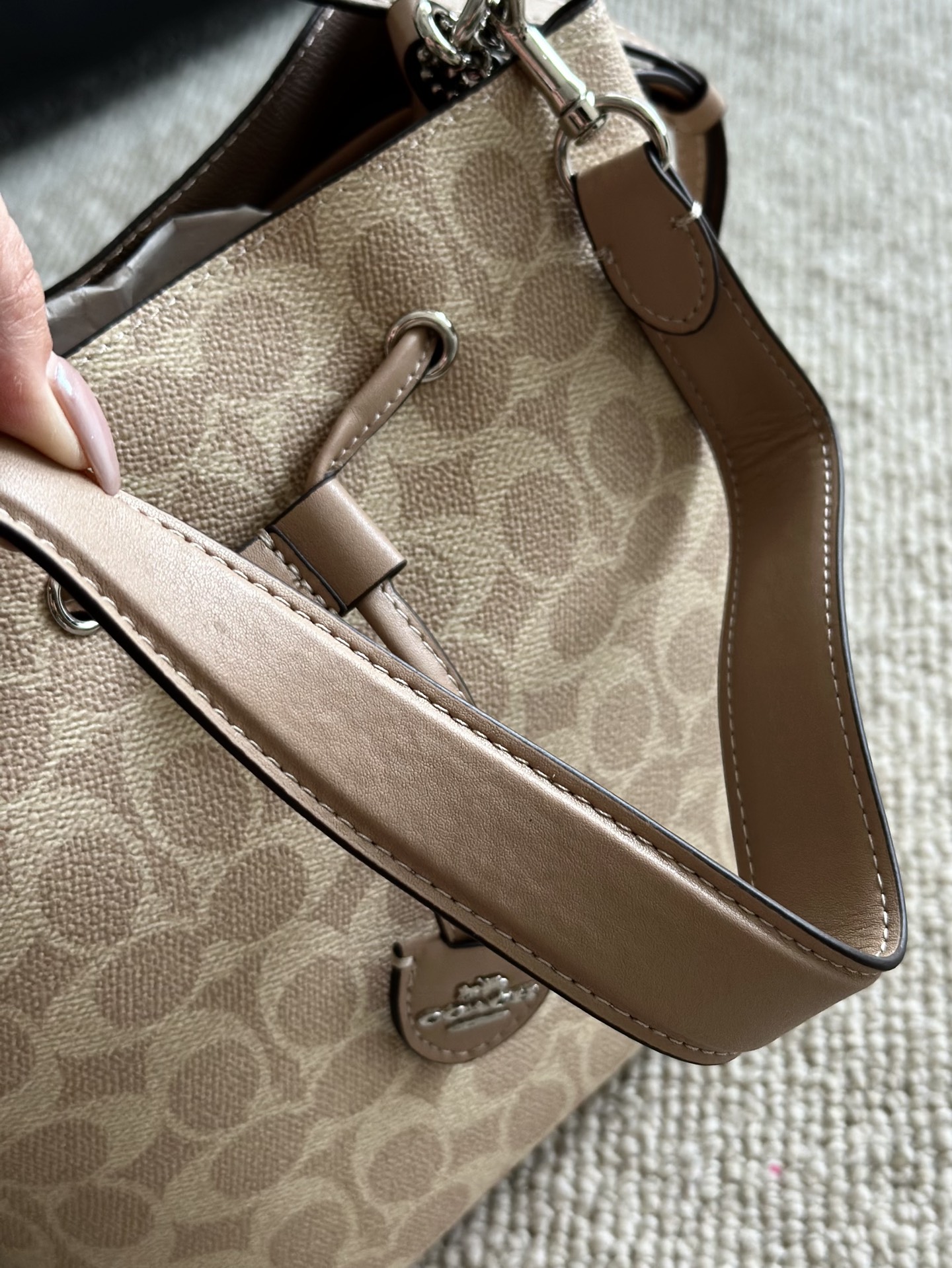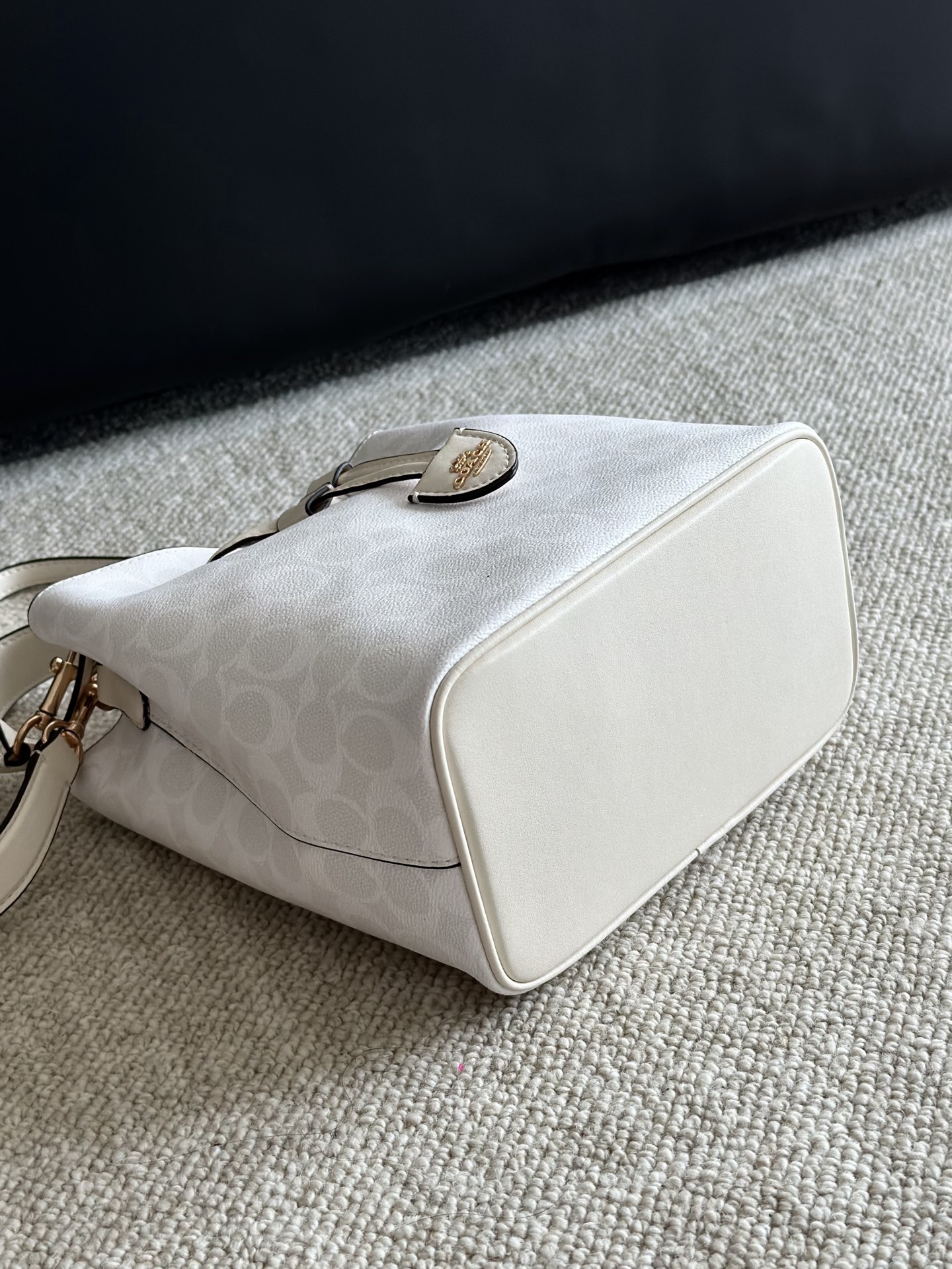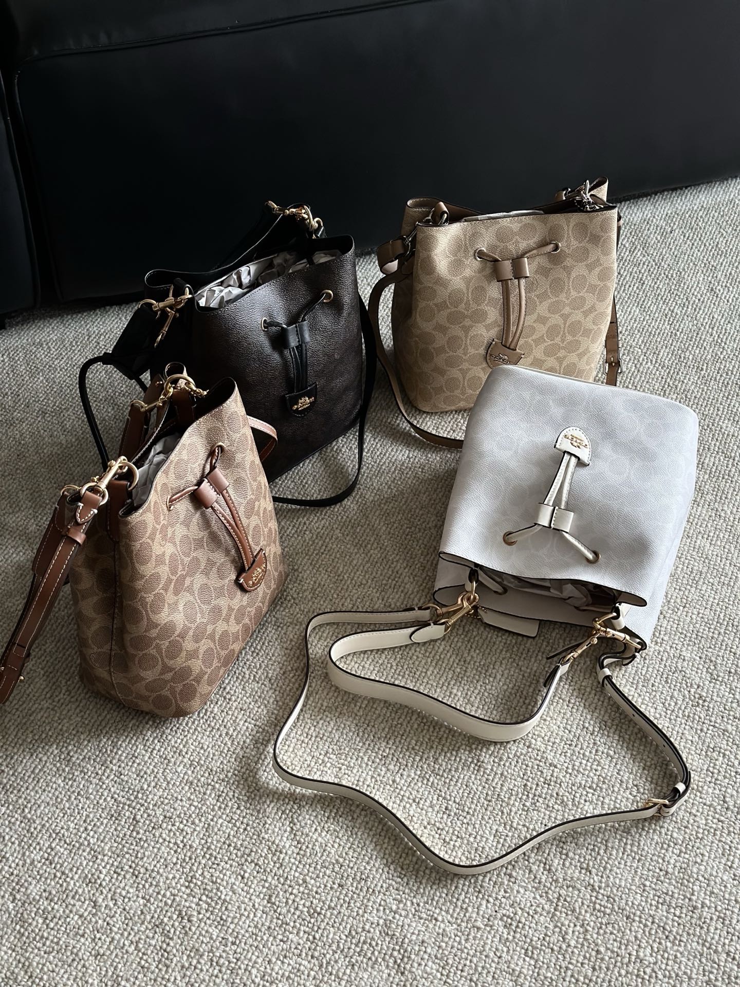 6月新品!蔻驰 CBH07 经典老花Rowan抽绳水桶包 子母包搭配可拆卸长短带,可手提腋下单肩斜挎多功能用法,可拆卸拉链手包、中央开放式隔层,抽绳设计开口 ,今天的价格买到就是赚到,摸着都是一种享受!!这种细节一看就知道大厂工艺!coa在我这就是口碑!买过的都知道品质!这款包真的是集时尚与实用于一身,老花复古又百搭,而且款式设计很别致,包身采用柔软的皮质材料,触感舒适且耐用,容量也很可观,非常适合日常出行使用! 尺寸约:长21cm x 高21cm x 宽14cm