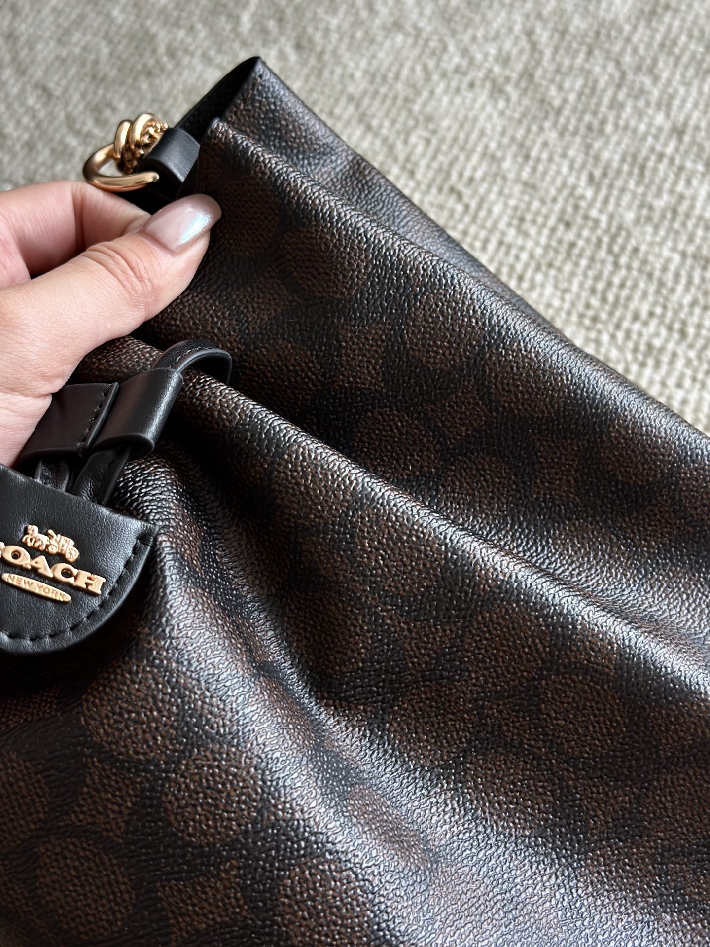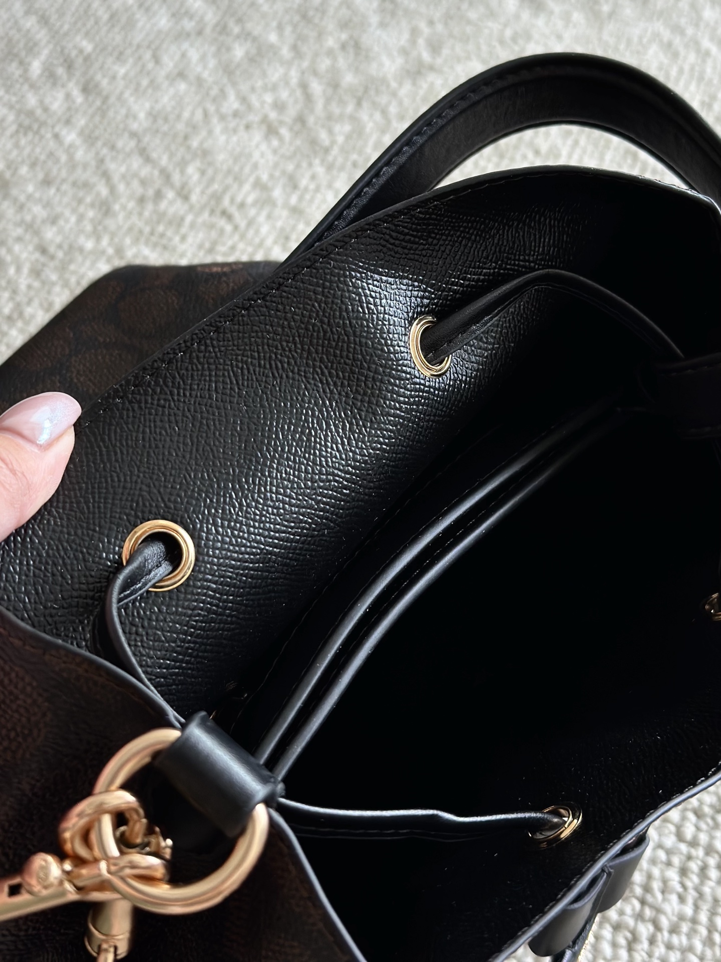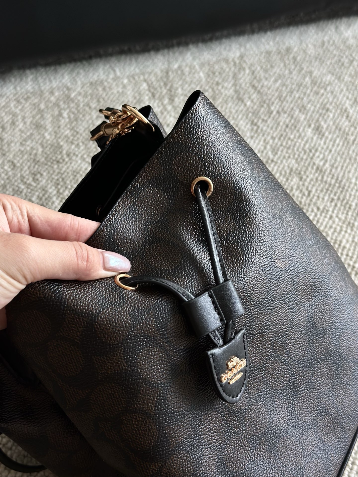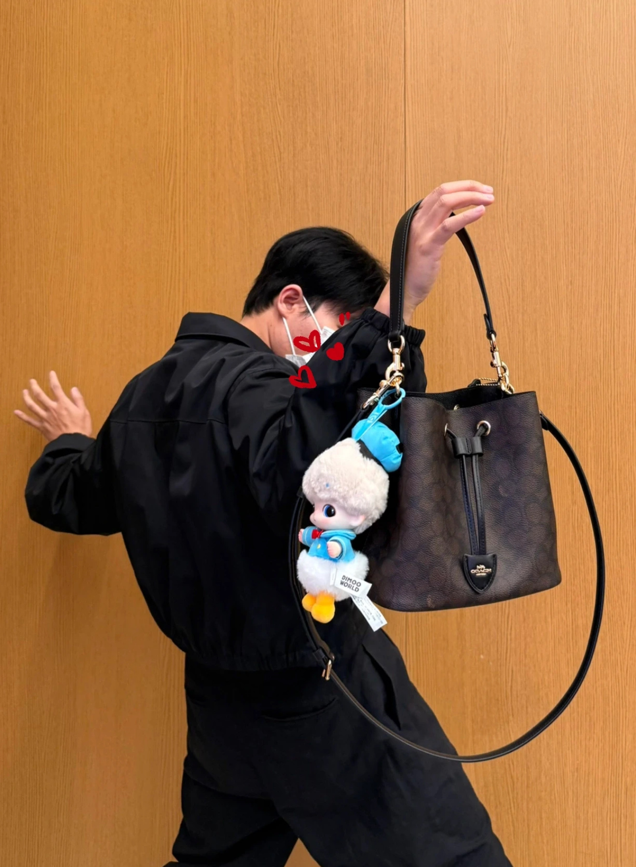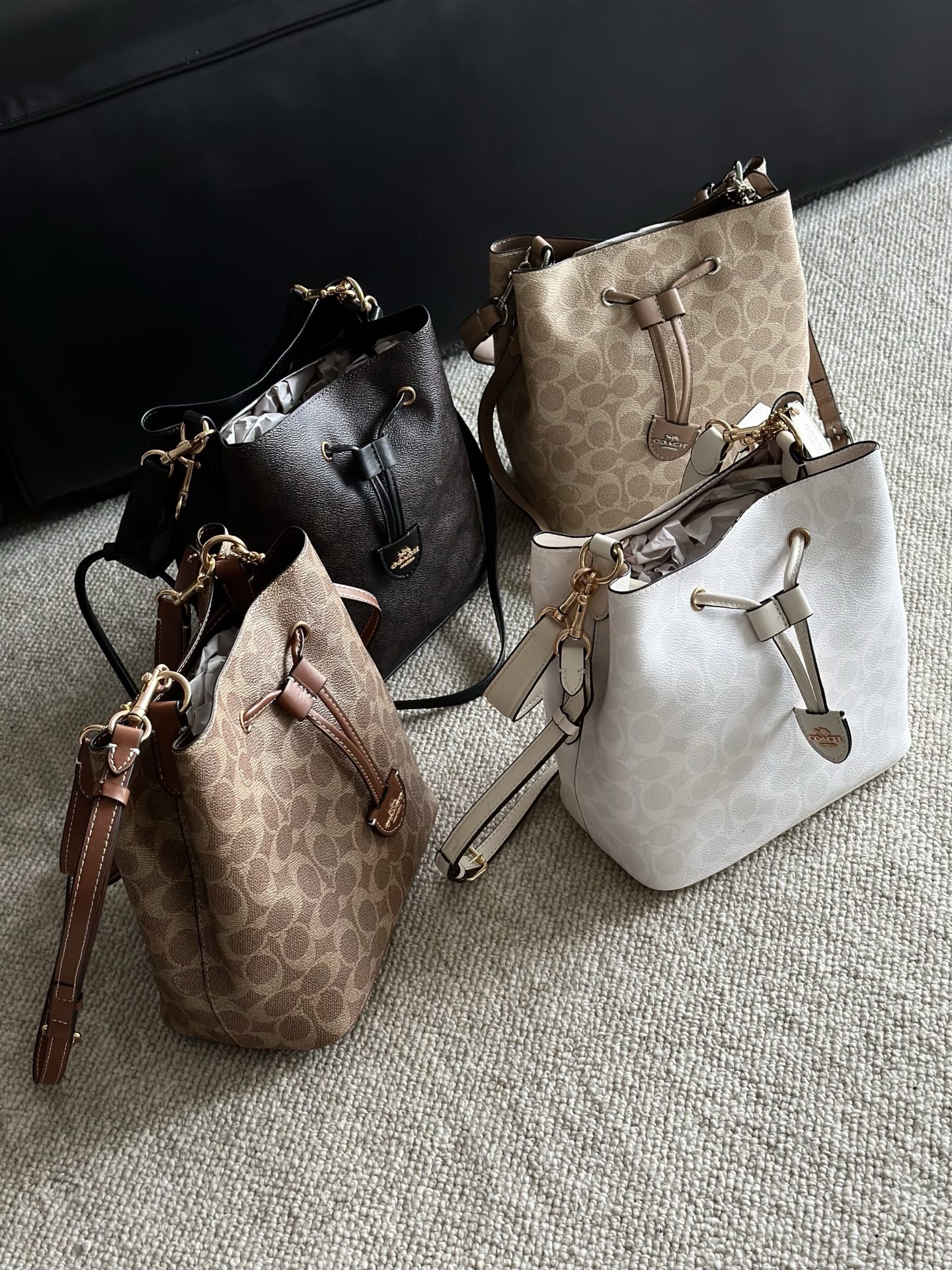6月新品!蔻驰 CBH07 经典老花Rowan抽绳水桶包 子母包搭配可拆卸长短带,可手提腋下单肩斜挎多功能用法,可拆卸拉链手包、中央开放式隔层,抽绳设计开口 ,今天的价格买到就是赚到,摸着都是一种享受!!这种细节一看就知道大厂工艺!coa在我这就是口碑!买过的都知道品质!这款包真的是集时尚与实用于一身,老花复古又百搭,而且款式设计很别致,包身采用柔软的皮质材料,触感舒适且耐用,容量也很可观,非常适合日常出行使用! 尺寸约:长21cm x 高21cm x 宽14cm