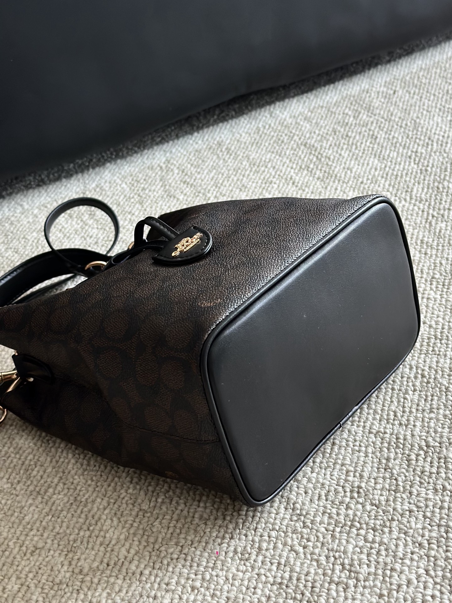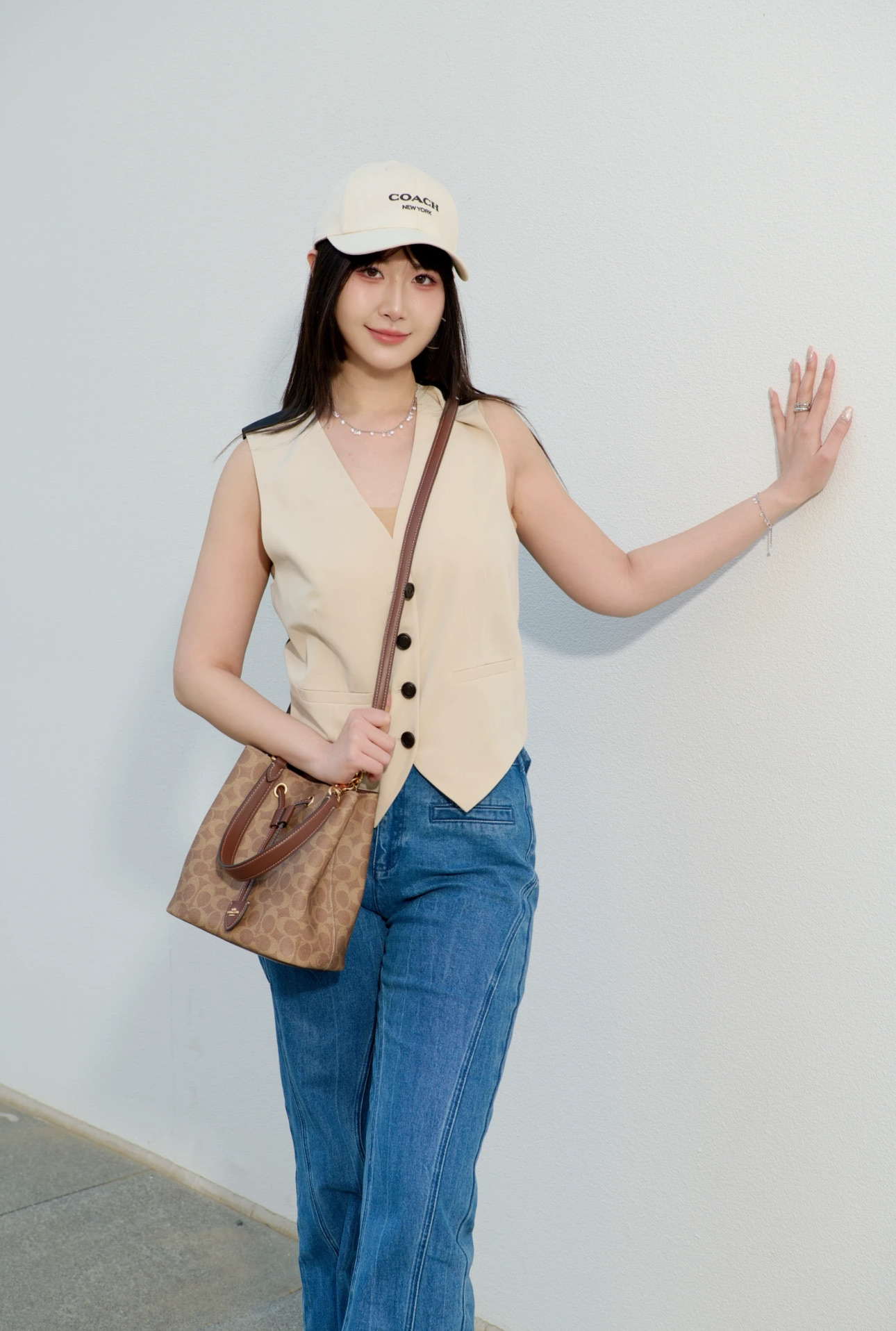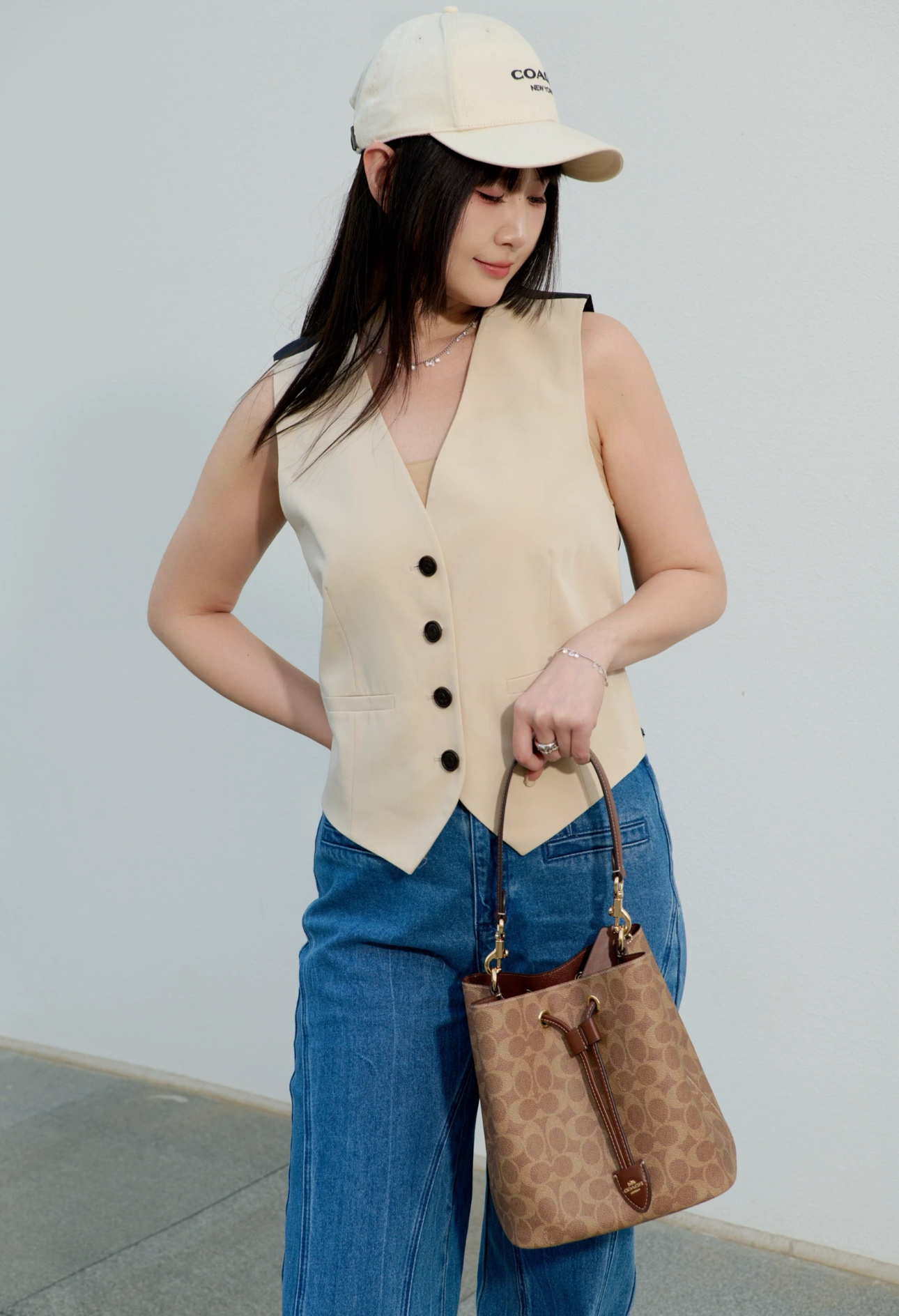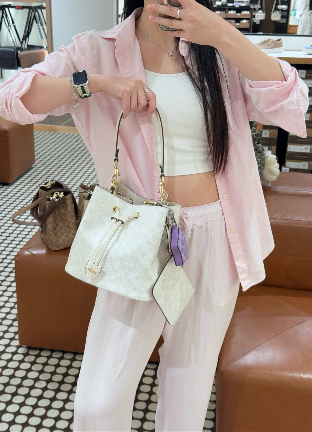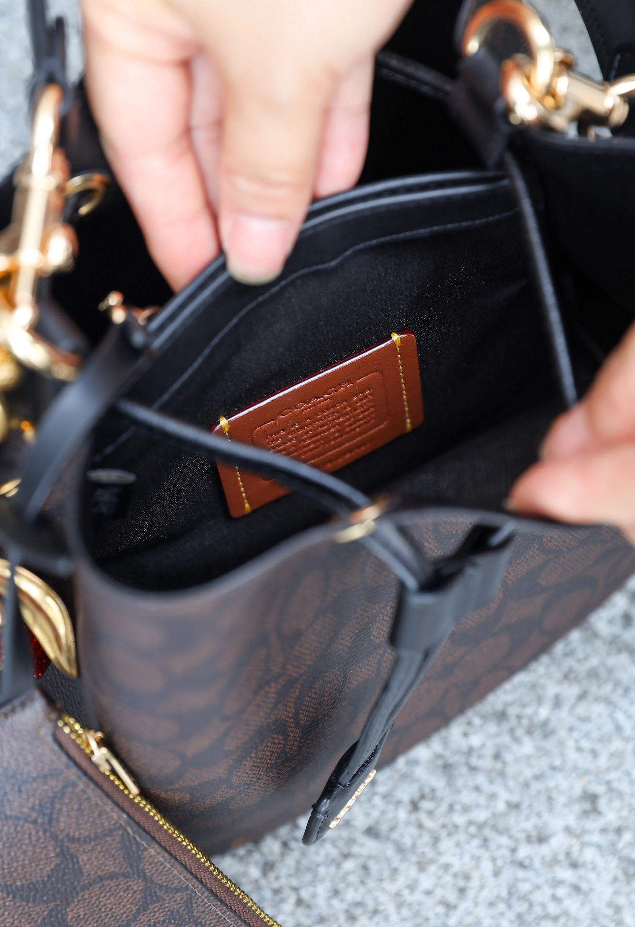 6月新品!蔻驰 CBH07 经典老花Rowan抽绳水桶包 子母包搭配可拆卸长短带,可手提腋下单肩斜挎多功能用法,可拆卸拉链手包、中央开放式隔层,抽绳设计开口 ,今天的价格买到就是赚到,摸着都是一种享受!!这种细节一看就知道大厂工艺!coa在我这就是口碑!买过的都知道品质!这款包真的是集时尚与实用于一身,老花复古又百搭,而且款式设计很别致,包身采用柔软的皮质材料,触感舒适且耐用,容量也很可观,非常适合日常出行使用! 尺寸约:长21cm x 高21cm x 宽14cm
