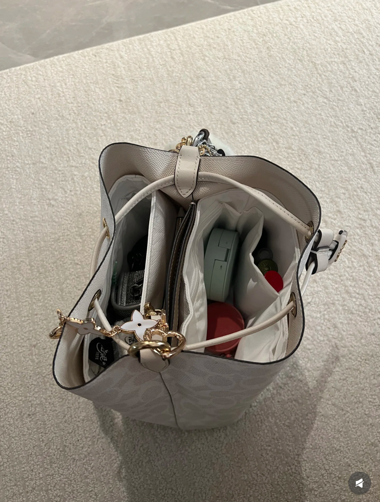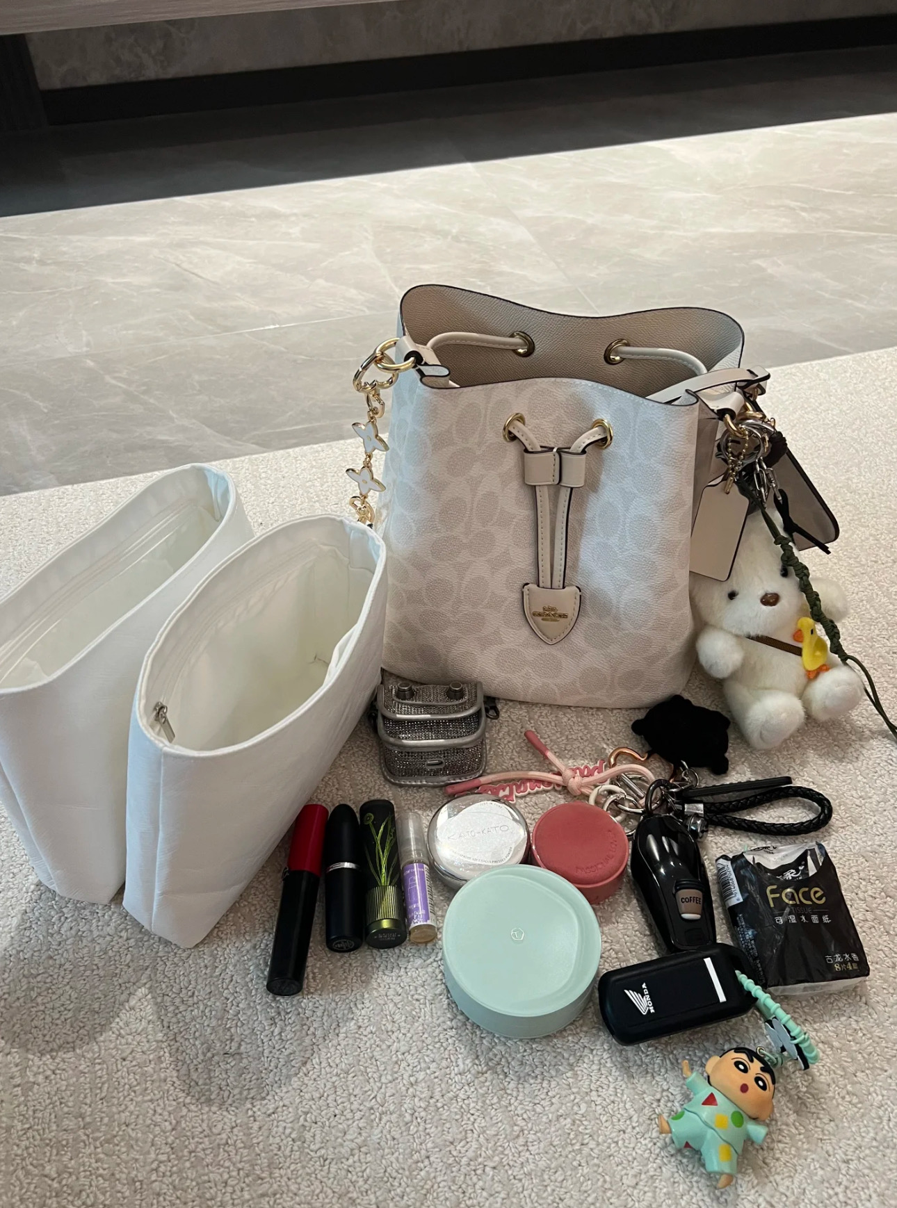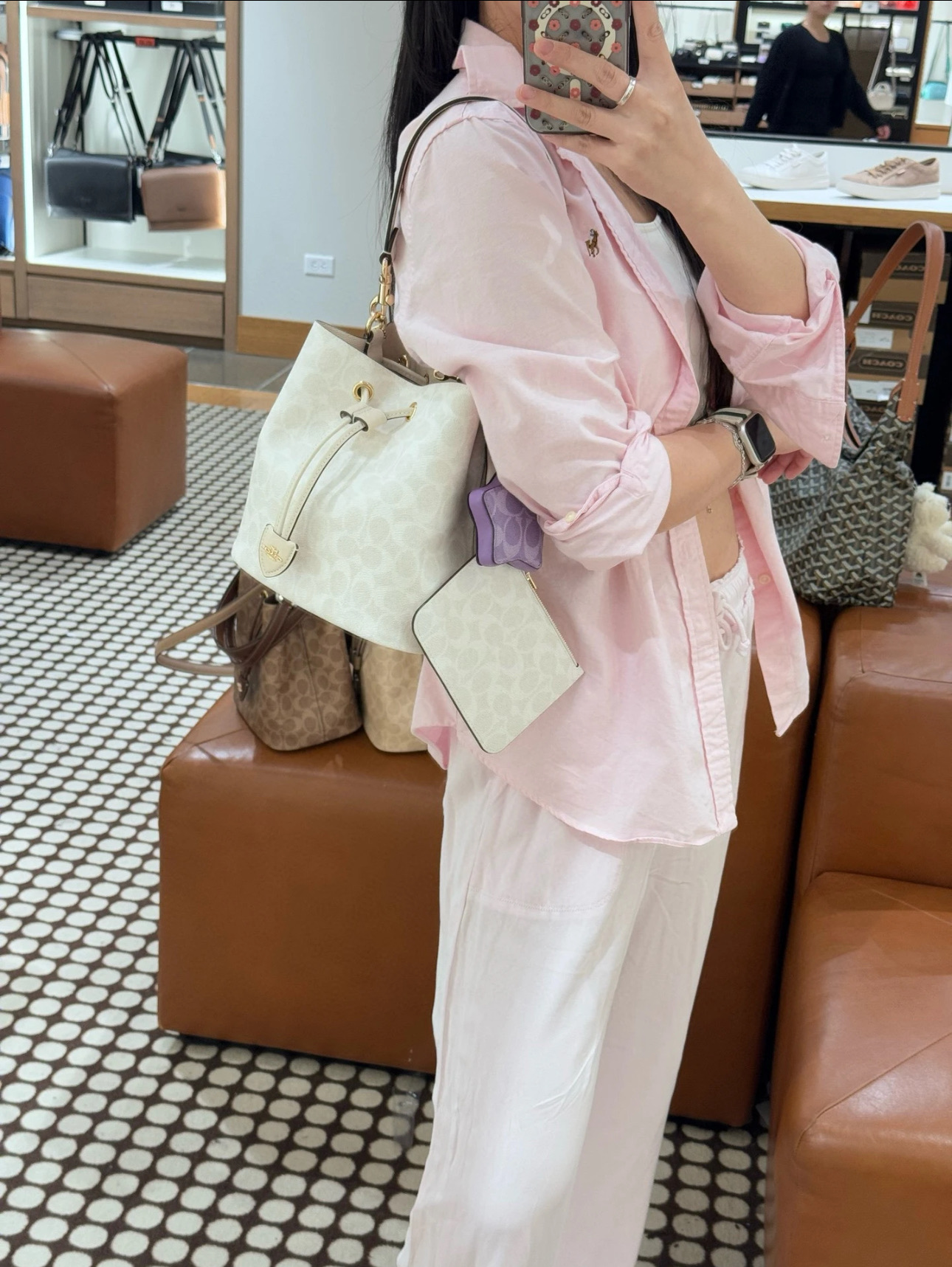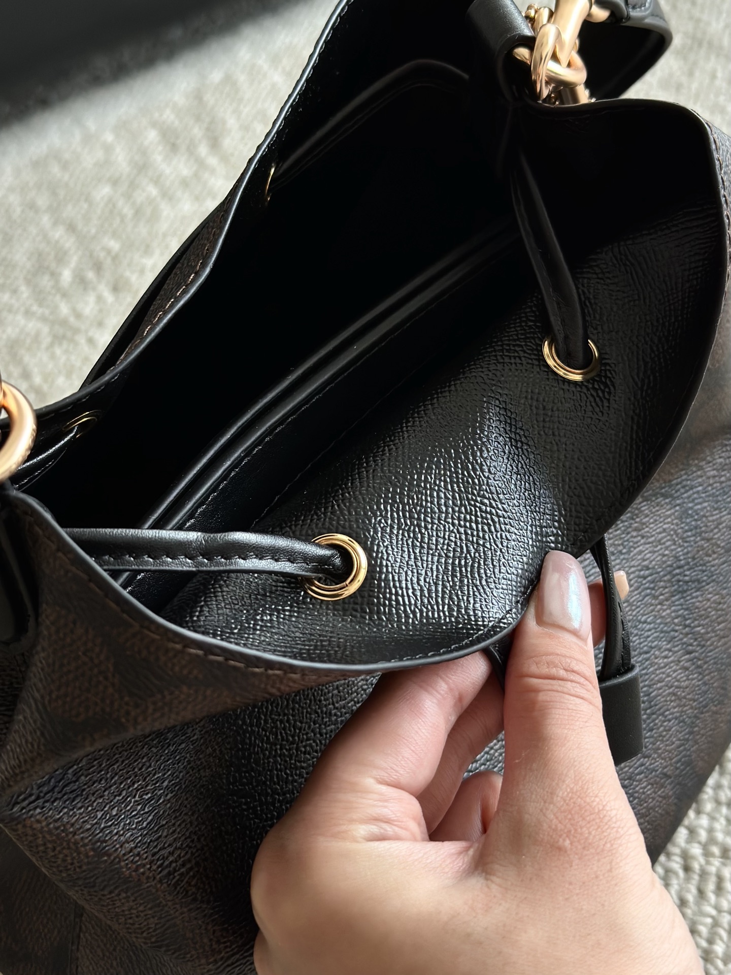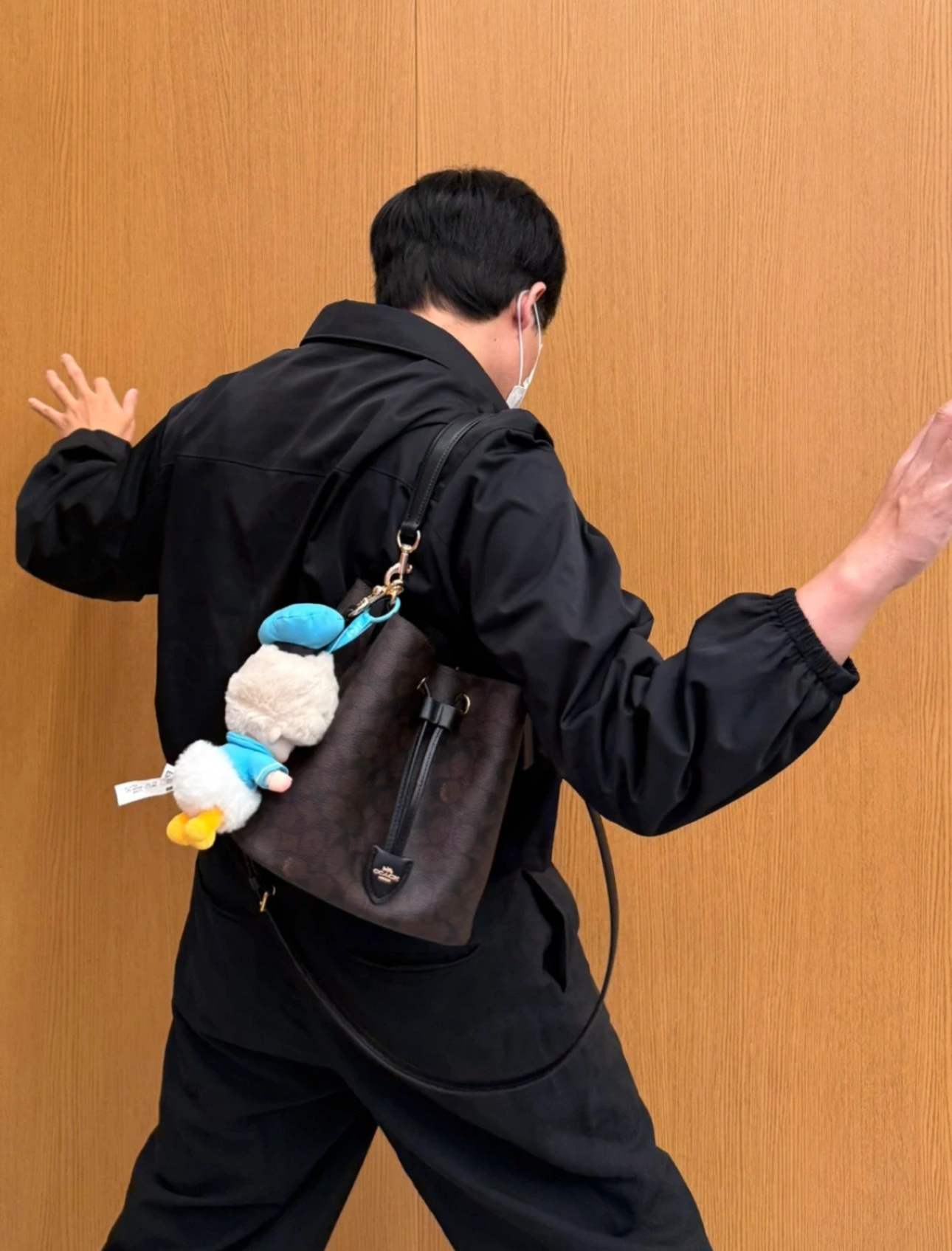 6月新品!蔻驰 CBH07 经典老花Rowan抽绳水桶包 子母包搭配可拆卸长短带,可手提腋下单肩斜挎多功能用法,可拆卸拉链手包、中央开放式隔层,抽绳设计开口 ,今天的价格买到就是赚到,摸着都是一种享受!!这种细节一看就知道大厂工艺!coa在我这就是口碑!买过的都知道品质!这款包真的是集时尚与实用于一身,老花复古又百搭,而且款式设计很别致,包身采用柔软的皮质材料,触感舒适且耐用,容量也很可观,非常适合日常出行使用! 尺寸约:长21cm x 高21cm x 宽14cm