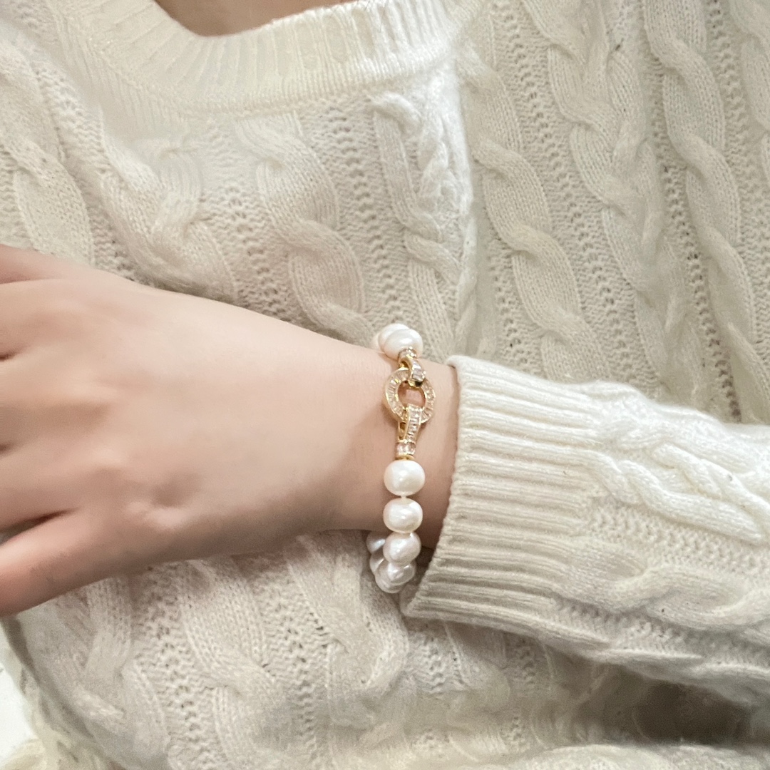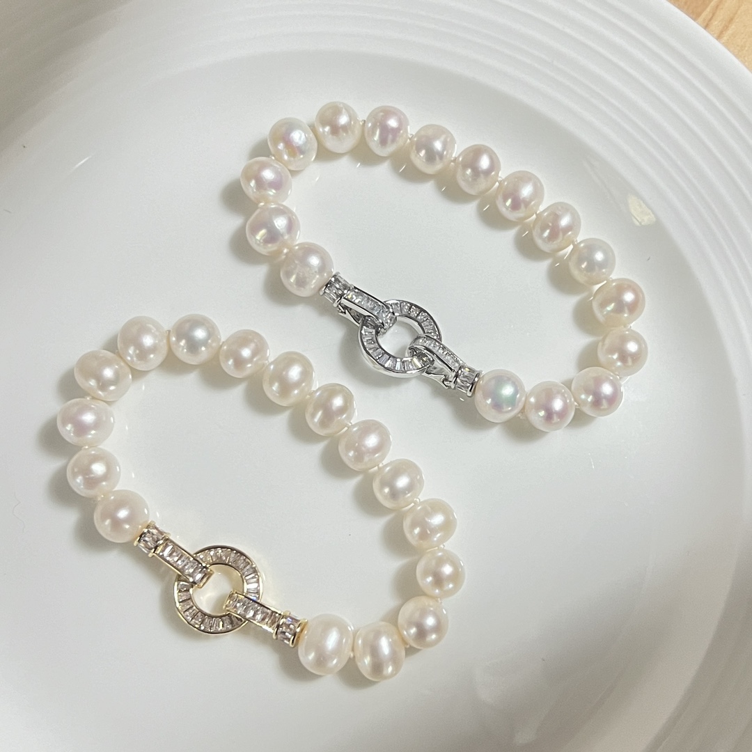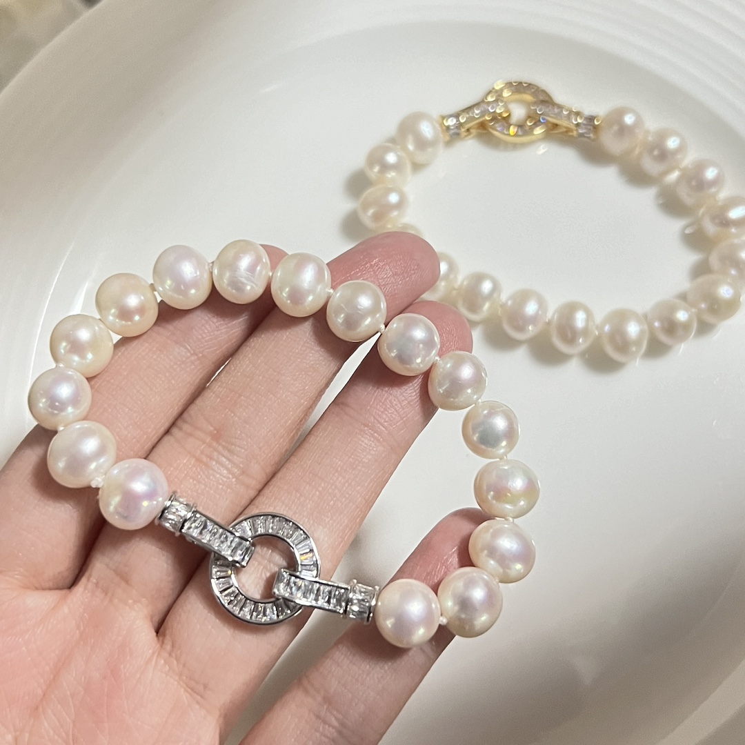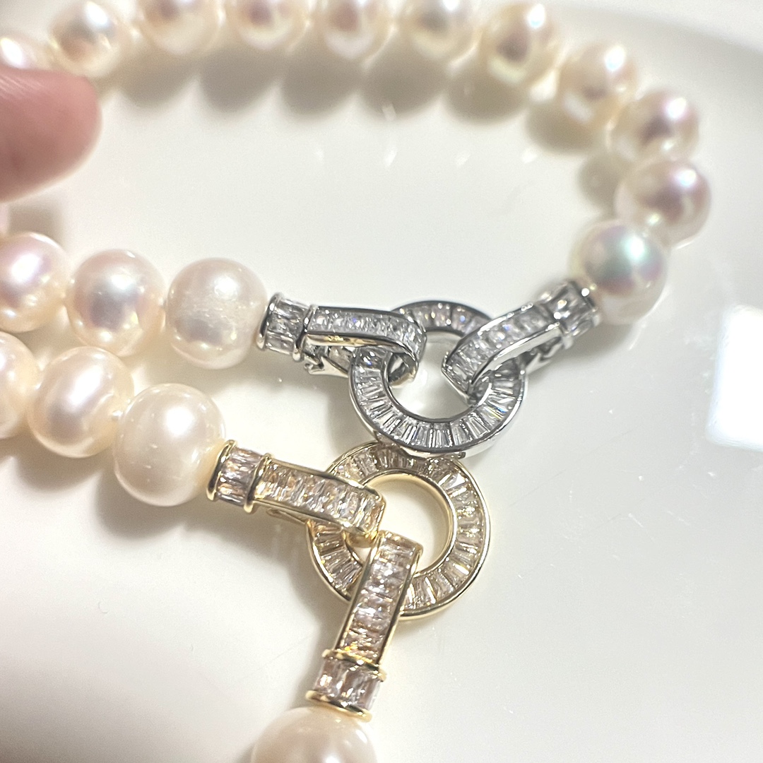 商品信息材质:9-10mm近圆微瑕天然淡水珍珠+锆石长度:15CM