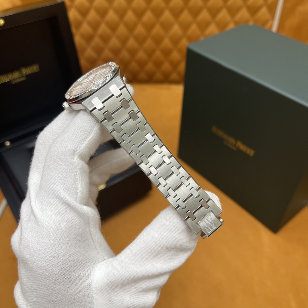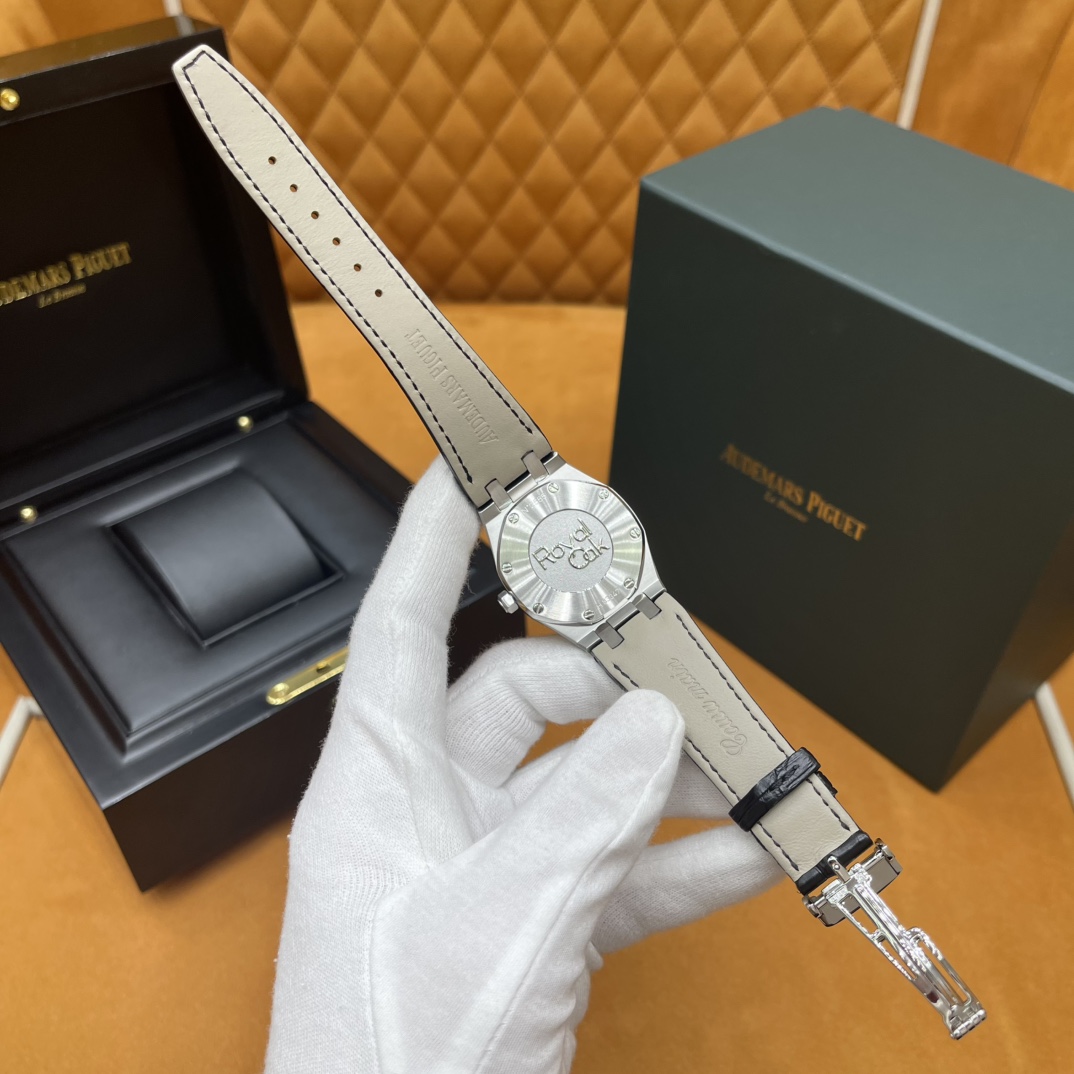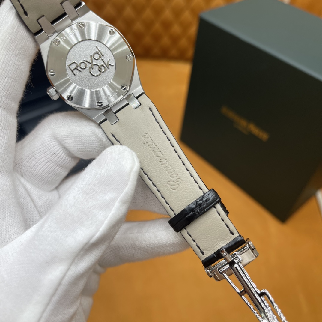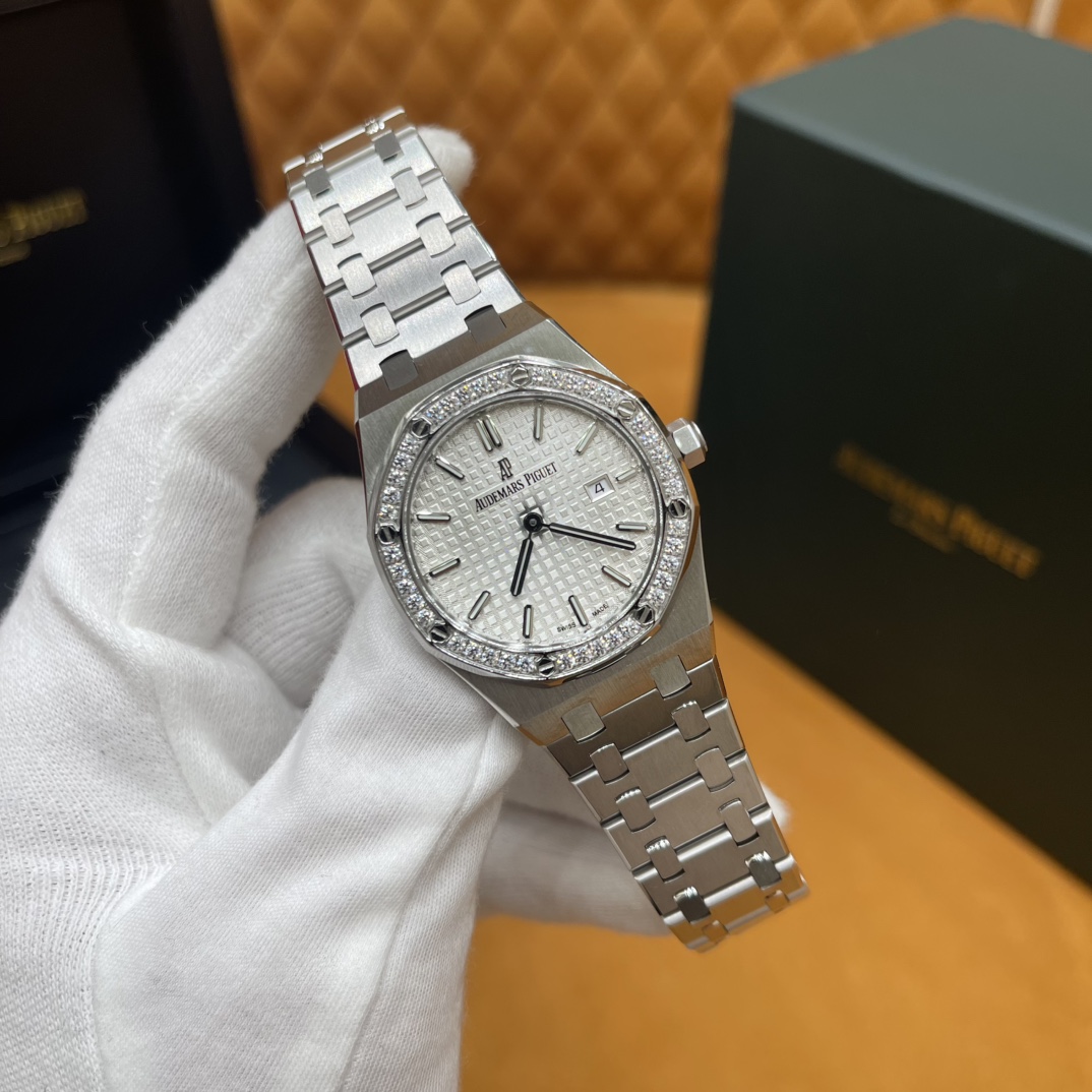 八角形表圈 爱彼的灵魂设计 辨识度拉满 雪山白盘,干净通透,质感天花板!Grand Tapisserie大格纹,细腻如艺术品,每一寸都散发高级感。 宽剑形指针,精细抛光+倒角处理,立体感爆棚!瑞士夜光涂层,暗光环境也能精准读时,柔和持久,夜晚依旧优雅。 精选施华洛世奇钻 ,专利120切割面,火彩炸裂,光线折射直接媲美真钻!每一颗都完美对称,视觉效果高奢级别,奢华到极致。 密底的设计,底盖镌刻“Royal Oak ”字样,细节满分,贵气无处不在! 瑞士石英机芯,走时准到飞起,日常佩戴完全无压力。 白钢表带,搭配精湛拉丝工艺,触感顺滑,每一处细节都经过精细打磨,佩戴舒适且极具质感。 33mm黄金尺寸,刚刚好贴合女生手腕,显瘦、显白、显高级,优雅与霸气兼具,真的绝! 尺寸:33mm