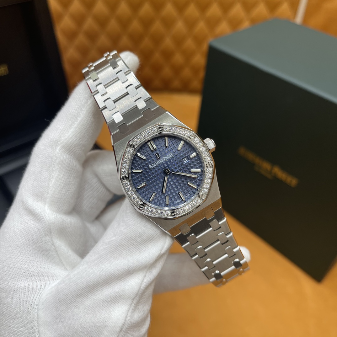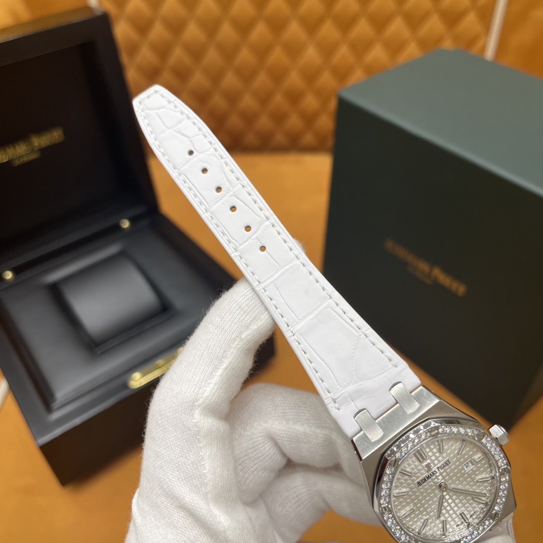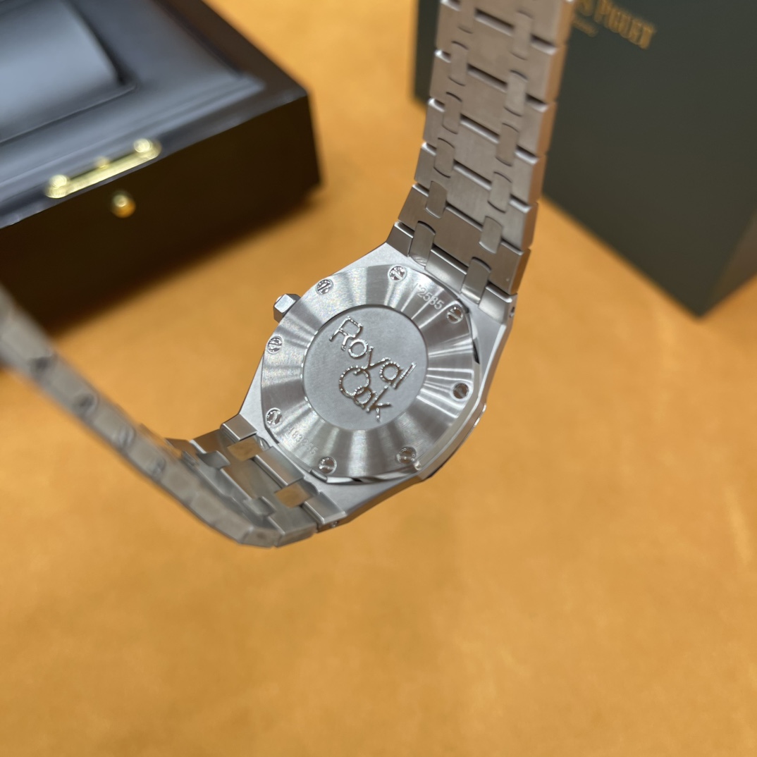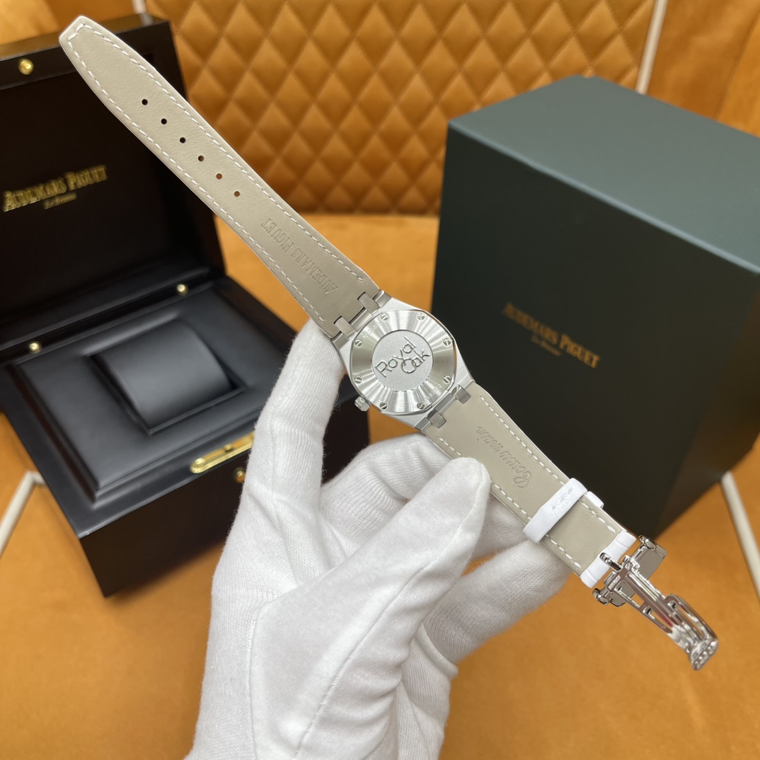 八角形表圈 爱彼的灵魂设计 辨识度拉满 雪山白盘,干净通透,质感天花板!Grand Tapisserie大格纹,细腻如艺术品,每一寸都散发高级感。 宽剑形指针,精细抛光+倒角处理,立体感爆棚!瑞士夜光涂层,暗光环境也能精准读时,柔和持久,夜晚依旧优雅。 精选施华洛世奇钻 ,专利120切割面,火彩炸裂,光线折射直接媲美真钻!每一颗都完美对称,视觉效果高奢级别,奢华到极致。 密底的设计,底盖镌刻“Royal Oak ”字样,细节满分,贵气无处不在! 瑞士石英机芯,走时准到飞起,日常佩戴完全无压力。 白钢表带,搭配精湛拉丝工艺,触感顺滑,每一处细节都经过精细打磨,佩戴舒适且极具质感。 33mm黄金尺寸,刚刚好贴合女生手腕,显瘦、显白、显高级,优雅与霸气兼具,真的绝! 尺寸:33mm