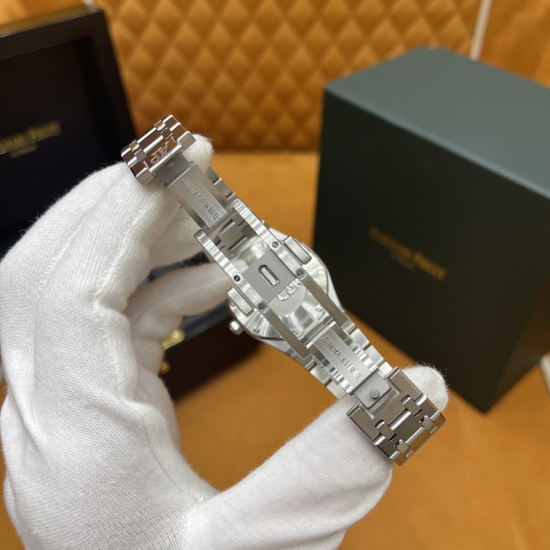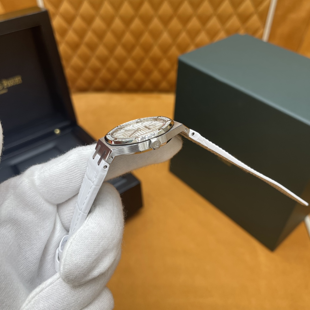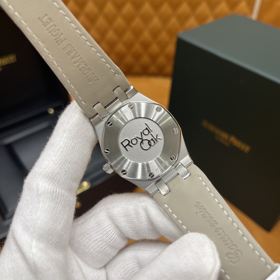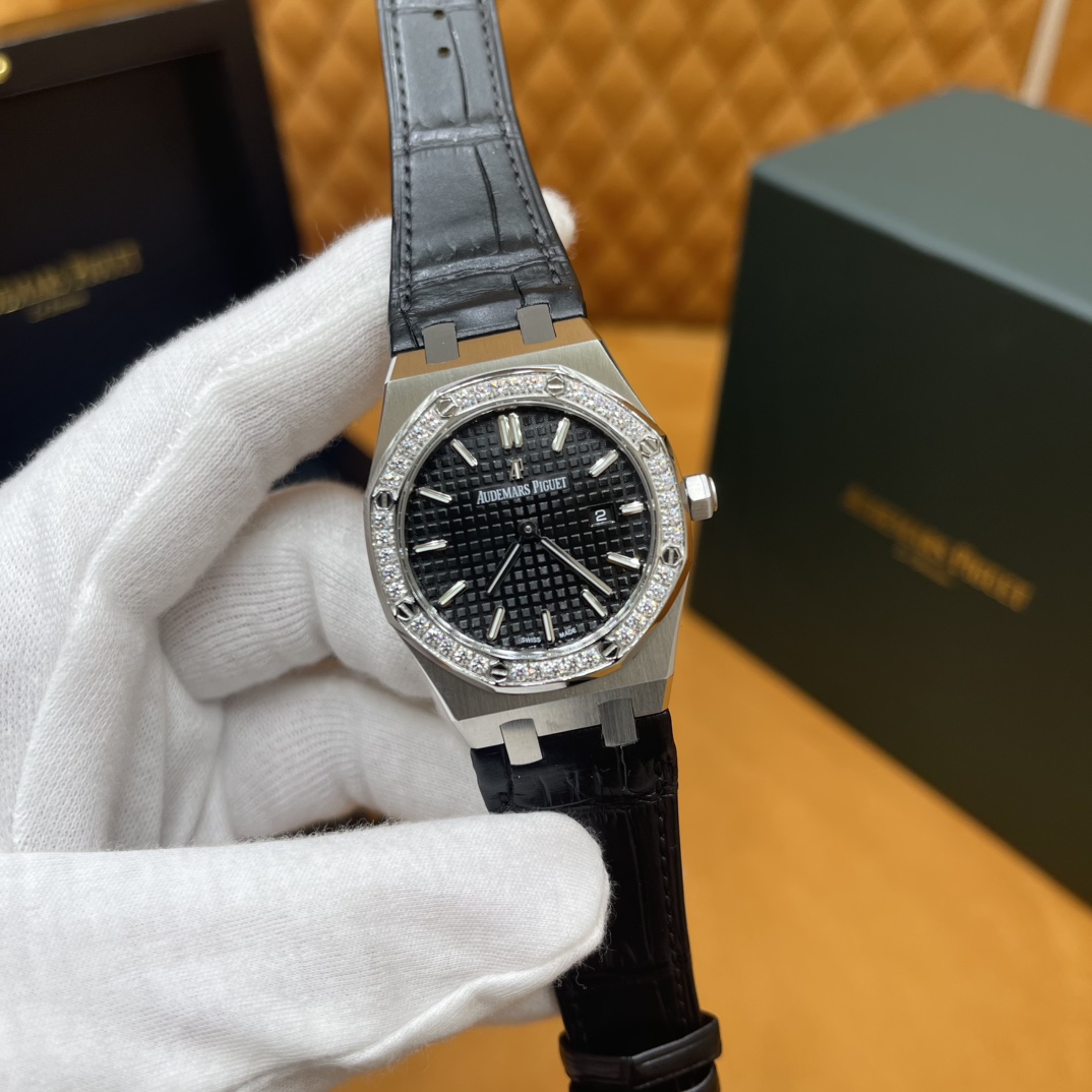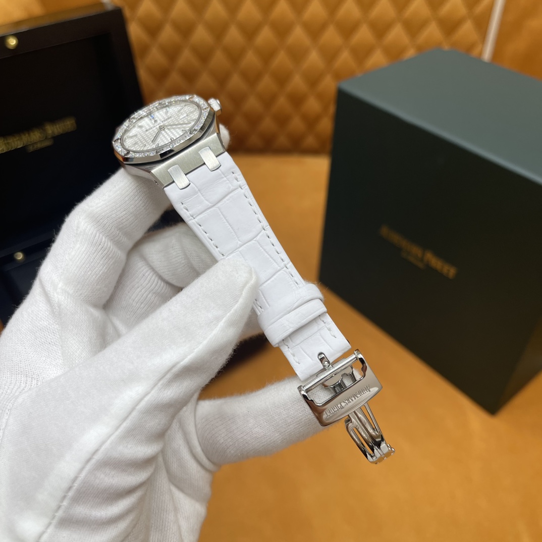八角形表圈 爱彼的灵魂设计 辨识度拉满 雪山白盘,干净通透,质感天花板!Grand Tapisserie大格纹,细腻如艺术品,每一寸都散发高级感。 宽剑形指针,精细抛光+倒角处理,立体感爆棚!瑞士夜光涂层,暗光环境也能精准读时,柔和持久,夜晚依旧优雅。 精选施华洛世奇钻 ,专利120切割面,火彩炸裂,光线折射直接媲美真钻!每一颗都完美对称,视觉效果高奢级别,奢华到极致。 密底的设计,底盖镌刻“Royal Oak ”字样,细节满分,贵气无处不在! 瑞士石英机芯,走时准到飞起,日常佩戴完全无压力。 白钢表带,搭配精湛拉丝工艺,触感顺滑,每一处细节都经过精细打磨,佩戴舒适且极具质感。 33mm黄金尺寸,刚刚好贴合女生手腕,显瘦、显白、显高级,优雅与霸气兼具,真的绝! 尺寸:33mm