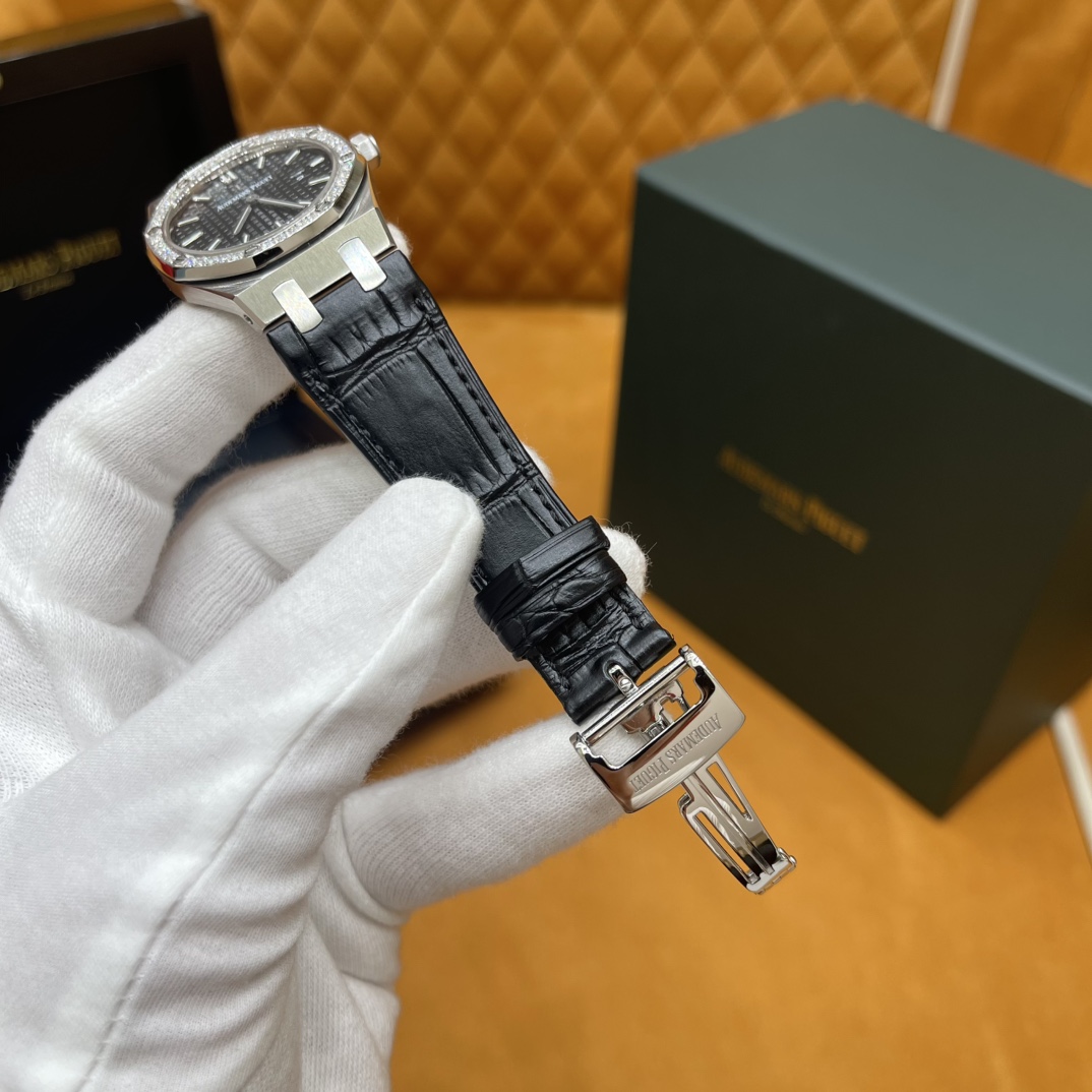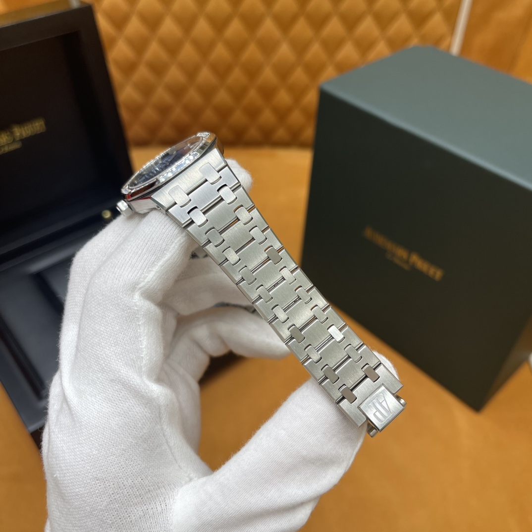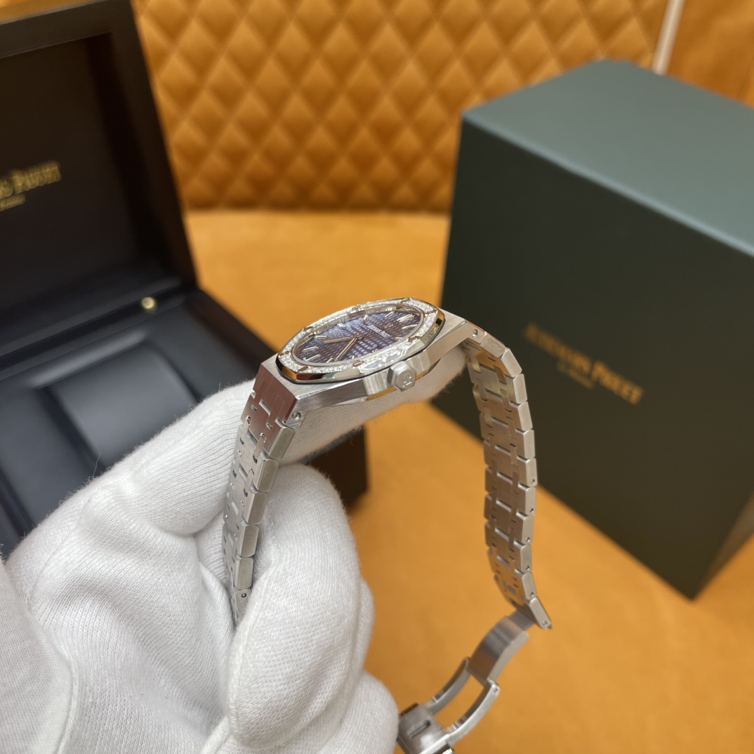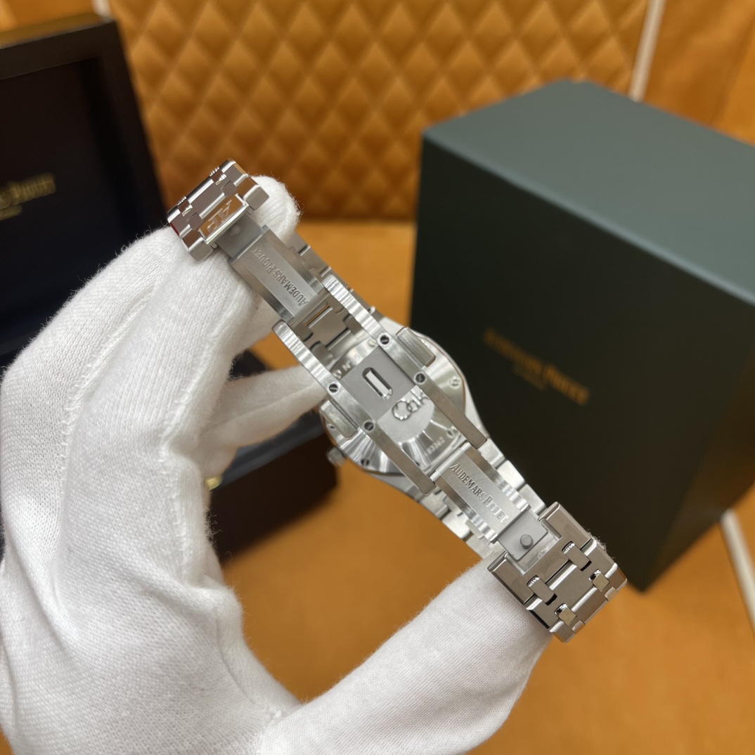 八角形表圈 爱彼的灵魂设计 辨识度拉满 雪山白盘,干净通透,质感天花板!Grand Tapisserie大格纹,细腻如艺术品,每一寸都散发高级感。 宽剑形指针,精细抛光+倒角处理,立体感爆棚!瑞士夜光涂层,暗光环境也能精准读时,柔和持久,夜晚依旧优雅。 精选施华洛世奇钻 ,专利120切割面,火彩炸裂,光线折射直接媲美真钻!每一颗都完美对称,视觉效果高奢级别,奢华到极致。 密底的设计,底盖镌刻“Royal Oak ”字样,细节满分,贵气无处不在! 瑞士石英机芯,走时准到飞起,日常佩戴完全无压力。 白钢表带,搭配精湛拉丝工艺,触感顺滑,每一处细节都经过精细打磨,佩戴舒适且极具质感。 33mm黄金尺寸,刚刚好贴合女生手腕,显瘦、显白、显高级,优雅与霸气兼具,真的绝! 尺寸:33mm