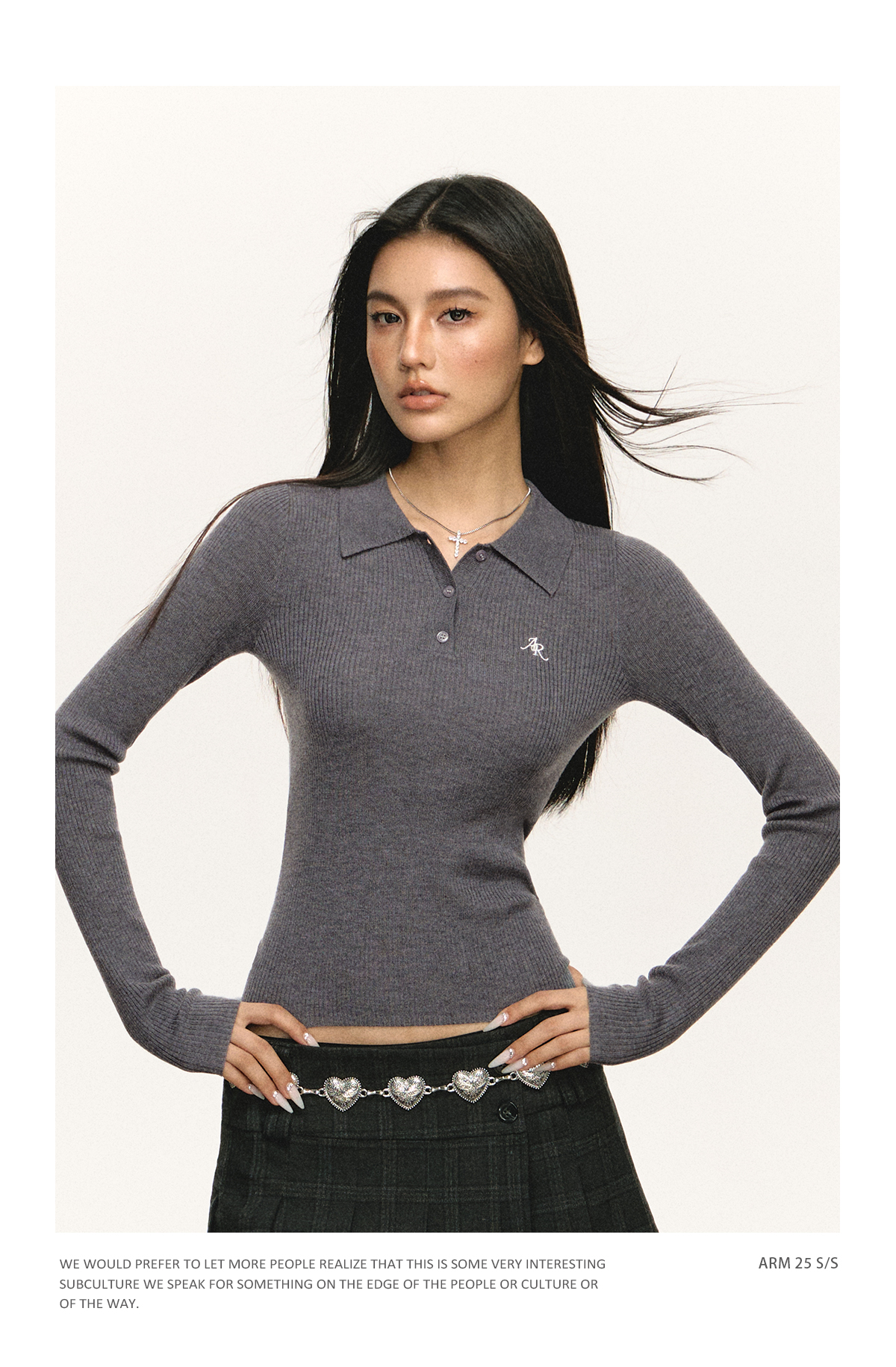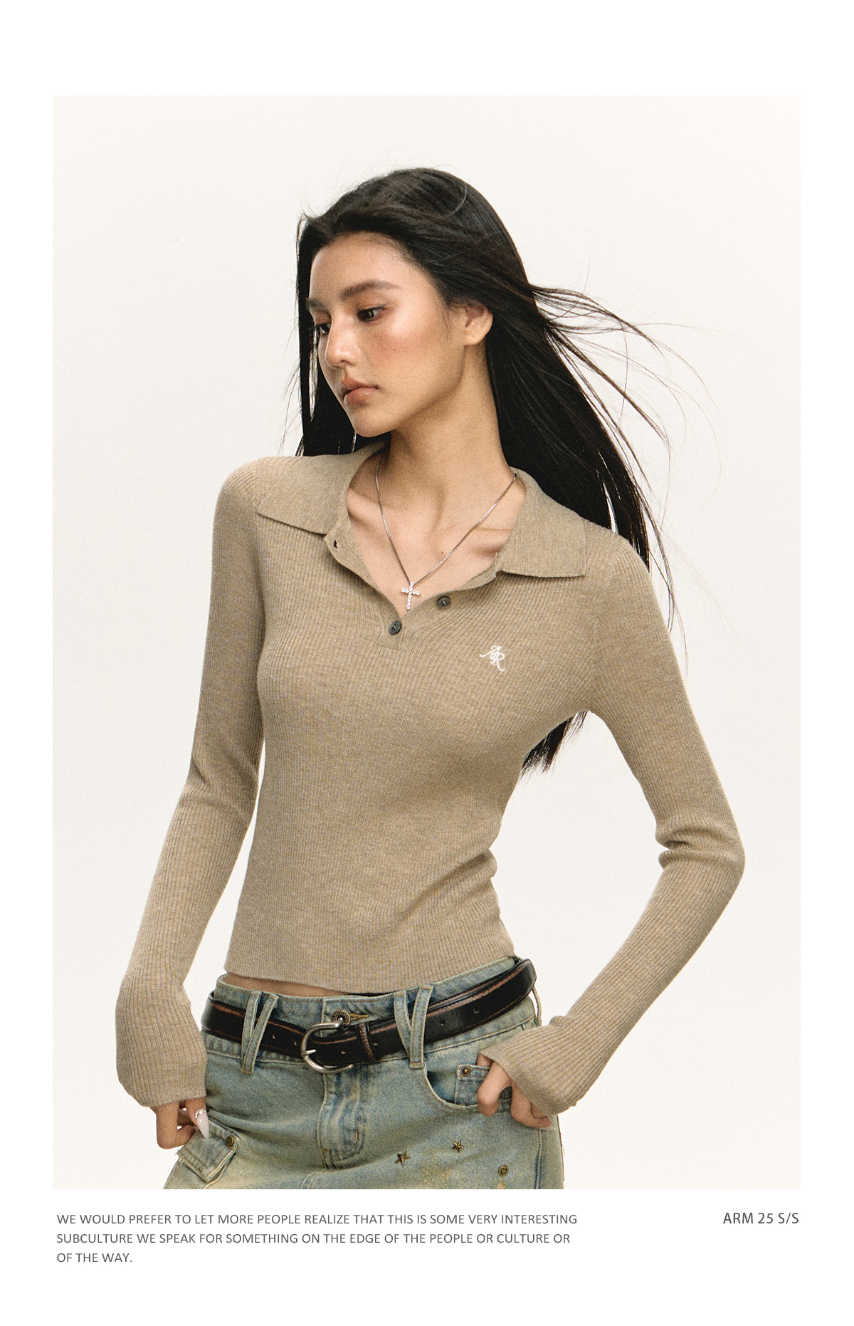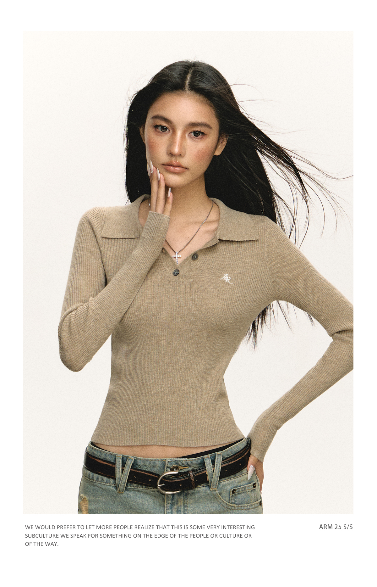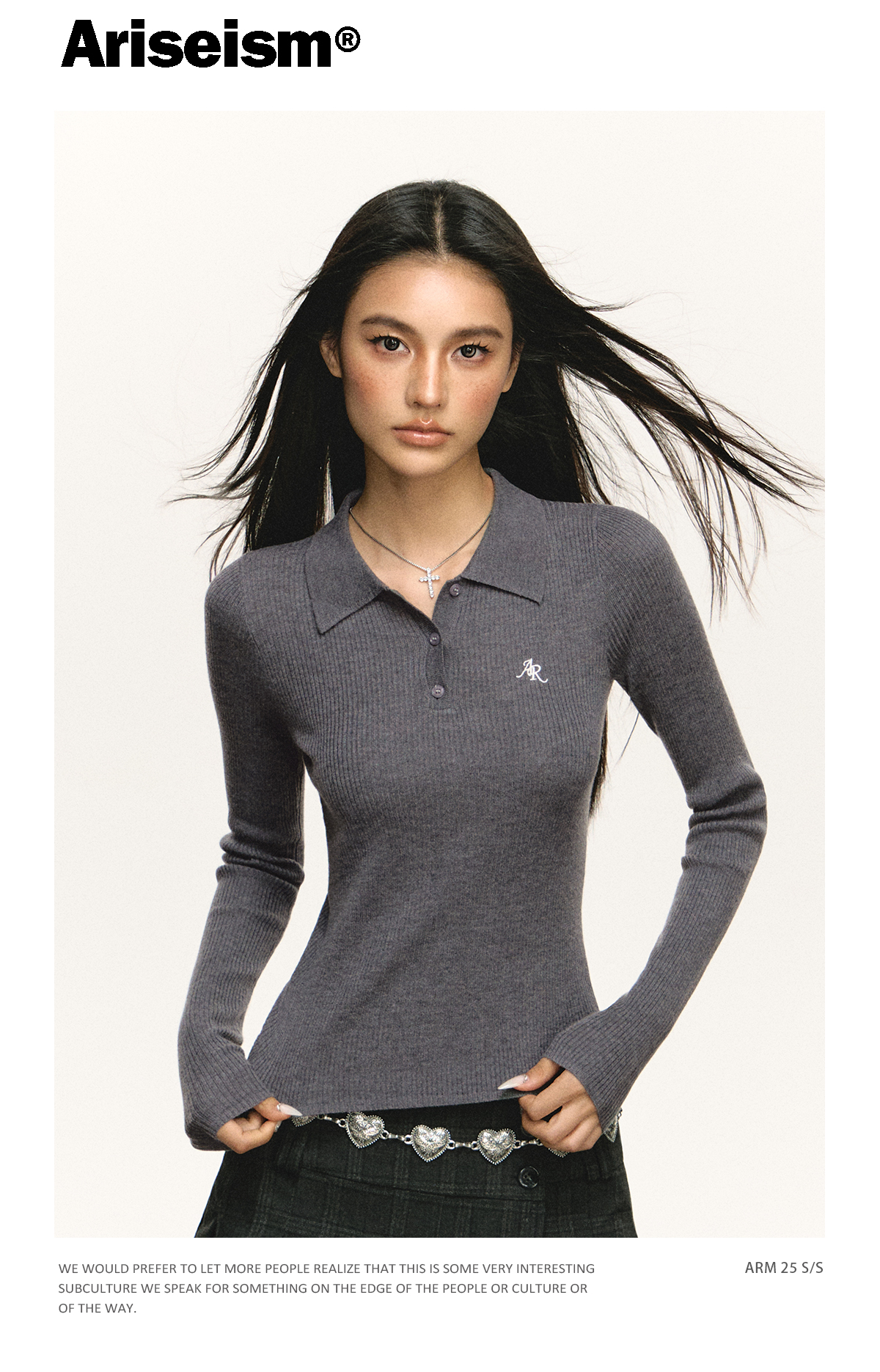 Ariseism 美式复古修身翻领针织衫女2025春季新款内搭打底上衣