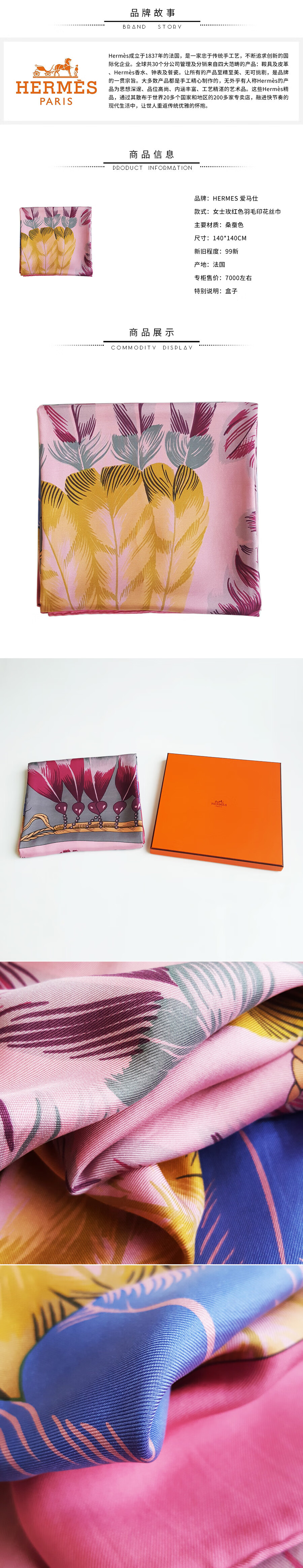 【99新】爱马仕(HERMES)女士玫红色羽毛印花丝巾 丝巾 爱马仕 241218TH03
