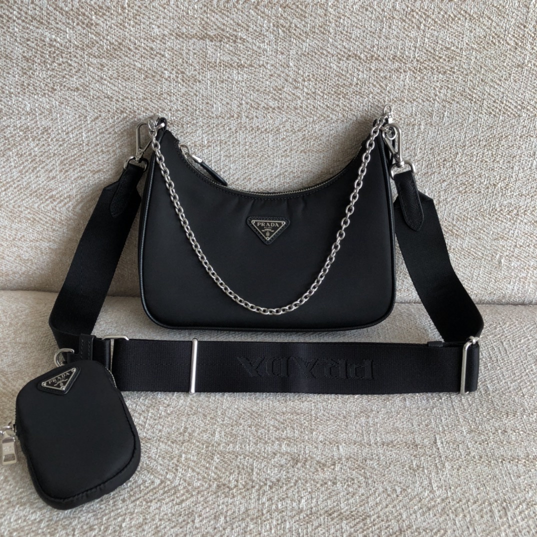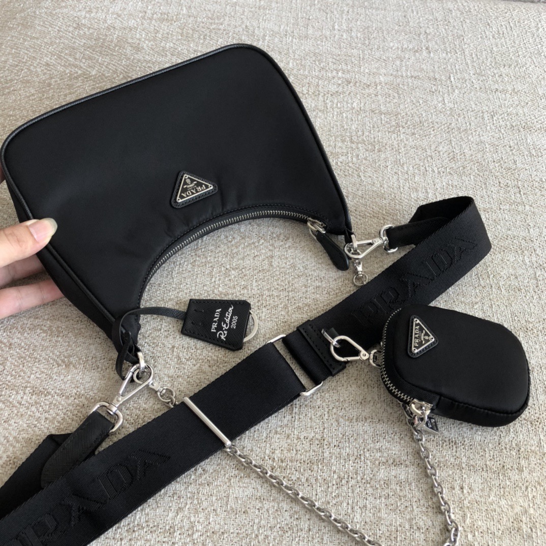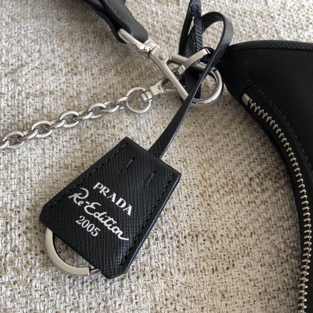 普家 Re-Edition 2005 搪瓷三角徽标可拆卸链条复刻 *尼龙拼皮 月牙腋下包手提单肩包 女款 黑色 *三合一