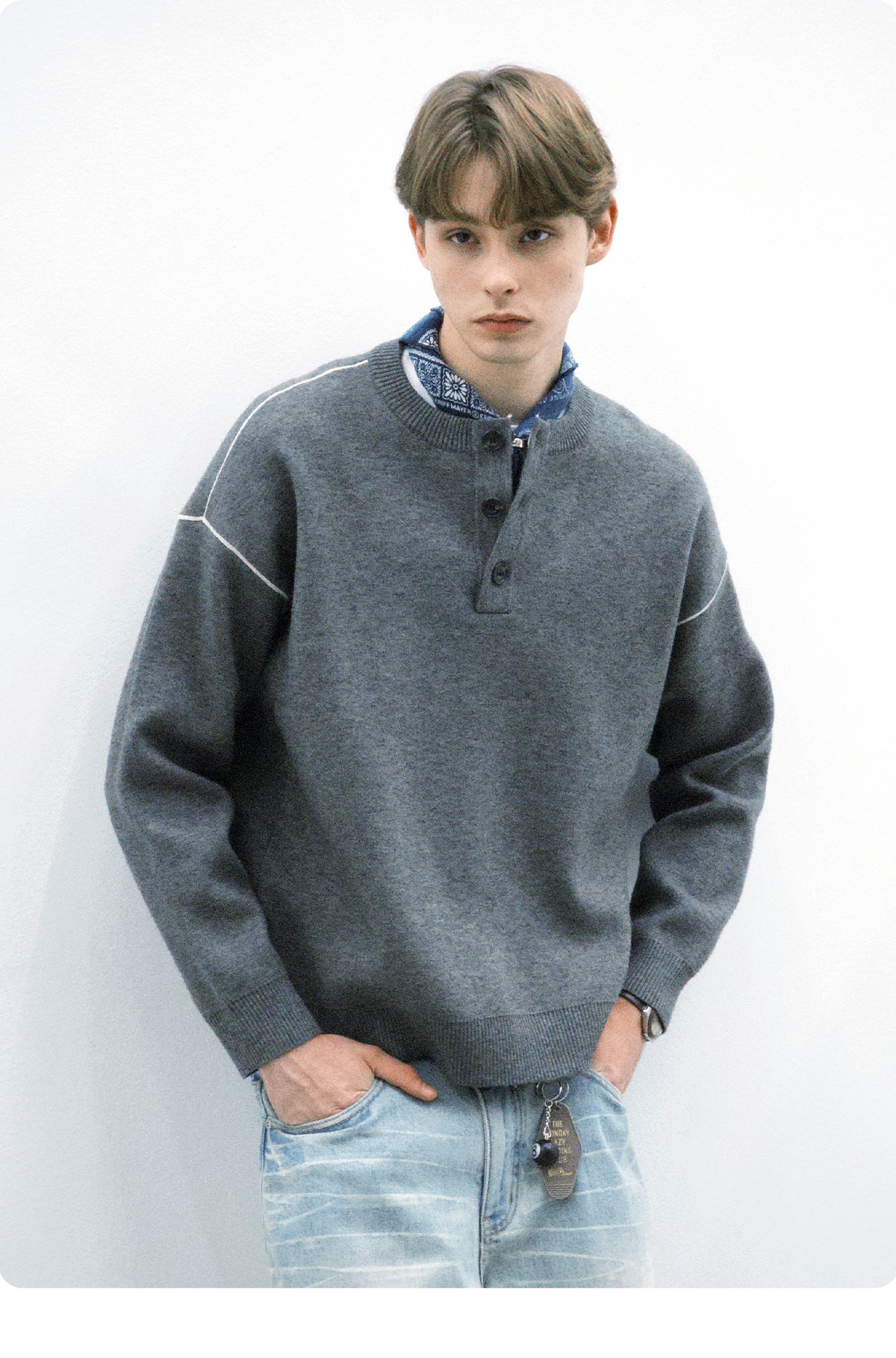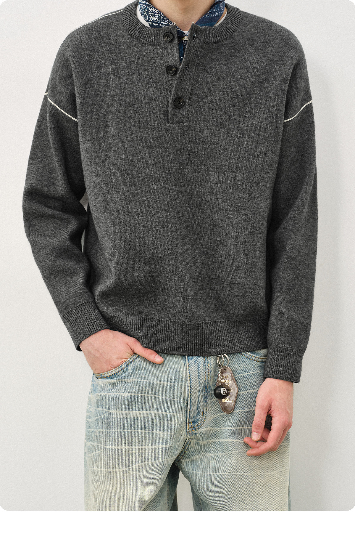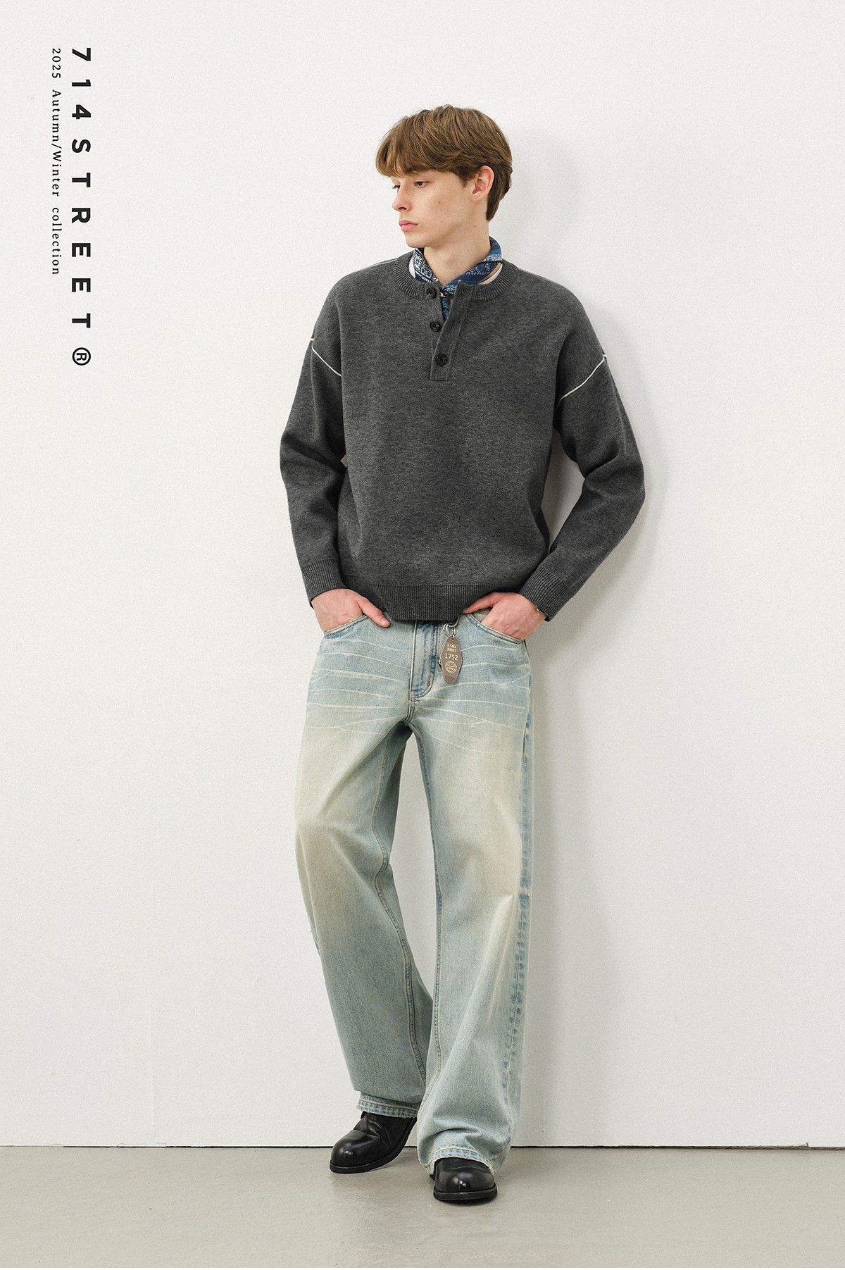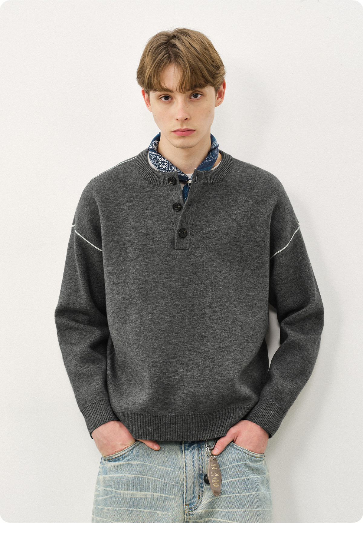 714street高密抗起球亨利领毛衣男2025秋冬季落肩宽松针织衫上衣