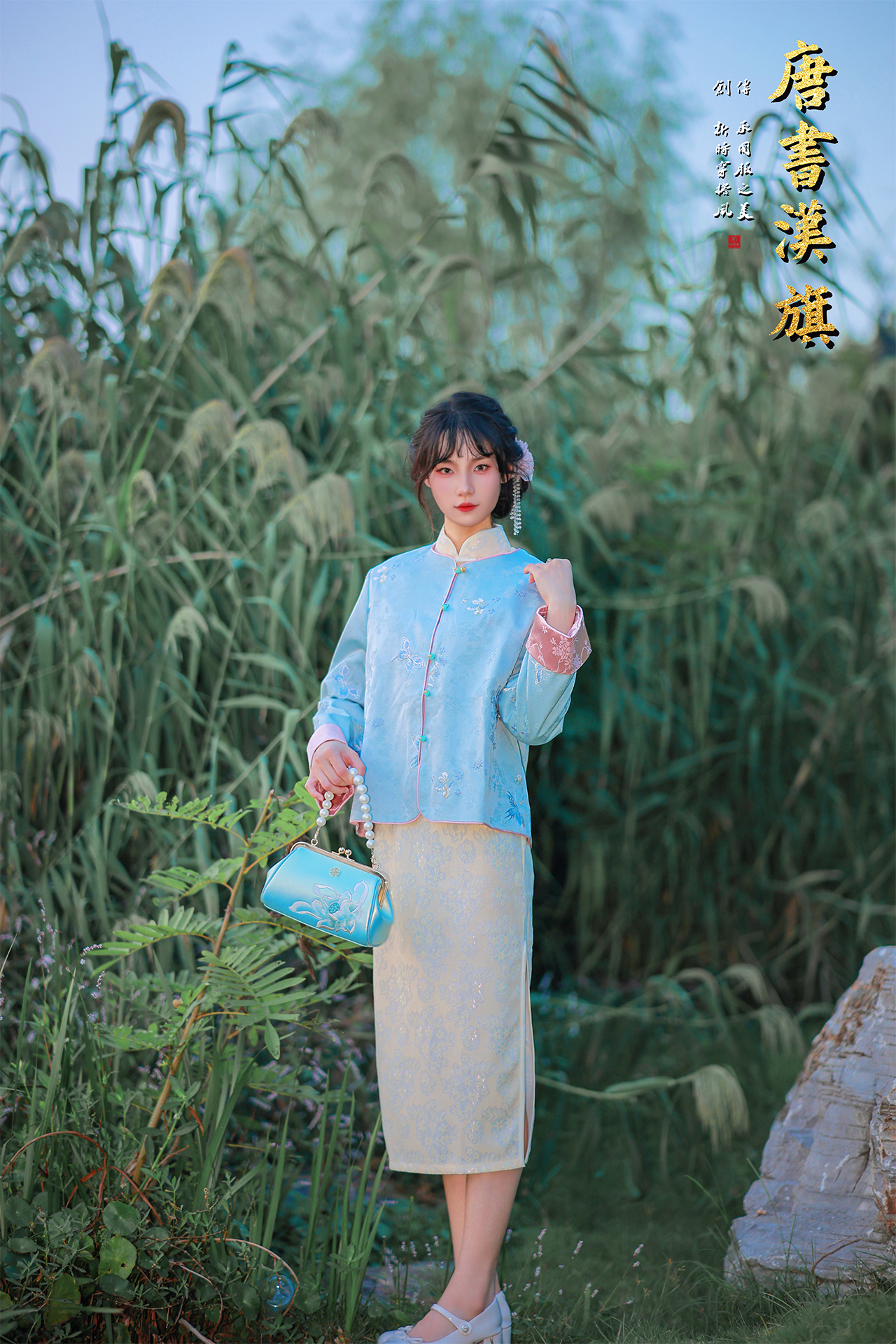 【粉蓝织梦】水蓝刺绣中式短衫,融江南水韵于衣袂之间。 衣身以清透水蓝为底,暗织雅致提花并点缀精巧刺绣,领口与袖口饰柔粉滚边,细节处尽显国风温婉;立领设计衬出颈部线条