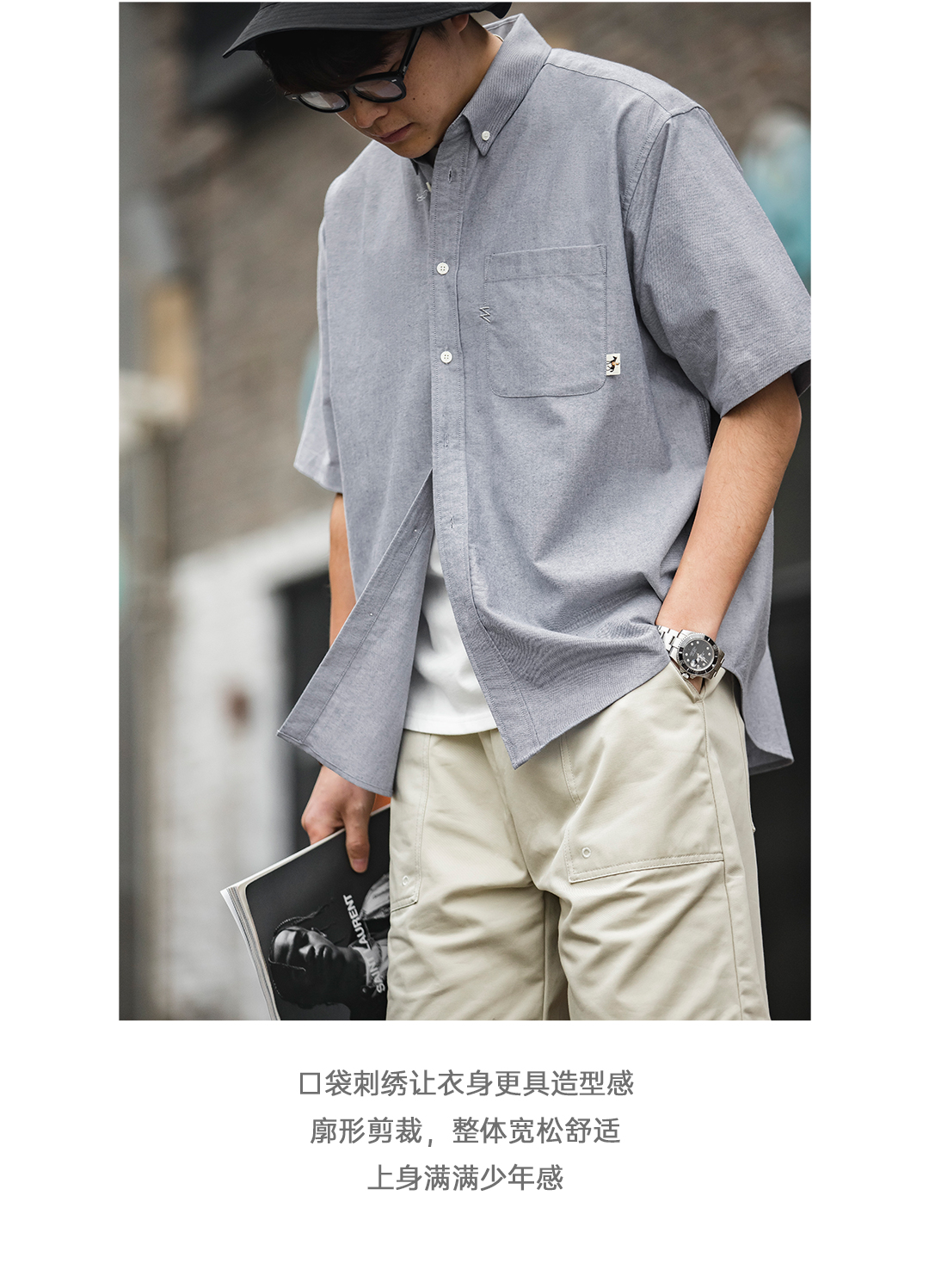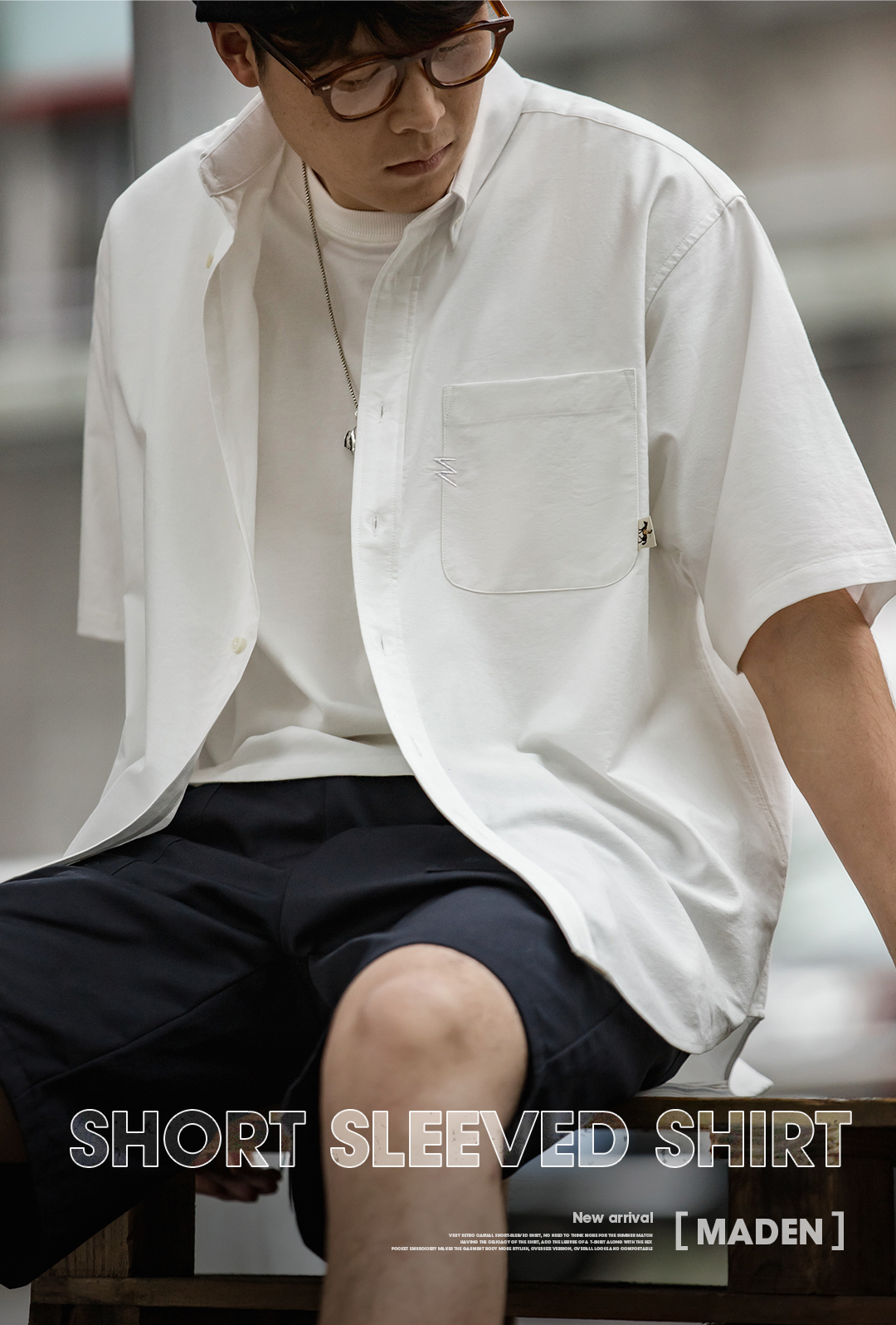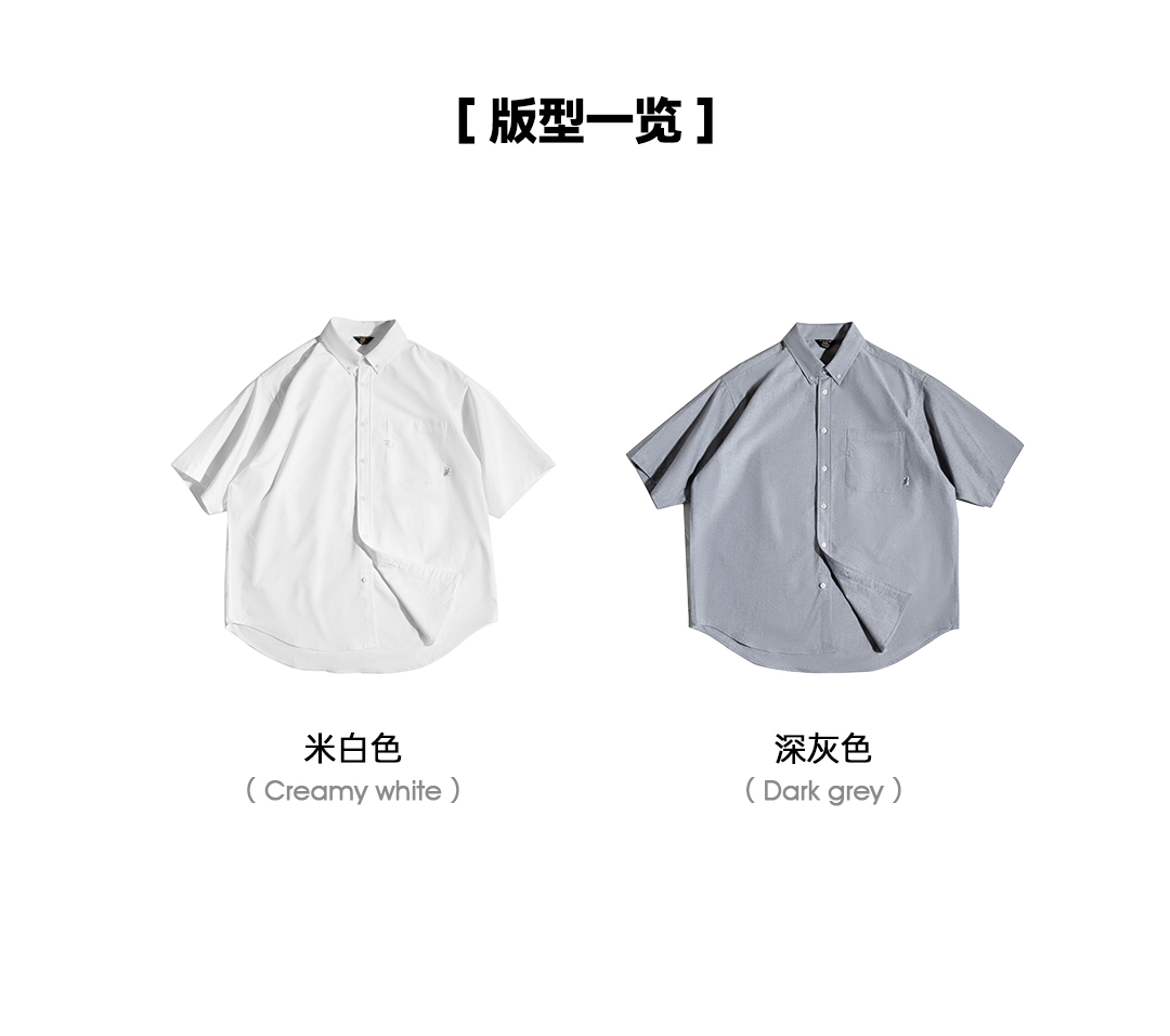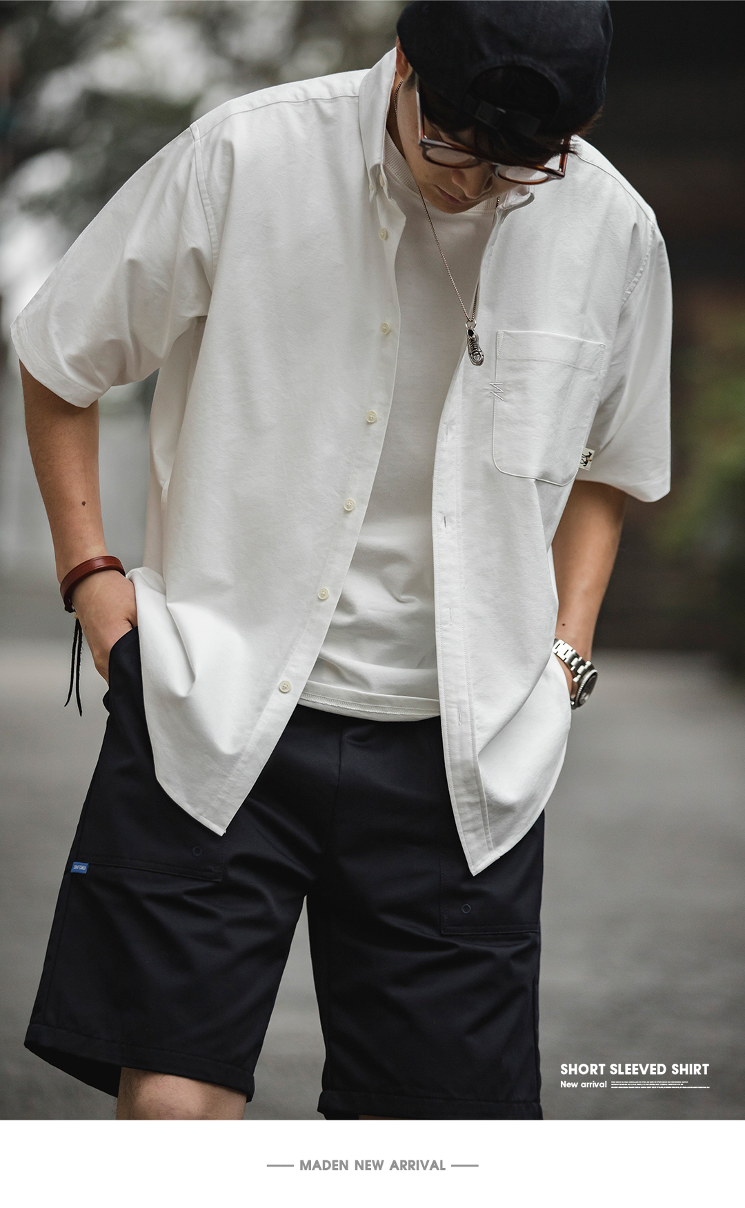 工装优选 美式复古oversize白色叠穿短袖衬衫宽松cityboy衬衣男潮