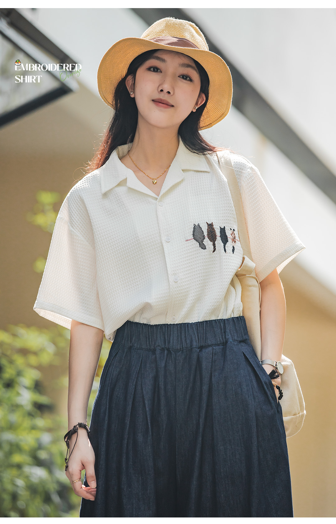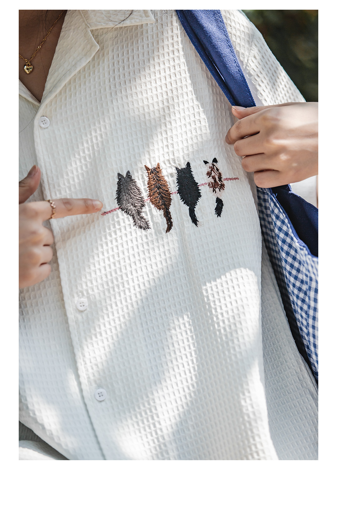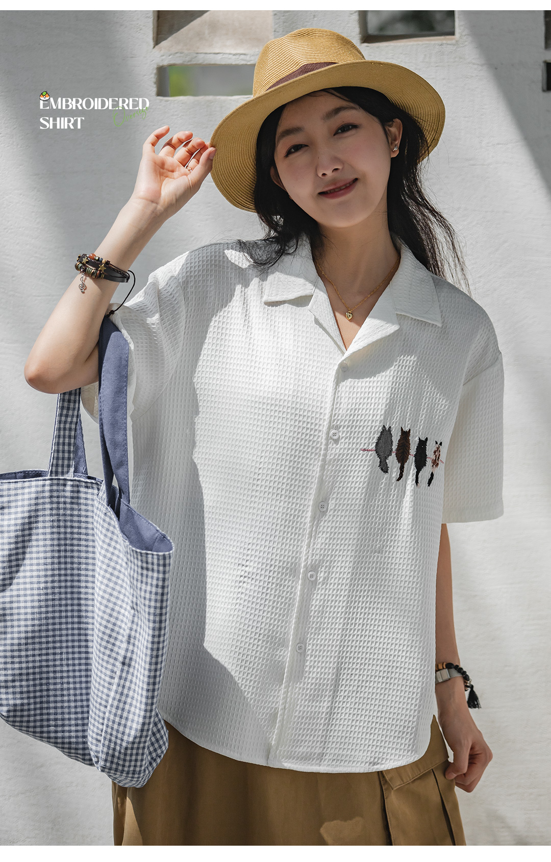 马登华夫格衬衫薄正肩上衣刺绣宽松日系通勤衬衣短袖女t恤夏款女