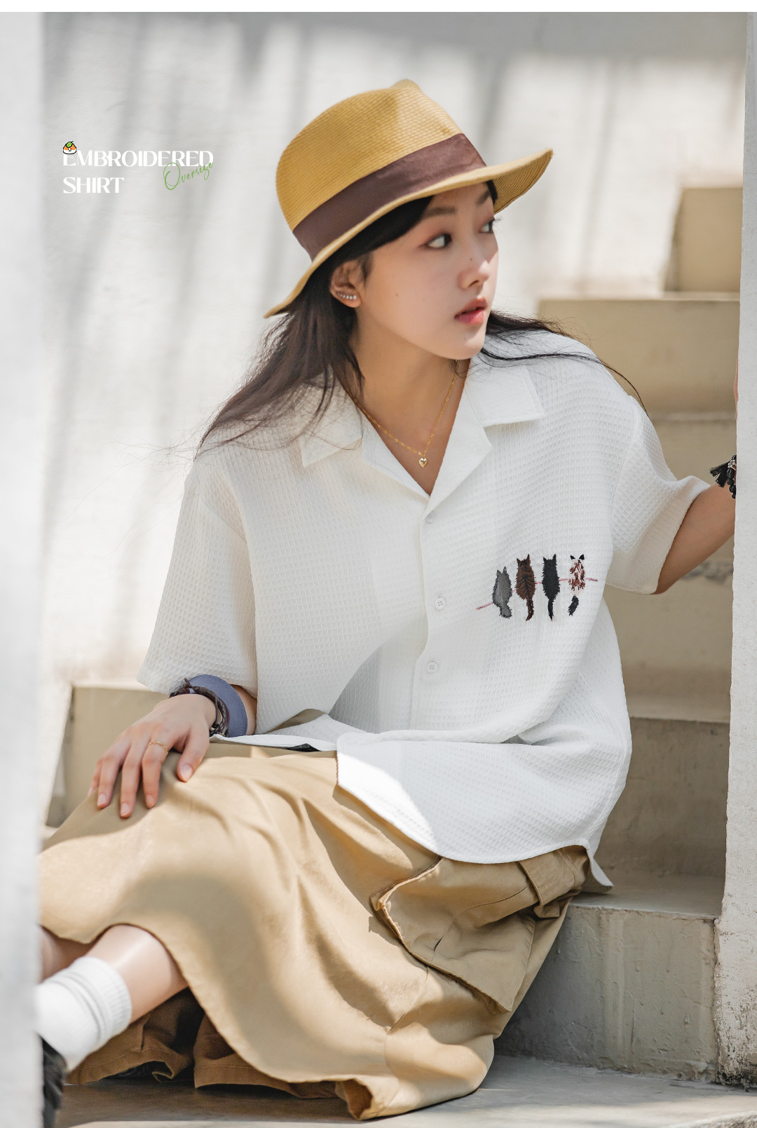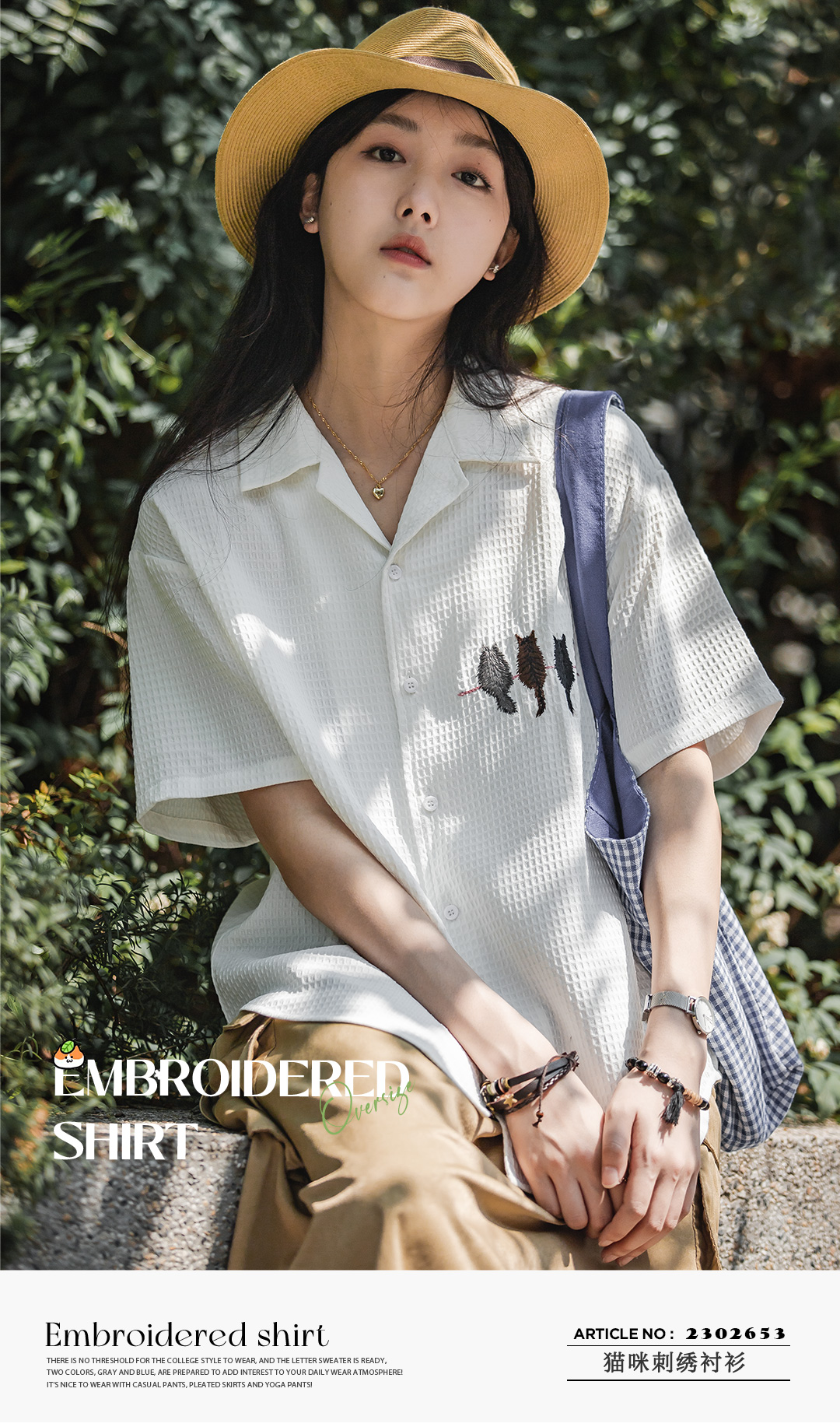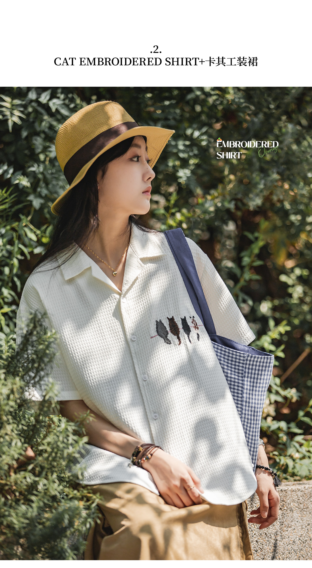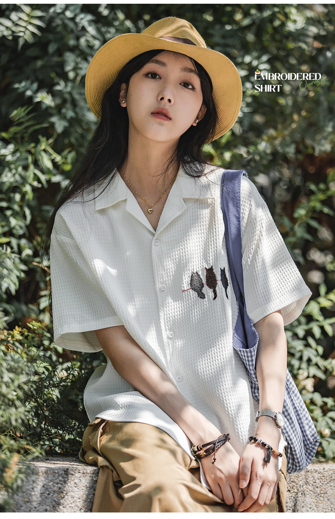 马登华夫格衬衫薄正肩上衣刺绣宽松日系通勤衬衣短袖女t恤夏款女