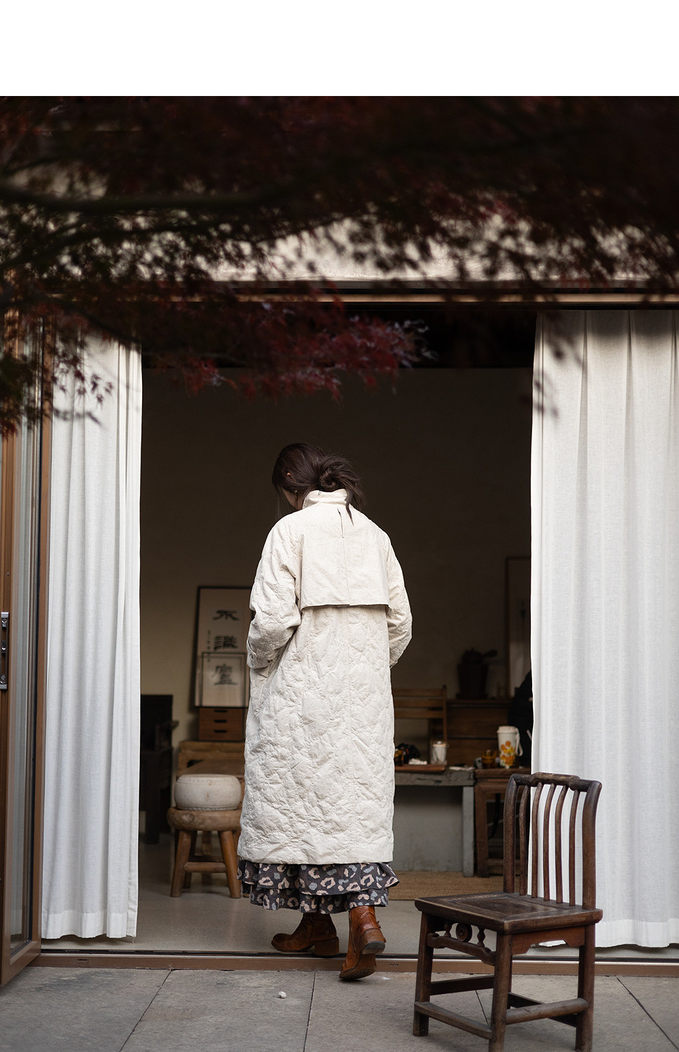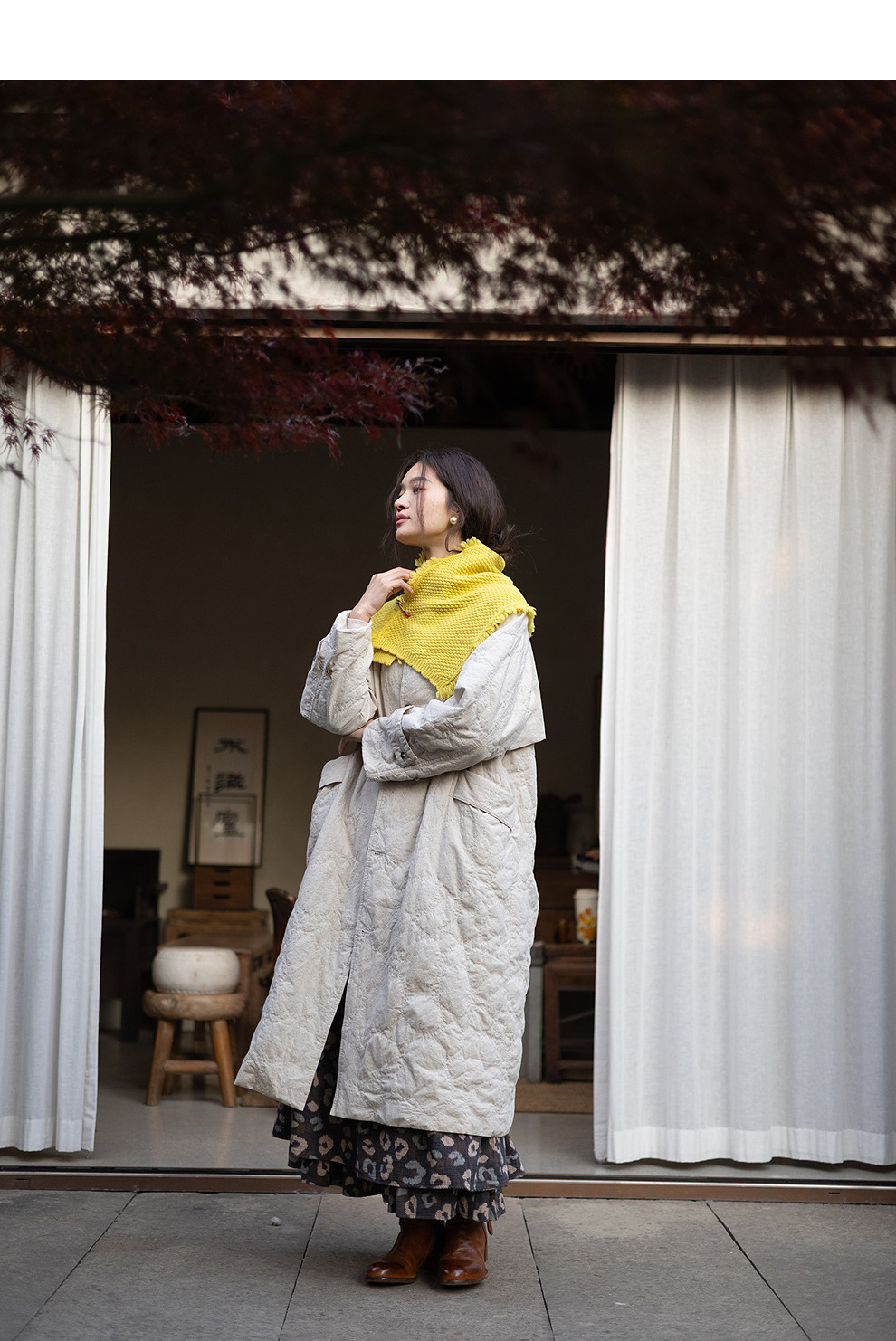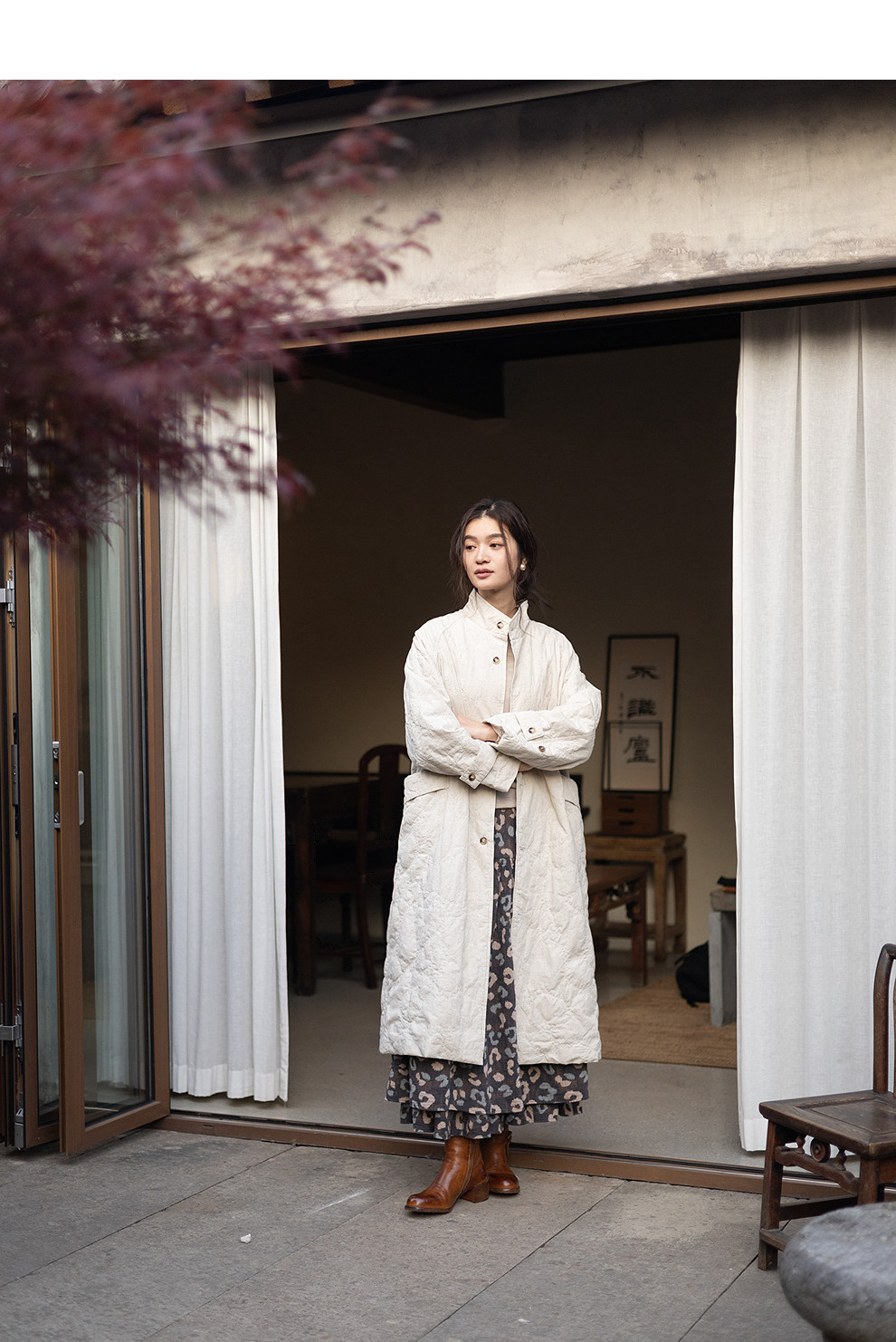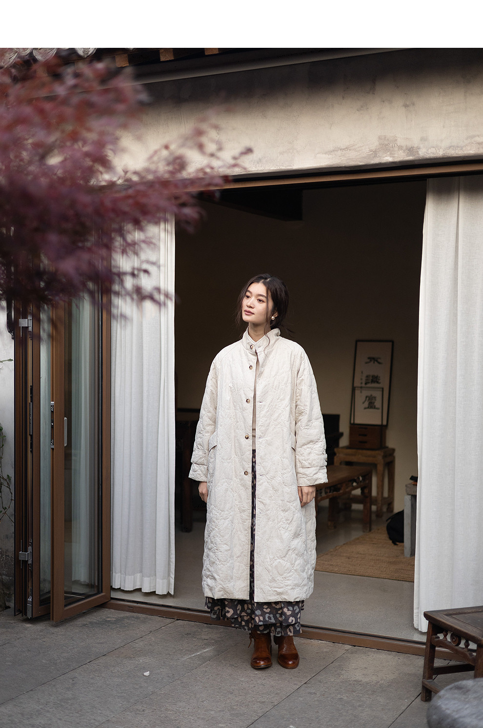 绽放066朵/棉麻提花宽松气质长款风衣外套女中长款棉服插肩袖大衣