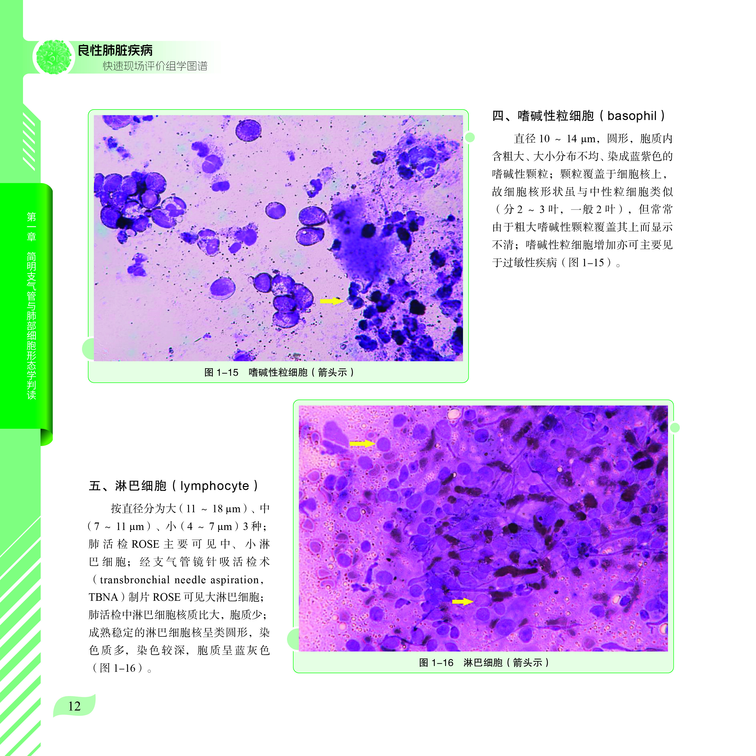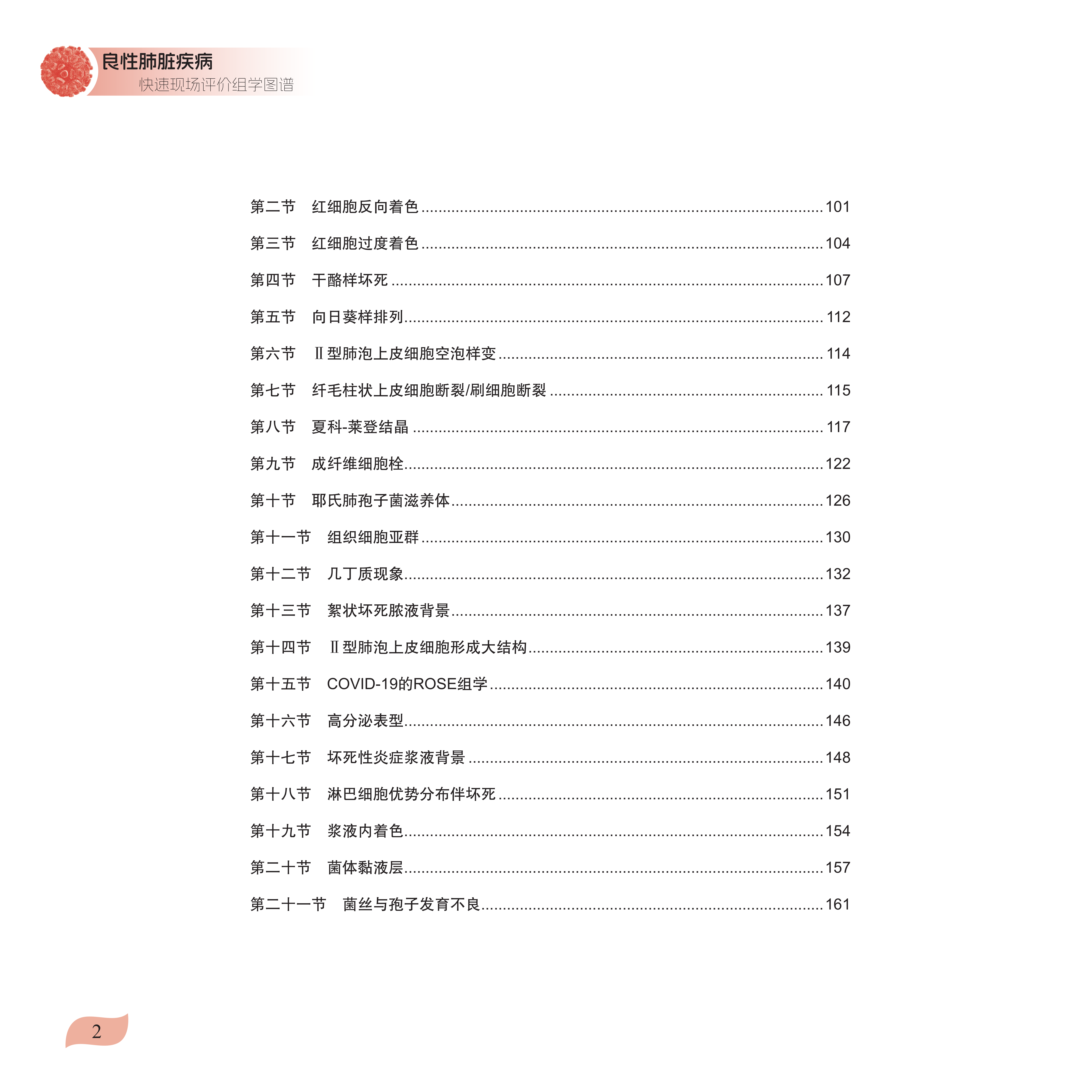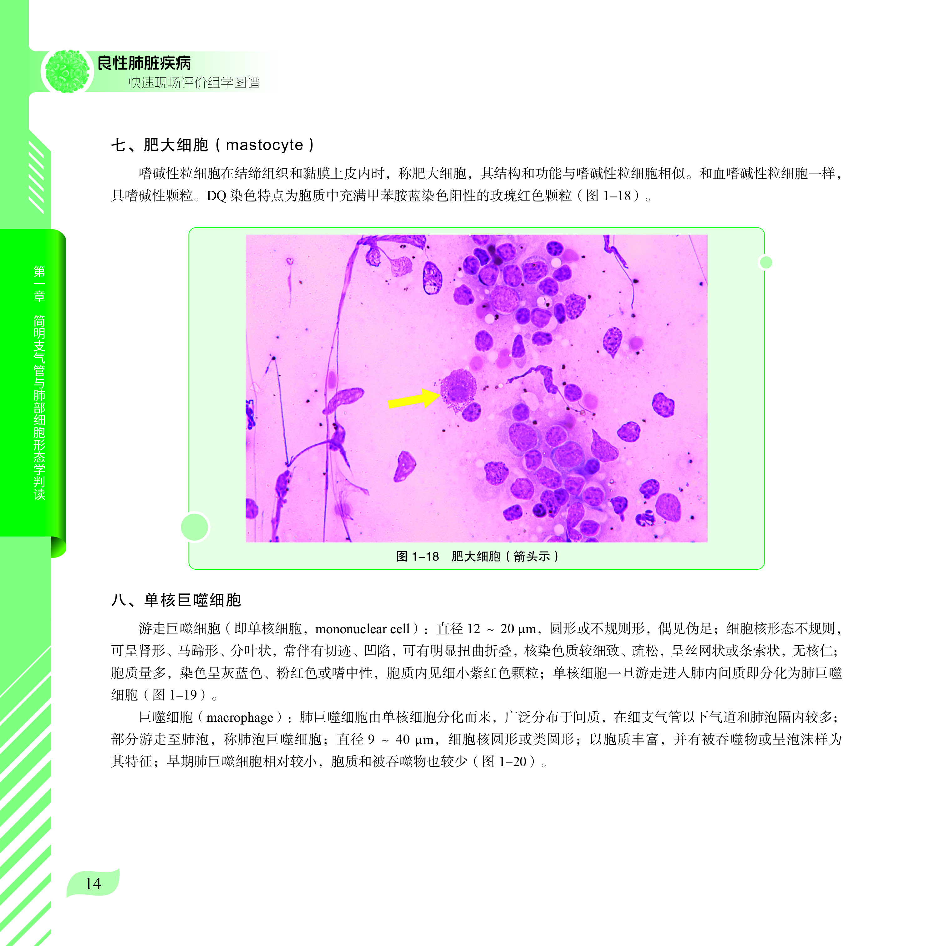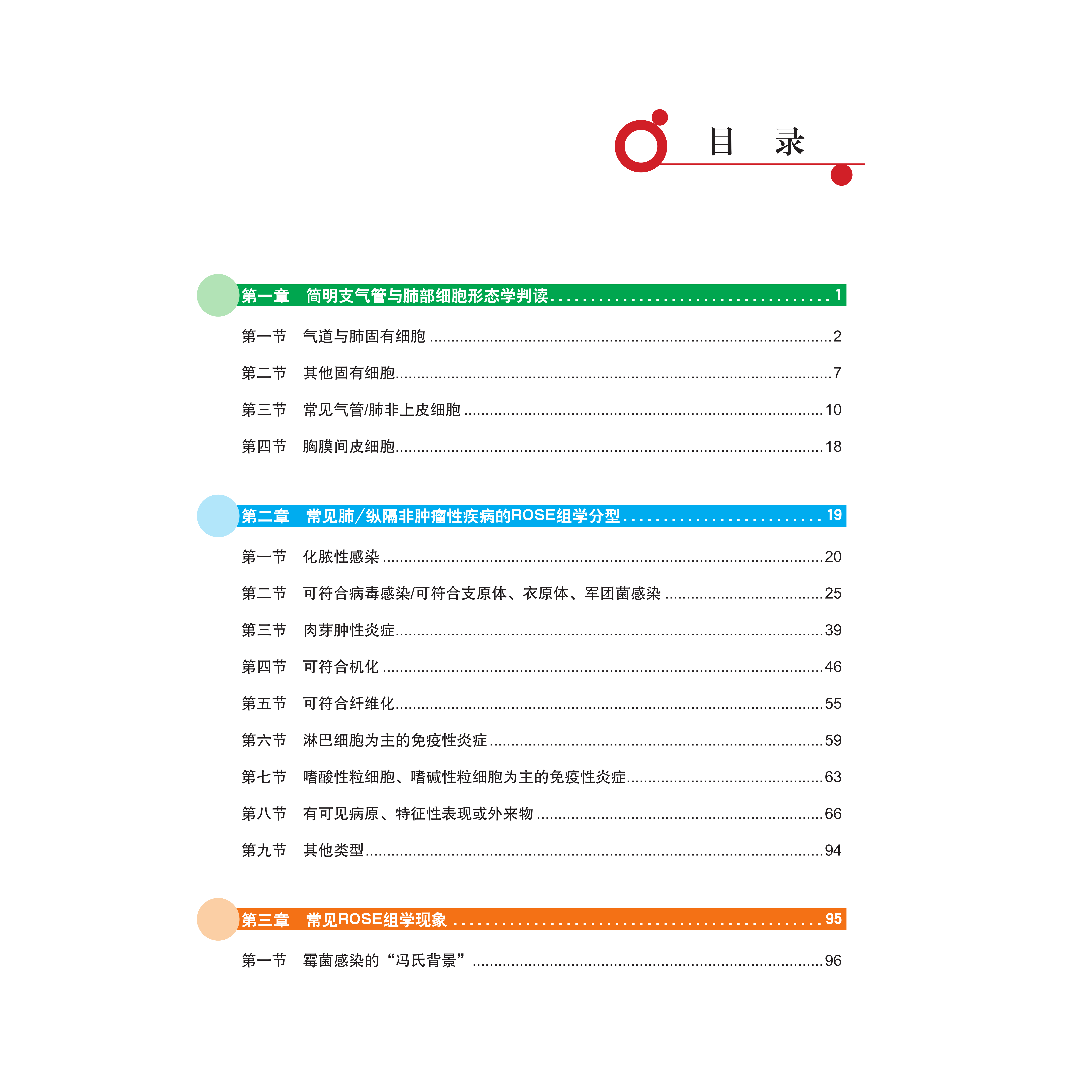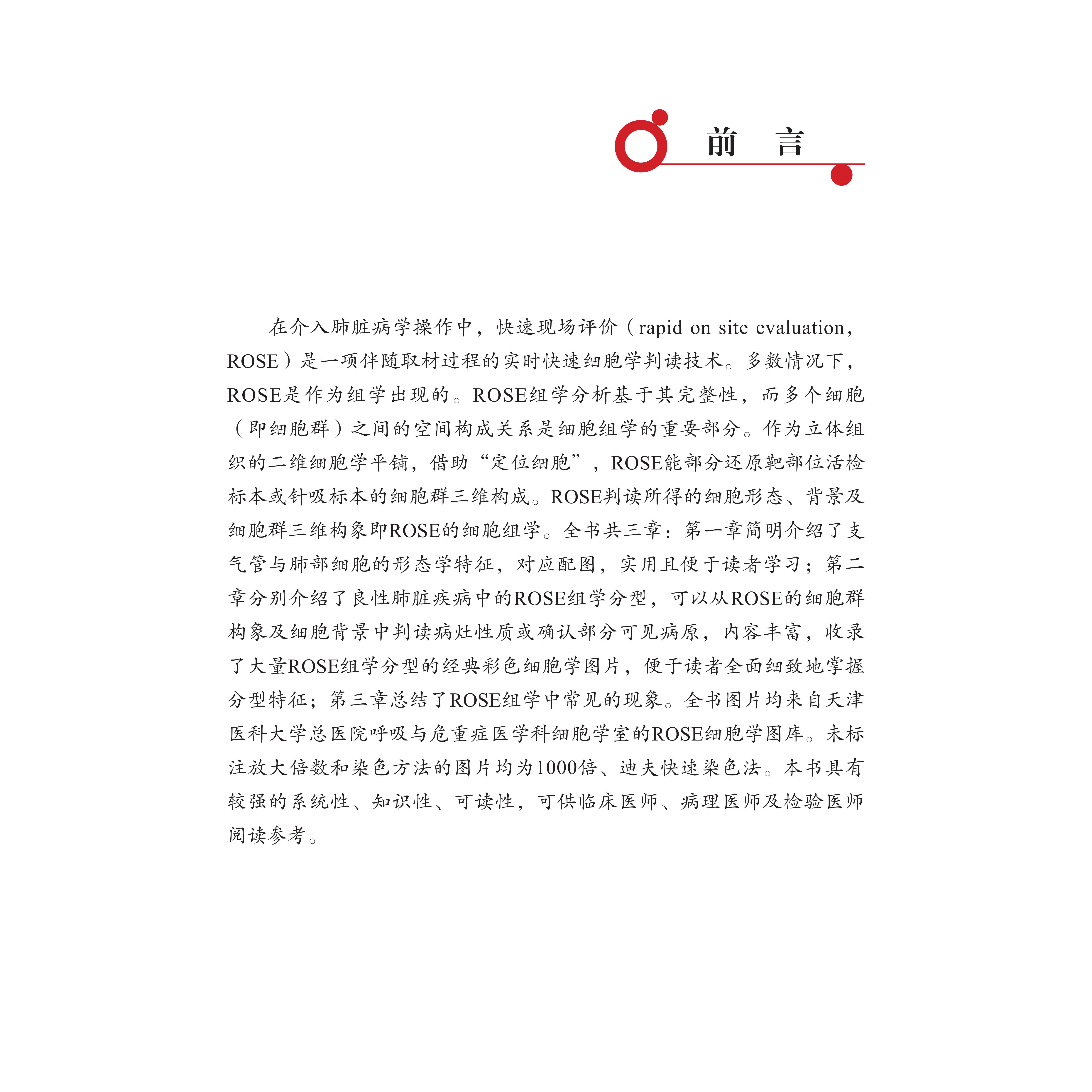 ROSE是作为组学出现的。ROSE组学分析基于其完整性,而多个细胞 (即细胞群)之间的空间构成关系是细胞组学的重要部分。作为立体组 织的二维细胞学平铺,借助“定位细胞”,ROSE能部分还原靶部位活检 标本或针吸标本的细胞群三维构成。ROSE判读所得的细胞形态、背景及 细胞群三维构象即ROSE的细胞组学。全书共三章:第一章简明介绍了支 气管与肺部细胞的形态学特征,对应配图,实用且便于读者学习;第二 章分别介绍了良性肺脏疾病中的ROSE组学分型,可以从ROSE的细胞群 构象及细胞背景中判读病灶性质或确认部分可见病原,内容丰富,收录 了大量ROSE组学分型的经典彩色细胞学图片,便于读者全面细致地掌握 分型特征;第三章总结了ROSE组学中常见的现象。全书图片均来自天津 医科大学总医院呼吸与危重症医学科细胞学室的ROSE细胞学图库。未标 注放大倍数和染色方法的图片均为1000倍、迪夫快速染色法。本书具有 较强的系统性、知识性、可读性,可供临床医师、病理医师及检验医师 阅读参考。