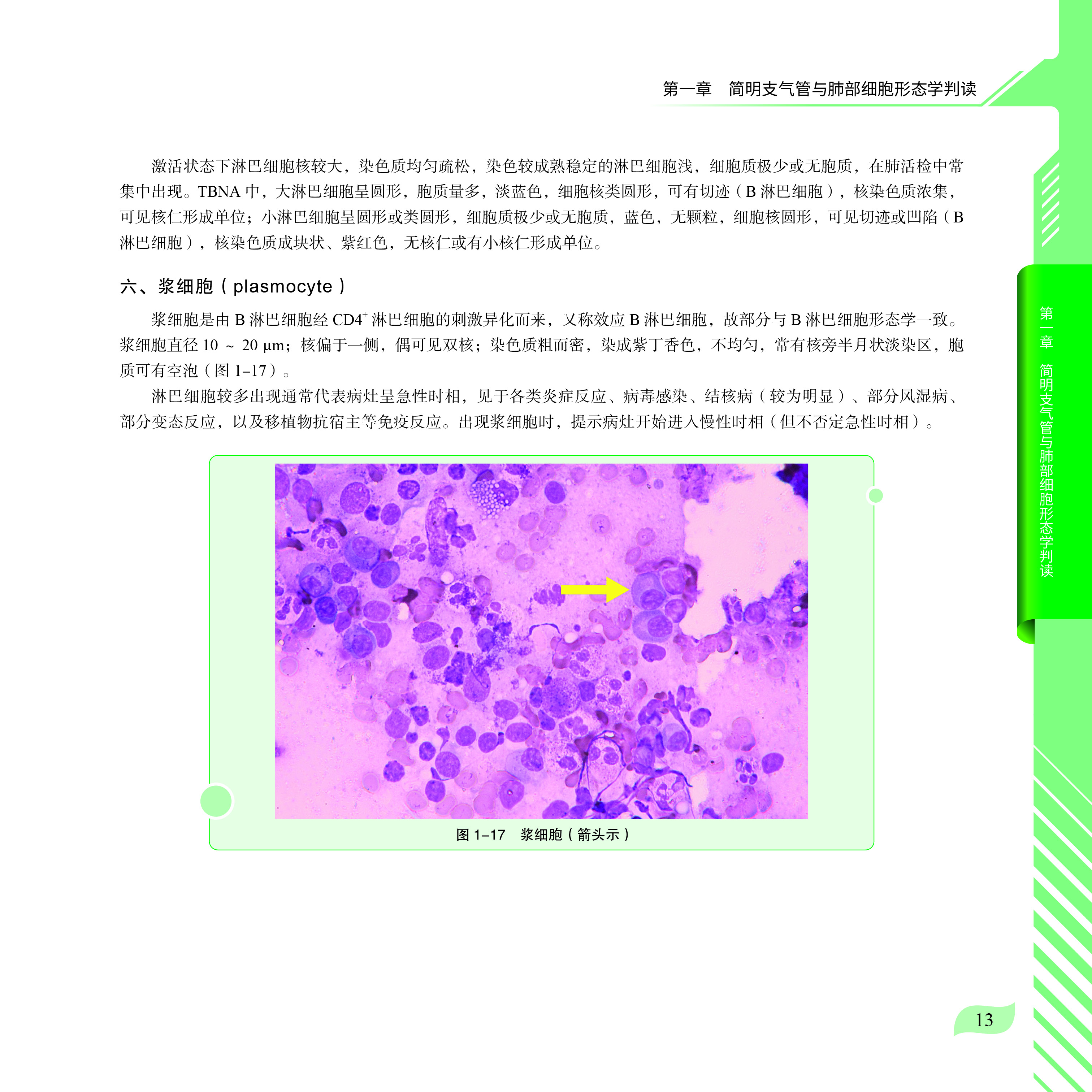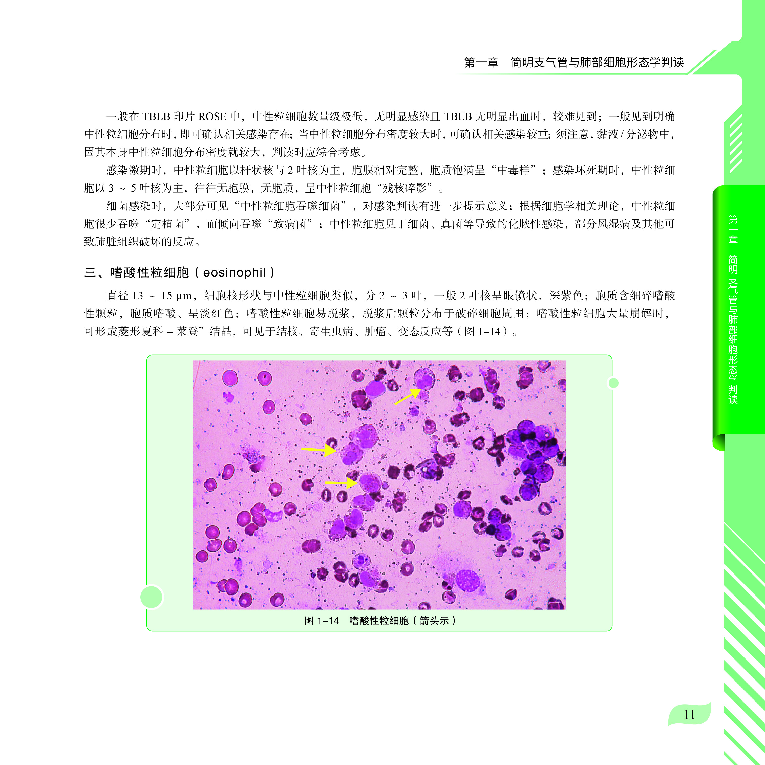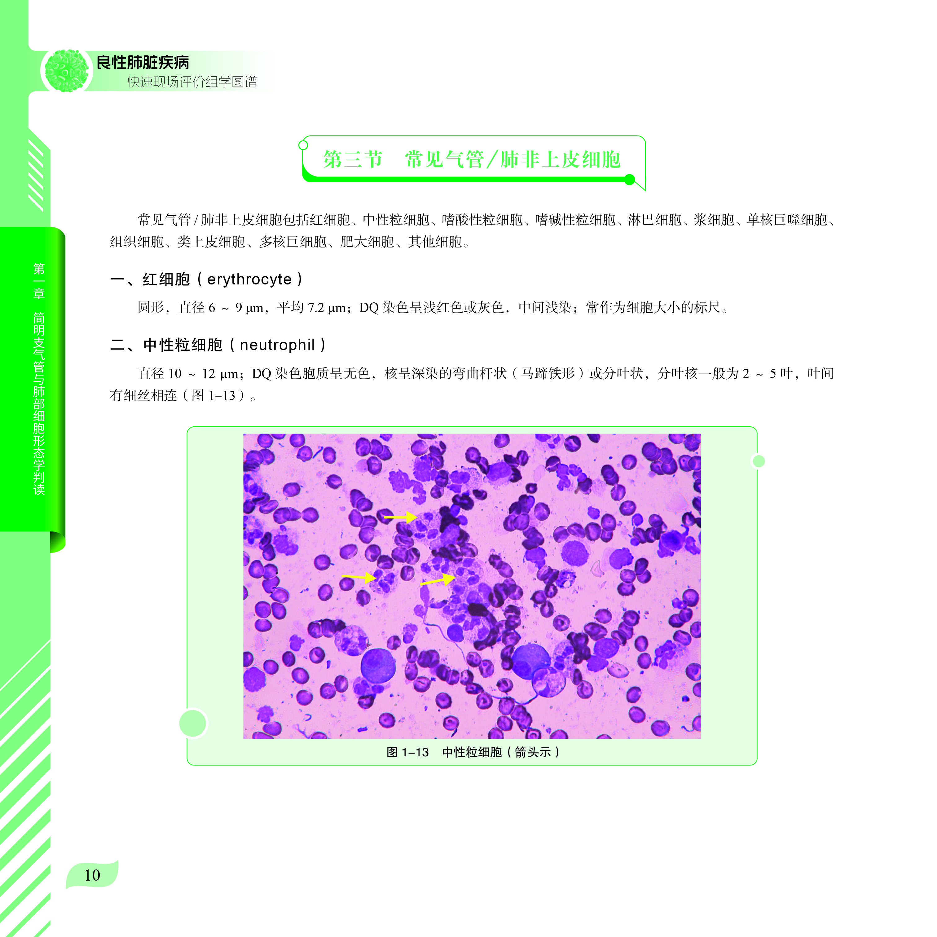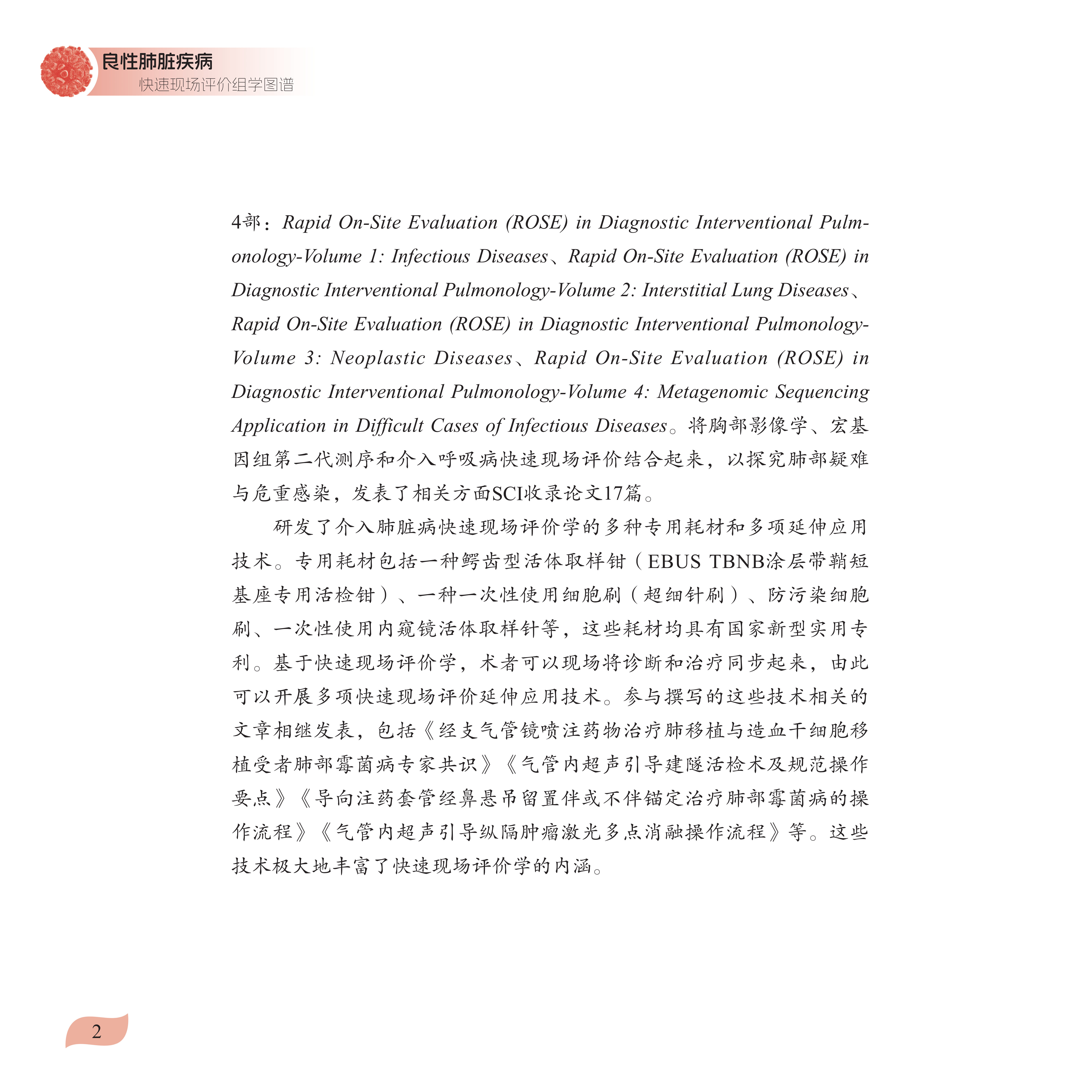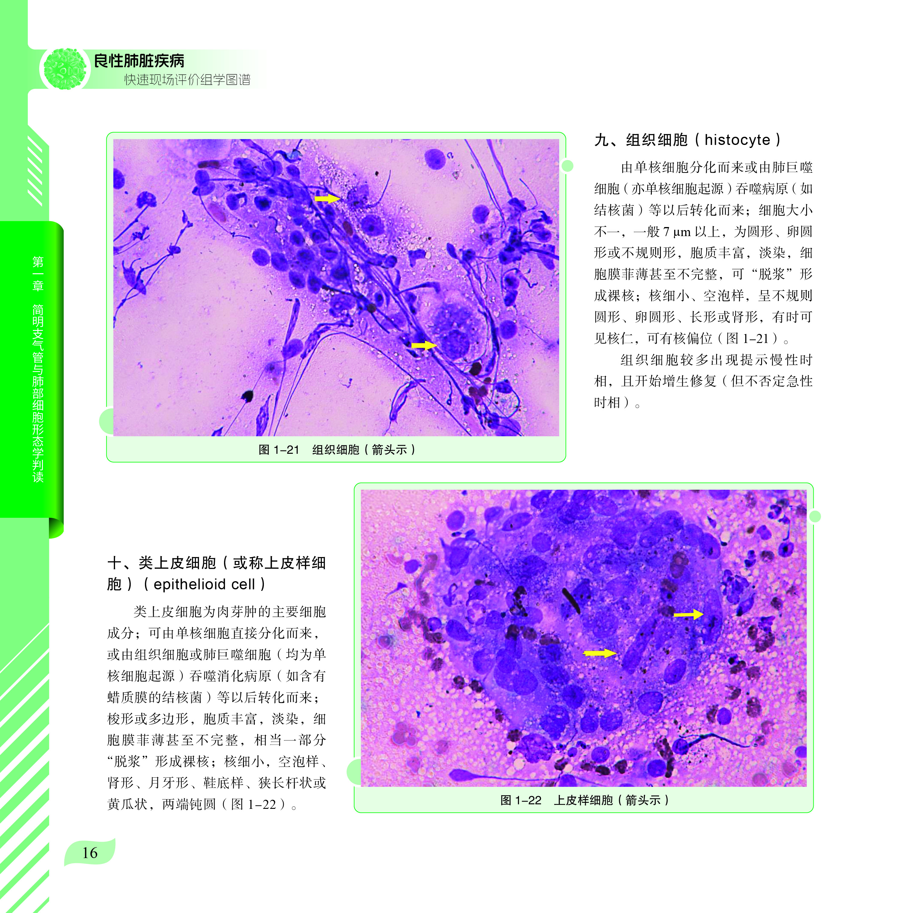 ROSE是作为组学出现的。ROSE组学分析基于其完整性,而多个细胞 (即细胞群)之间的空间构成关系是细胞组学的重要部分。作为立体组 织的二维细胞学平铺,借助“定位细胞”,ROSE能部分还原靶部位活检 标本或针吸标本的细胞群三维构成。ROSE判读所得的细胞形态、背景及 细胞群三维构象即ROSE的细胞组学。全书共三章:第一章简明介绍了支 气管与肺部细胞的形态学特征,对应配图,实用且便于读者学习;第二 章分别介绍了良性肺脏疾病中的ROSE组学分型,可以从ROSE的细胞群 构象及细胞背景中判读病灶性质或确认部分可见病原,内容丰富,收录 了大量ROSE组学分型的经典彩色细胞学图片,便于读者全面细致地掌握 分型特征;第三章总结了ROSE组学中常见的现象。全书图片均来自天津 医科大学总医院呼吸与危重症医学科细胞学室的ROSE细胞学图库。未标 注放大倍数和染色方法的图片均为1000倍、迪夫快速染色法。本书具有 较强的系统性、知识性、可读性,可供临床医师、病理医师及检验医师 阅读参考。