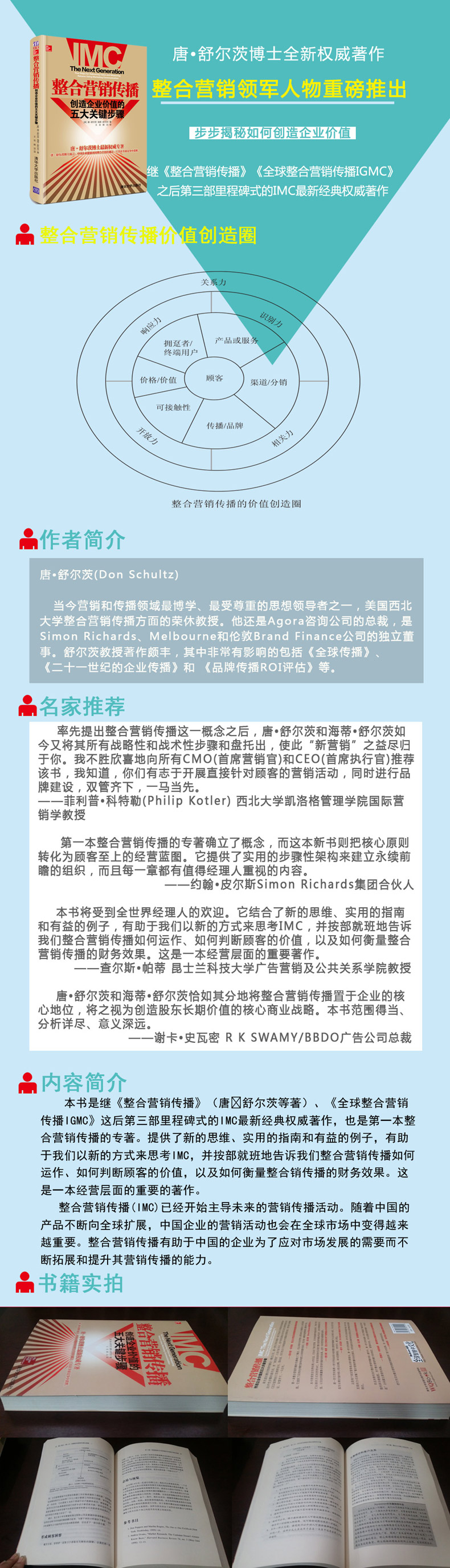 - 该书提供了新的思维、实用的指南和有益的例子,有助于我们以新的方式来思考IMC,并按部就班地告诉我们整合营销传播如何运作、如何判断顾客的价值,以及如何衡量整合销传播的财务效果。
