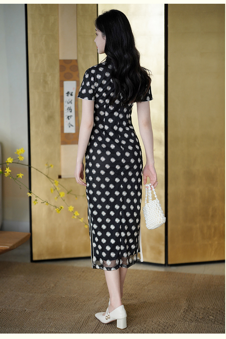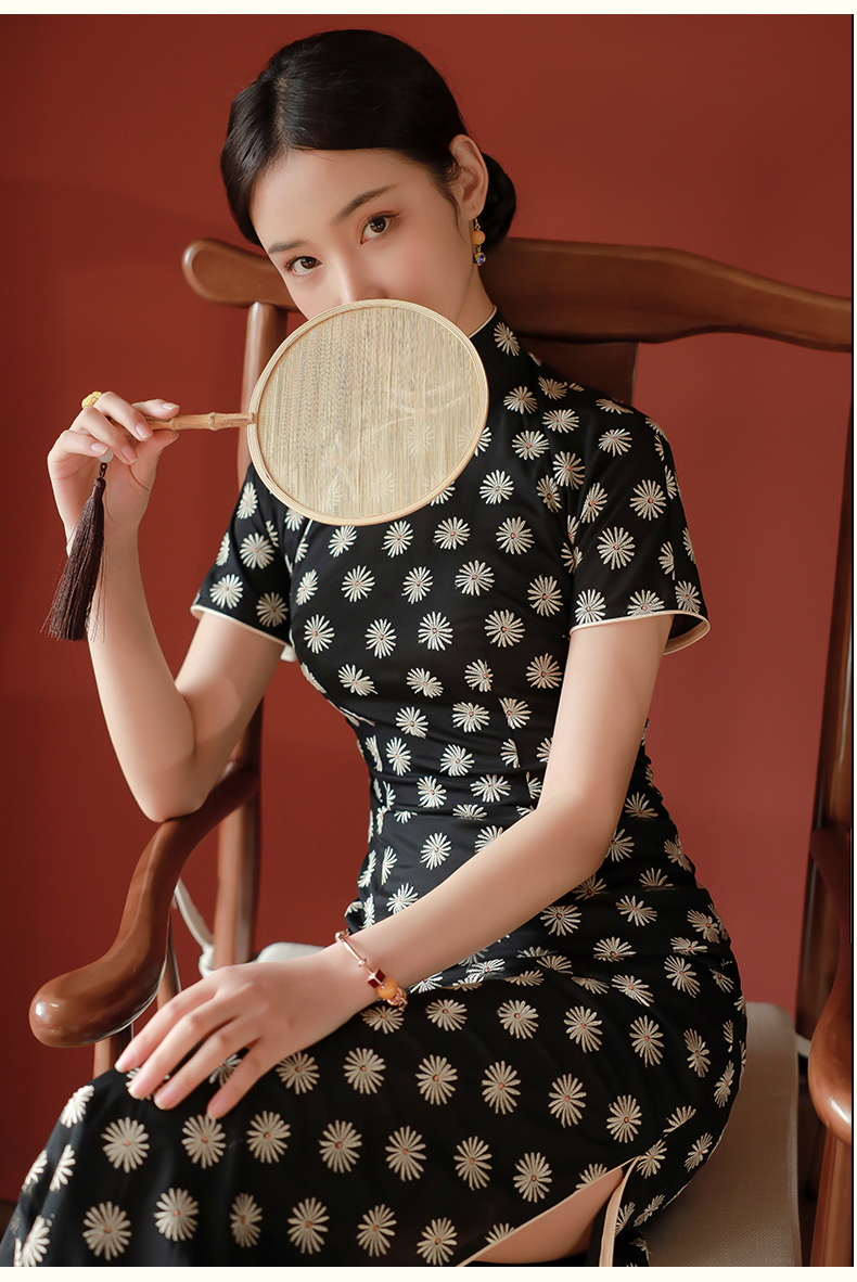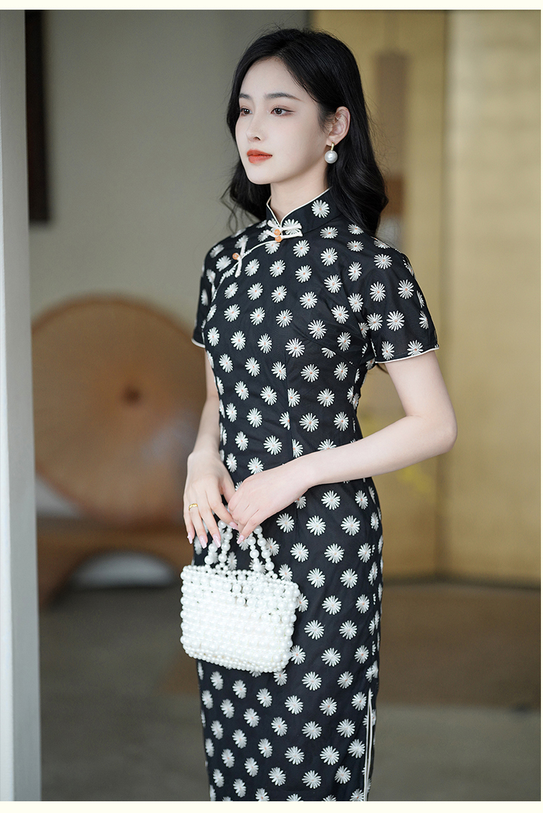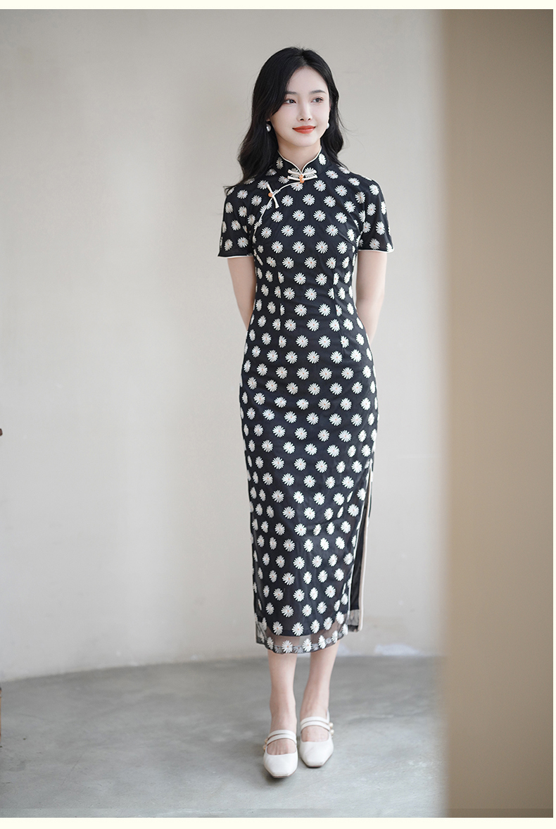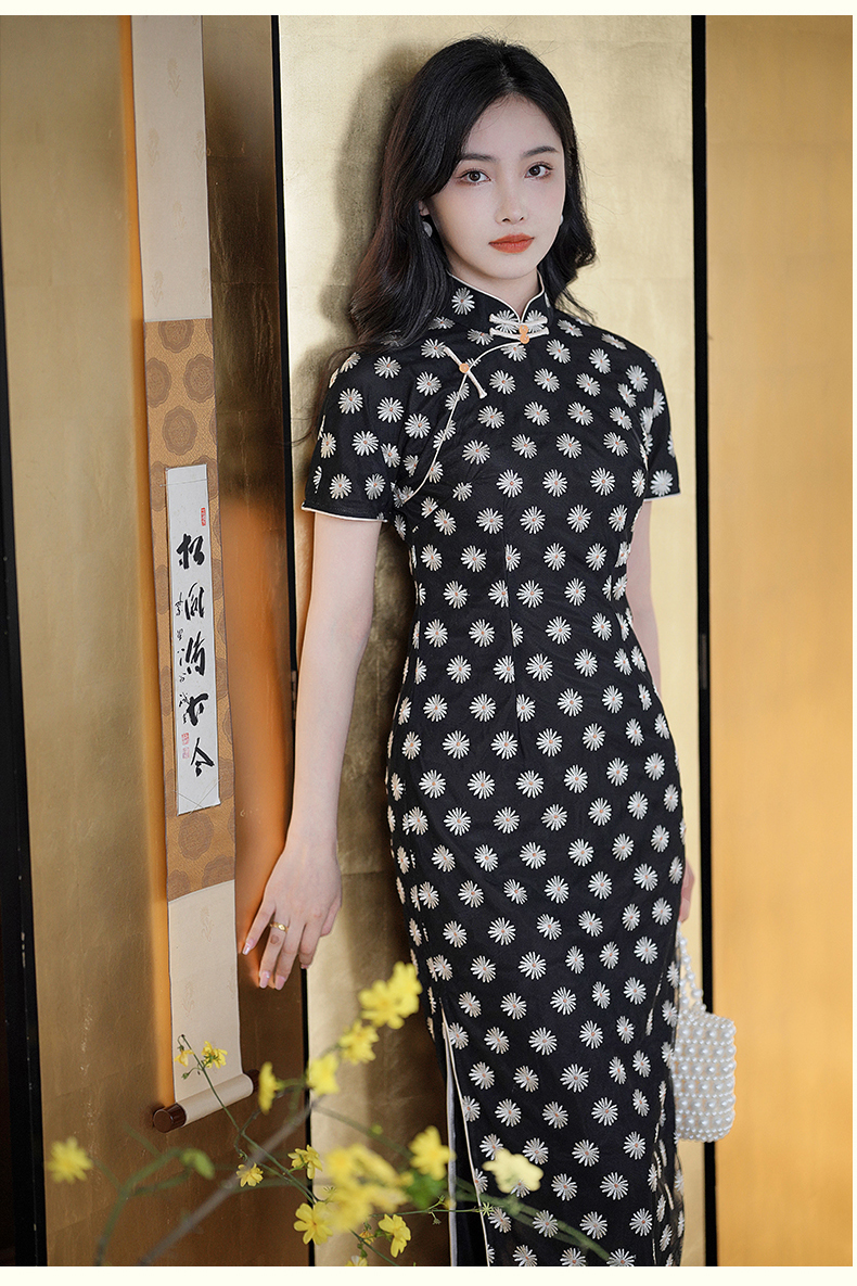 逸红颜如菊2025春夏新款弹力中长款复古民国风小雏菊短袖黑色旗袍