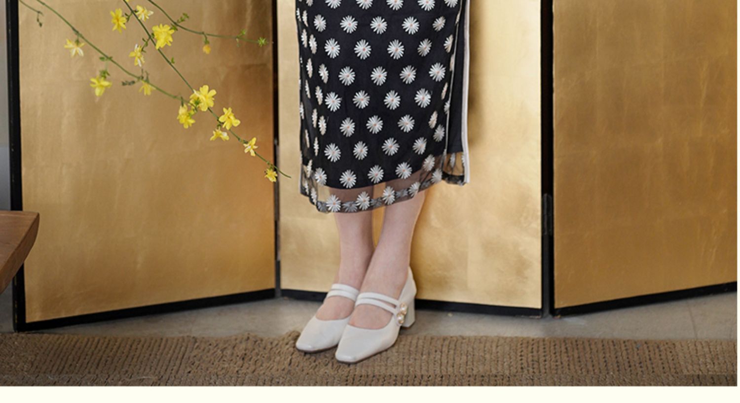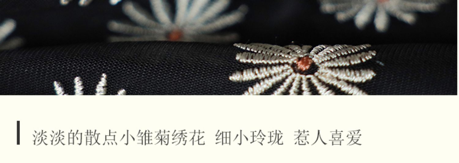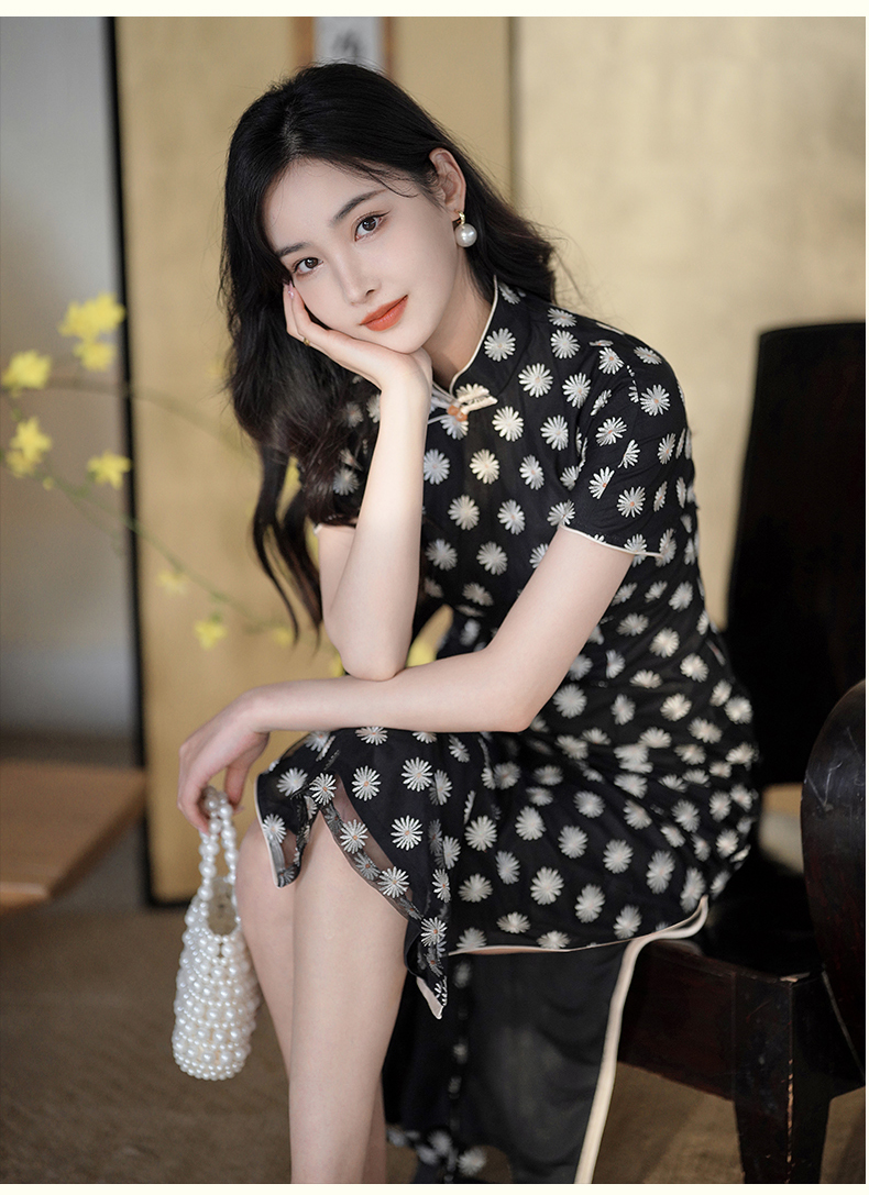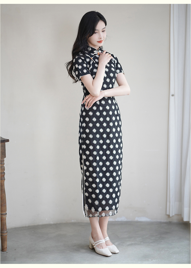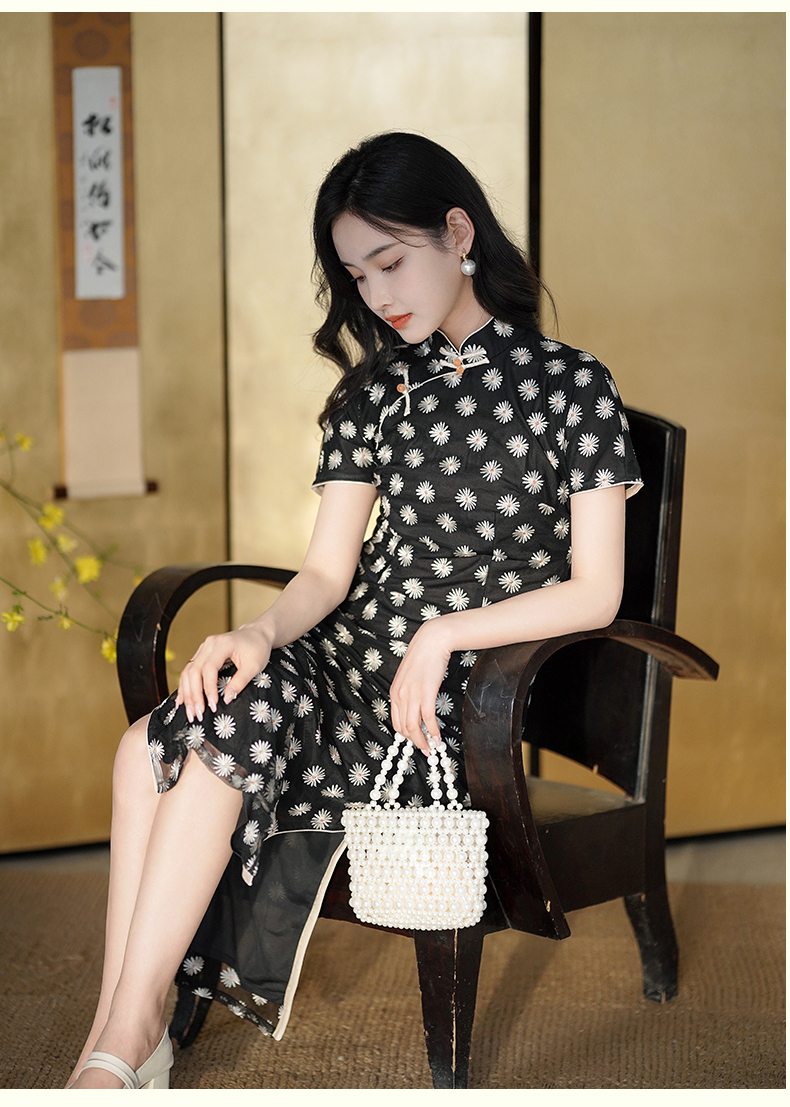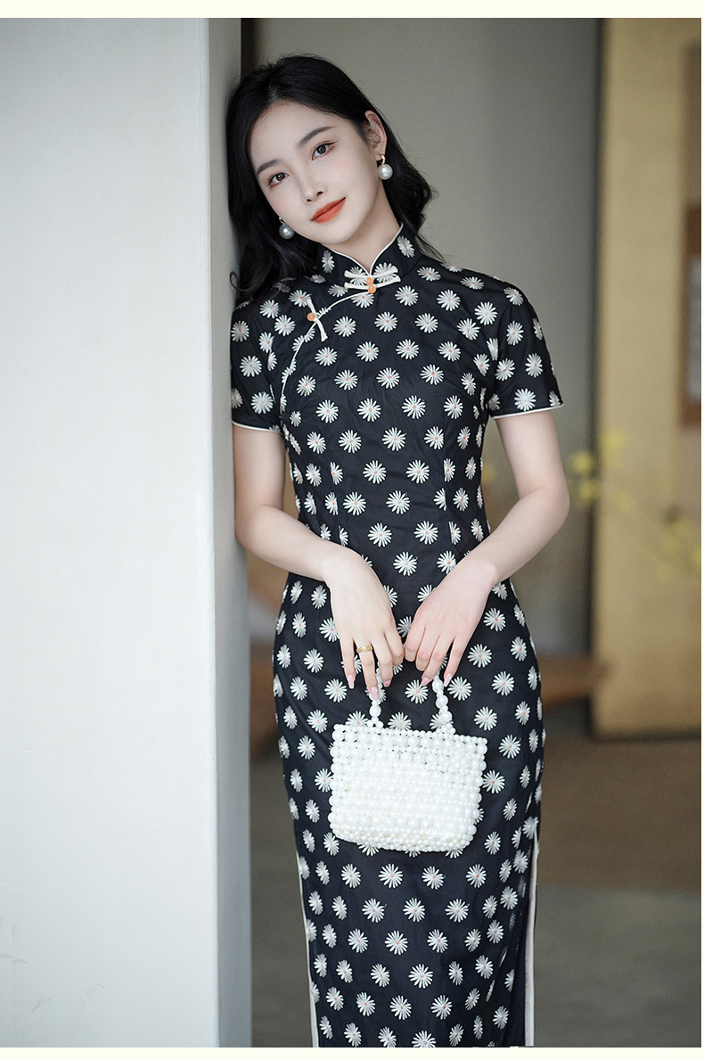 逸红颜如菊2025春夏新款弹力中长款复古民国风小雏菊短袖黑色旗袍