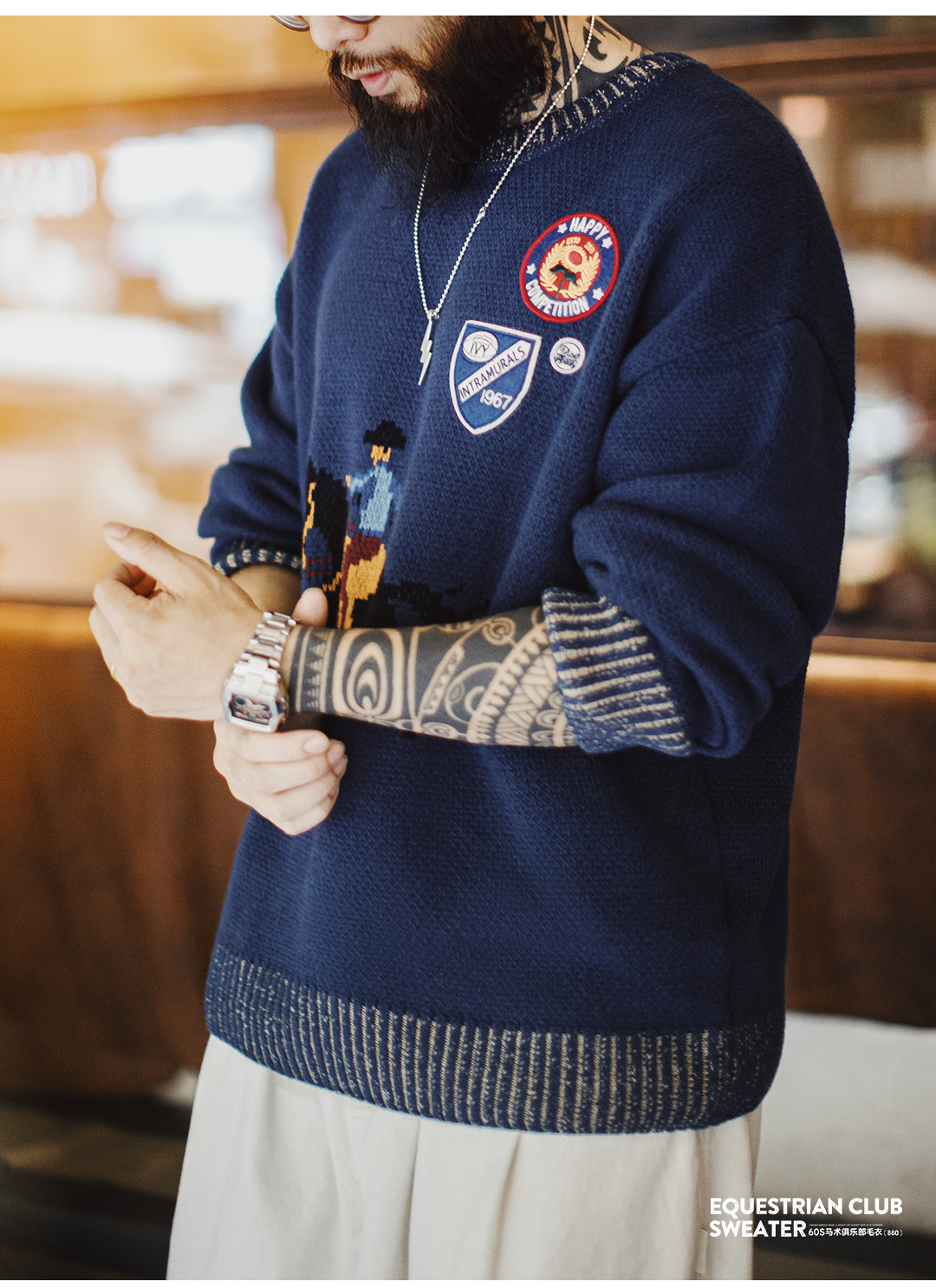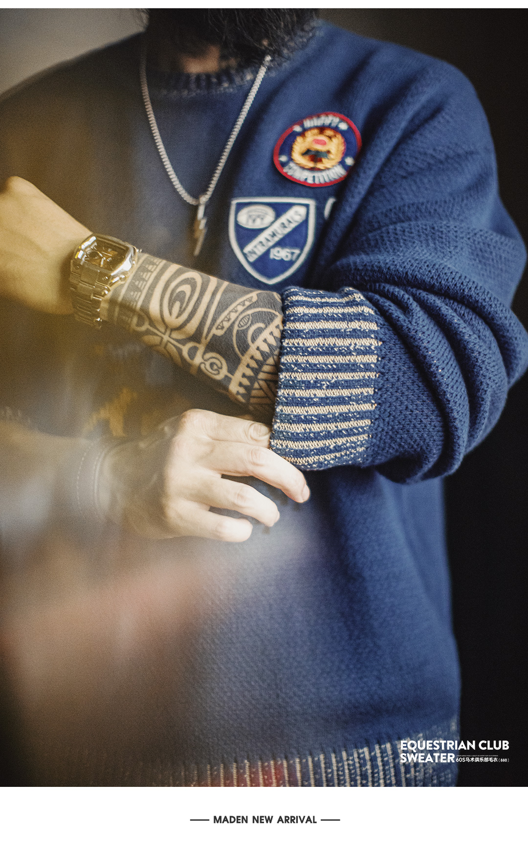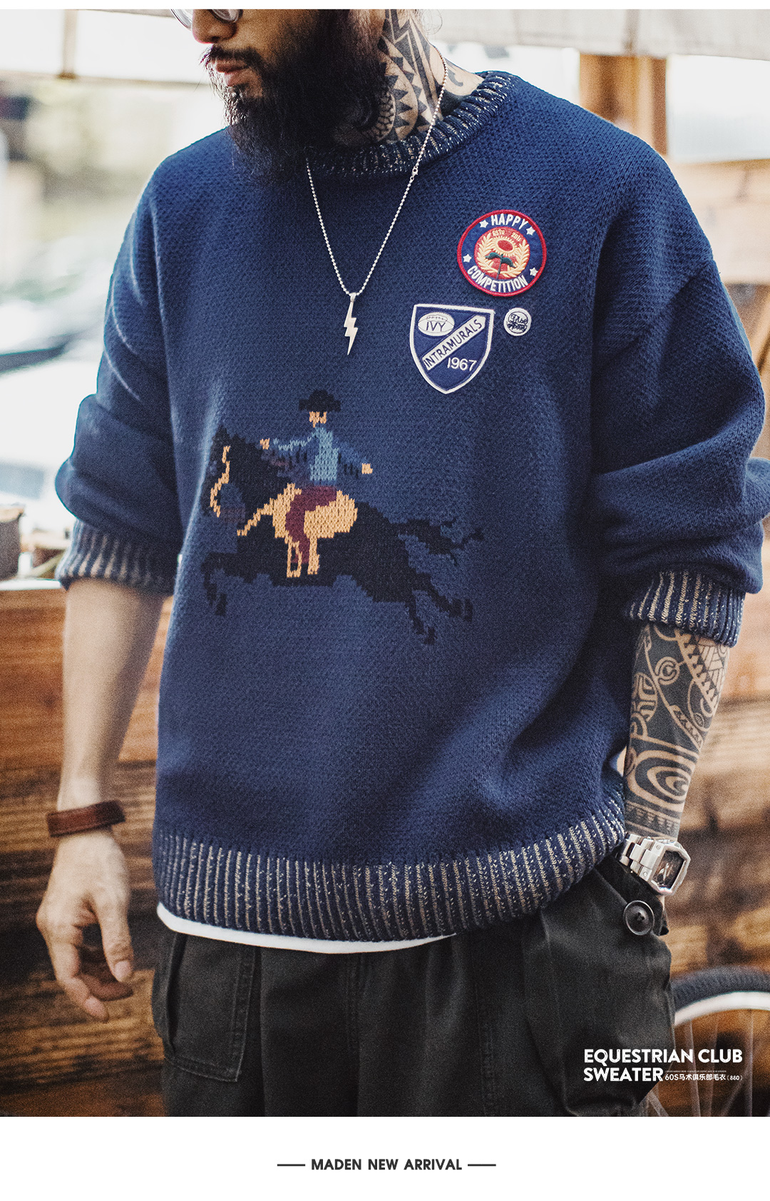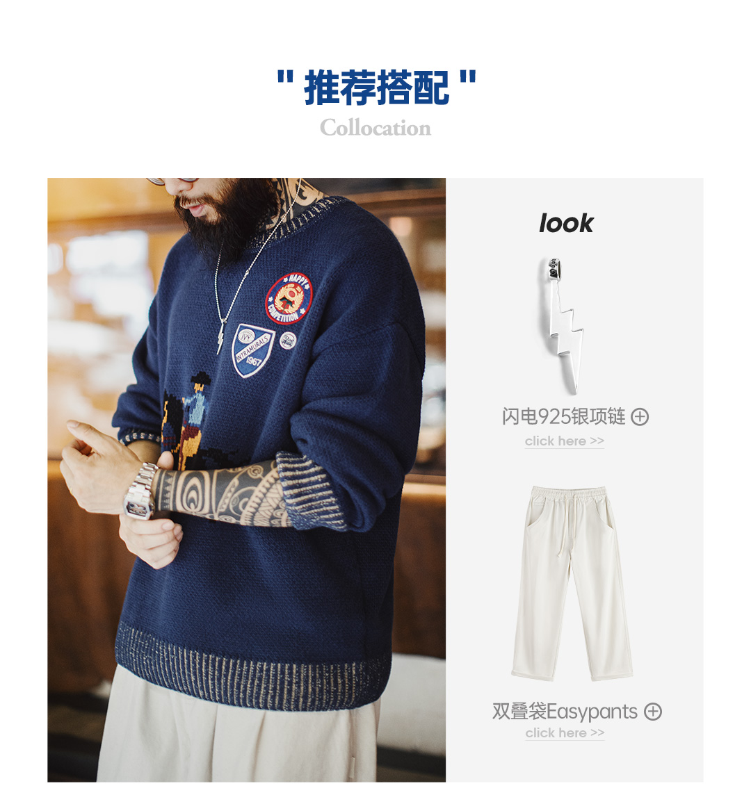 马登工装美式复古刺绣撞色毛衣保暖撞色外穿螺纹领口针织衫男秋冬