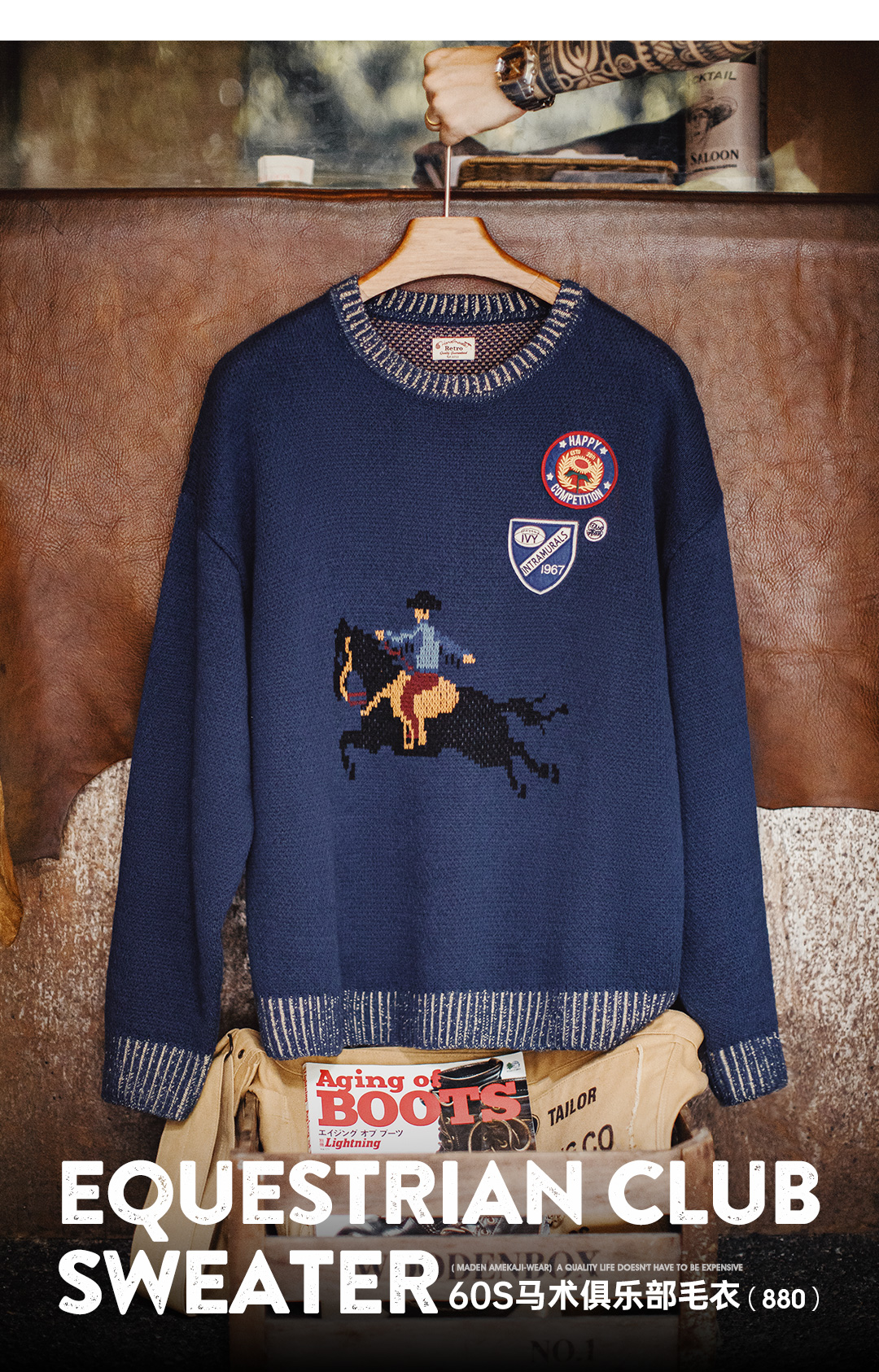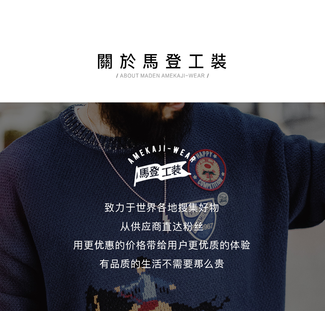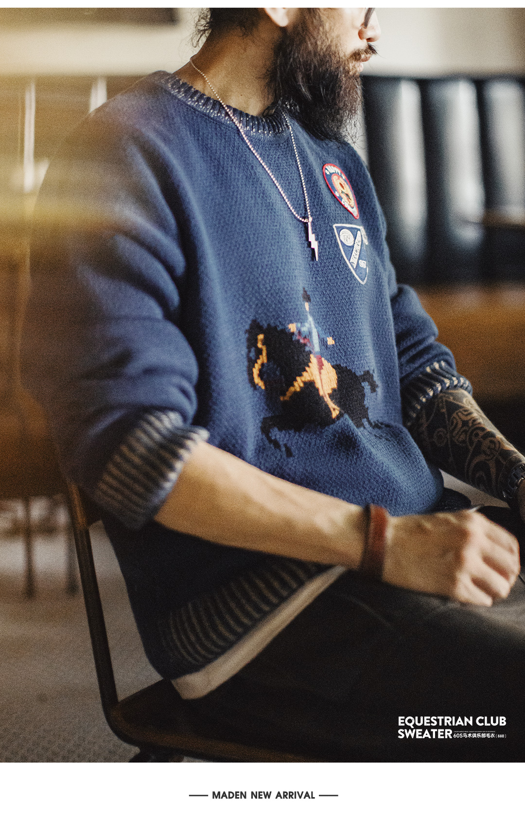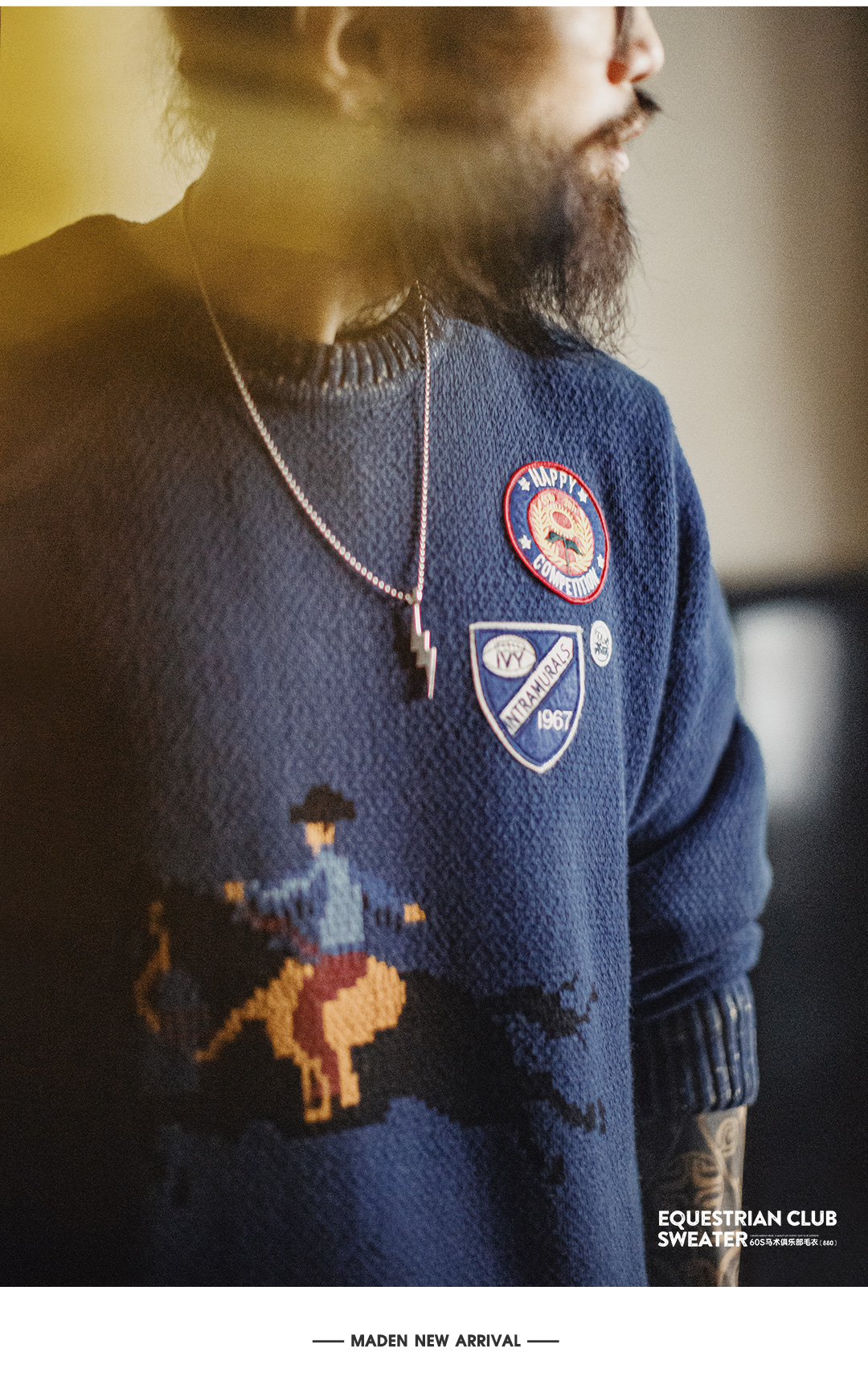 马登工装美式复古刺绣撞色毛衣保暖撞色外穿螺纹领口针织衫男秋冬