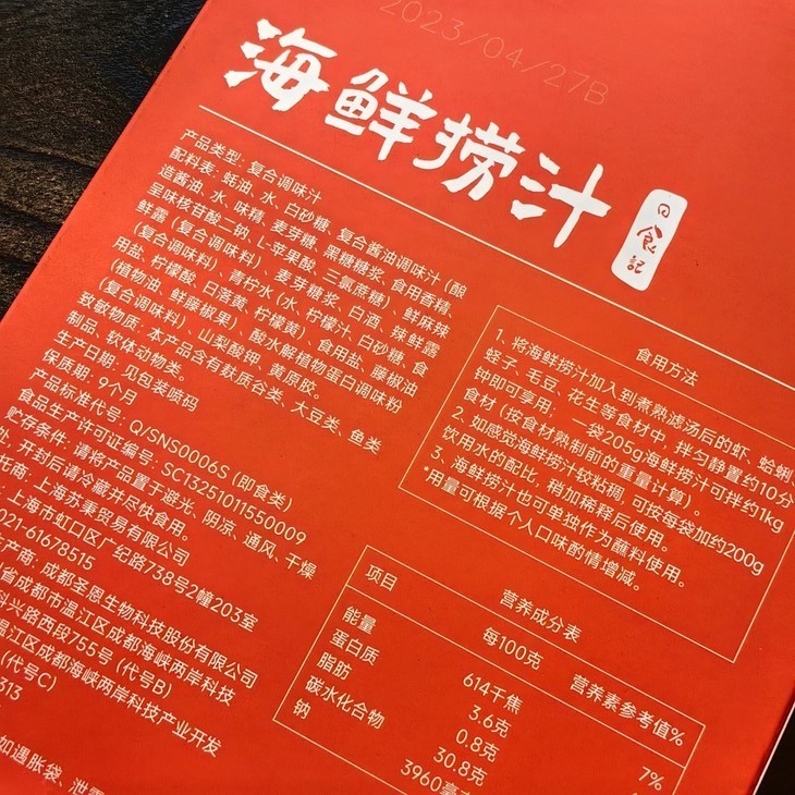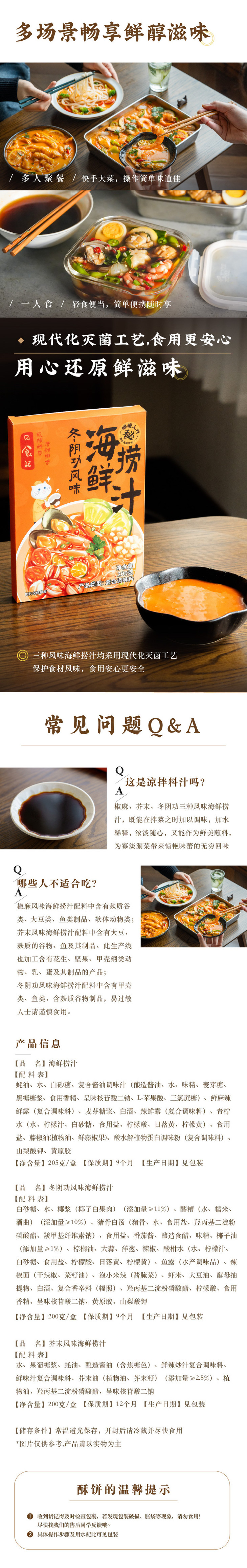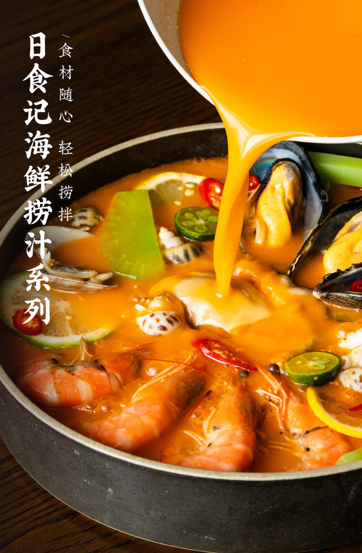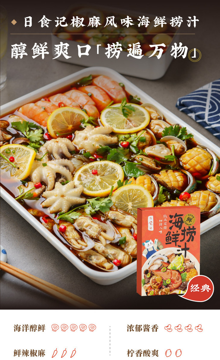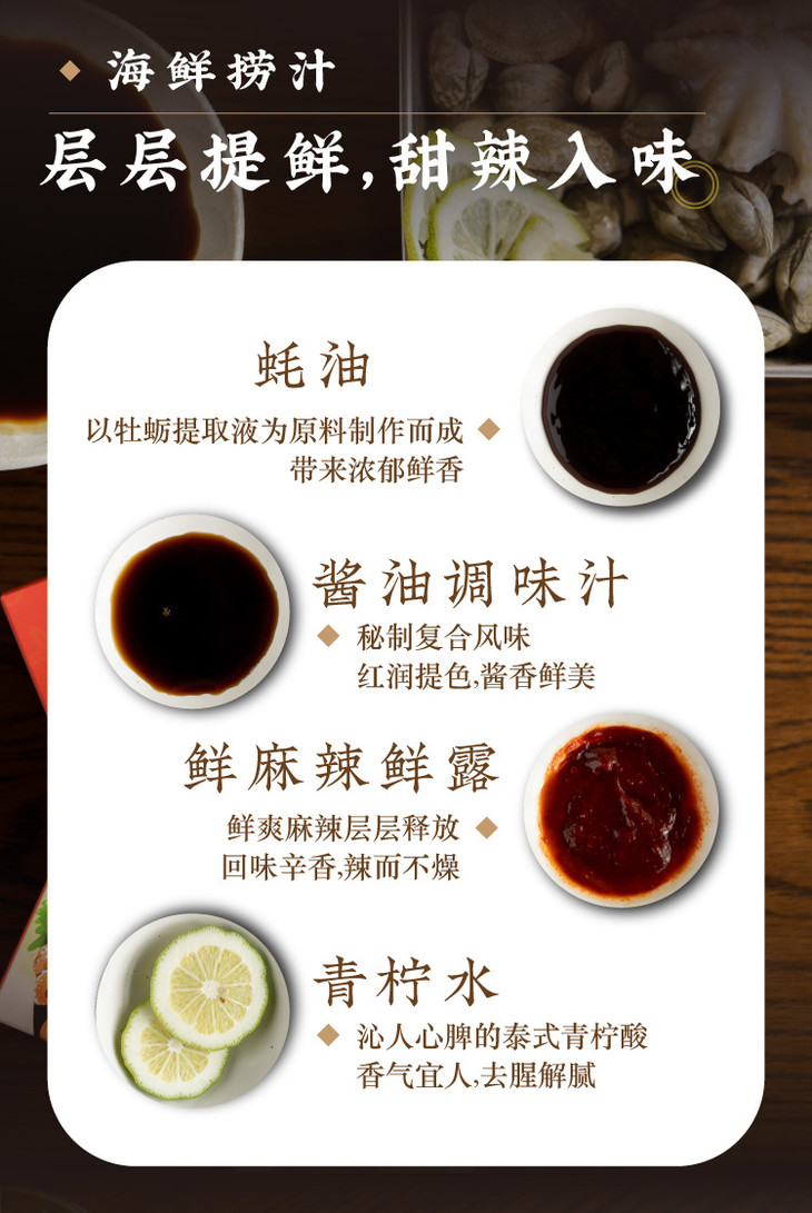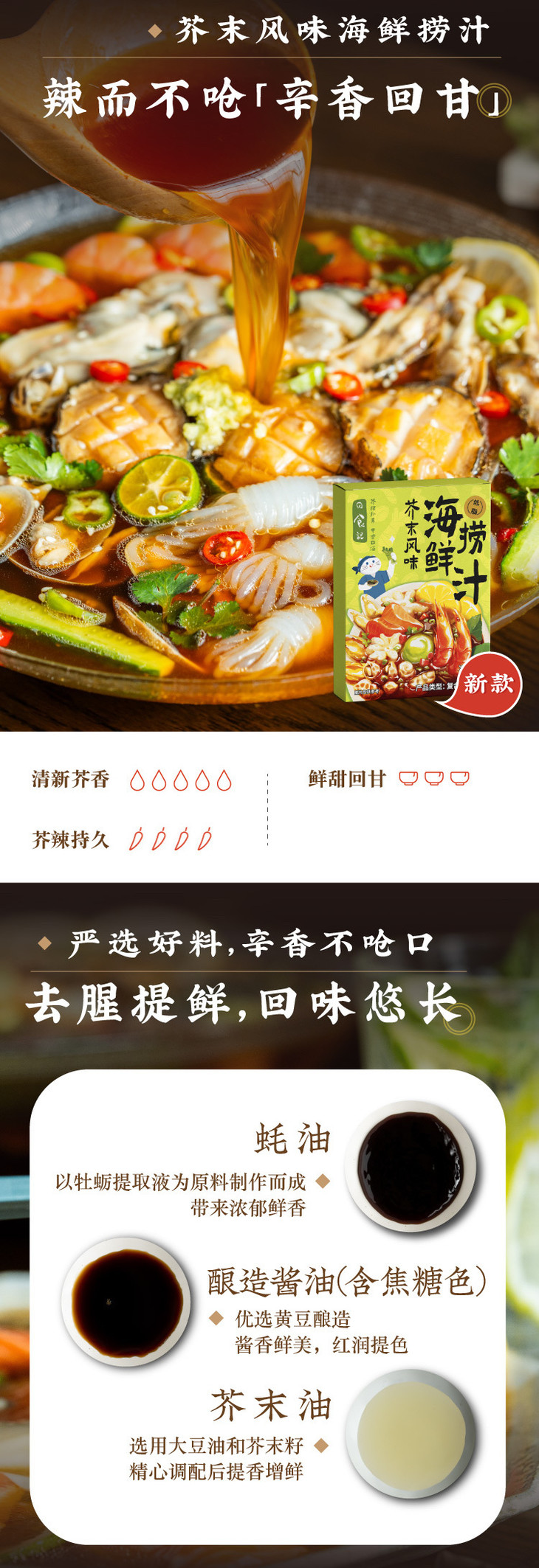 海鲜捞汁的配方很是优秀!由牡蛎经过煮熟、取汁、浓缩制成蚝油,能激发出海鲜本身的鲜味;自研复合酱油调味汁,酱香浓郁,入口咸鲜,更适合凉拌;再将辣椒的辣味与花椒的鲜麻巧妙融合,精确的添加比例制成麻辣鲜露,醇厚平衡,不仅很好的帮助菜肴提升口感,还能发挥去腥增香作用;最后加入青柠水作为主要酸度调节剂,自然酸甜风味带着清新的回甘,富含的芳香成分不仅祛除菜品中的腥味,还特别解腻!制作时严格遵循巴氏杀菌工艺,90℃以下精确控温,相对较低的生产温度,尽可能避免高温破坏食材风味,还原鲜滋味,吃起来也安心!