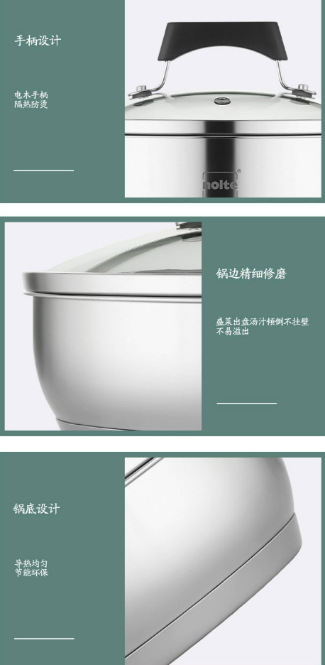1.产品采用符合国家安全标准的430材质精致而成,锅身采用外砂内亮的抛光工艺处理,手柄采用新款的电木手柄隔热防烫。