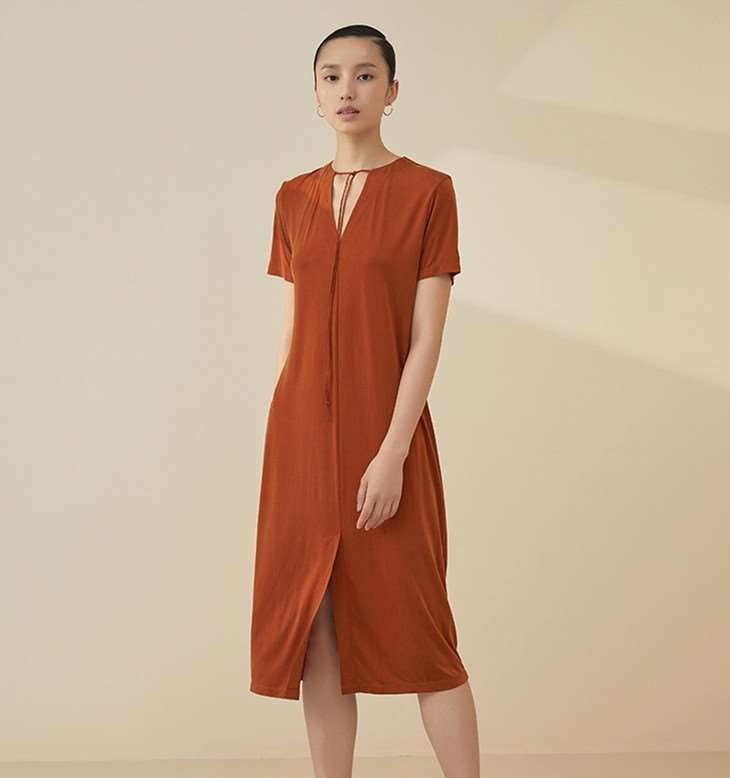 除了衬衫裙,物道君还推荐一款来自子时LER的铜氨丝连衣裙。