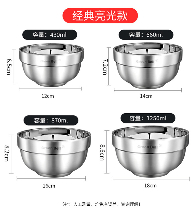 【SGS食品级,绿贝316不锈钢双层碗】不锈钢隔烫双层碗坚固耐用,洗碗机消毒柜可用,大容量加厚隔热防摔学生成人学校食堂饭汤碗QQ