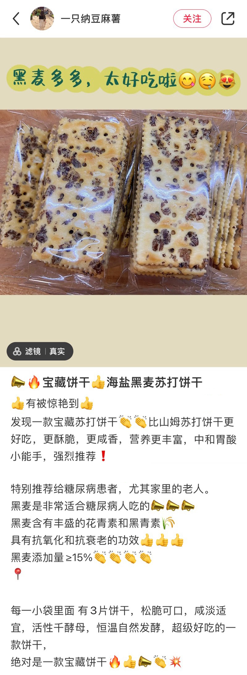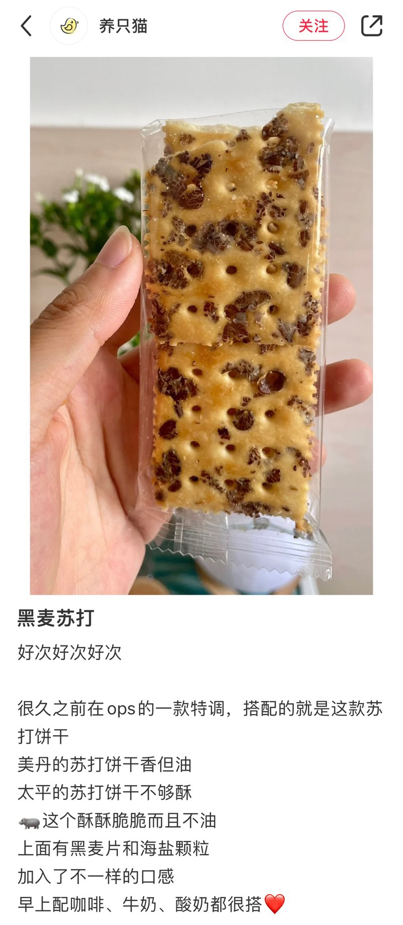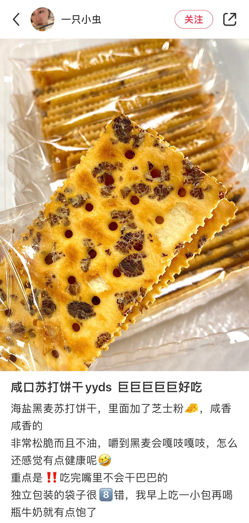 一袋黑麦海盐饼干有180g,分为8小袋。深褐色的黑麦片随机嵌在金黄色的饼干上,外形就很加分!麦香味,加上黄油的浓郁奶香味,以及海盐的咸香味互相交织,越嚼越香,忍不住吃完半包!本来每次来样品都会分一半给阿姨的,这次没有,全都留下!它不像消化饼干的那样敦敦实实,而是酥中有脆,一点也不觉得干噎。