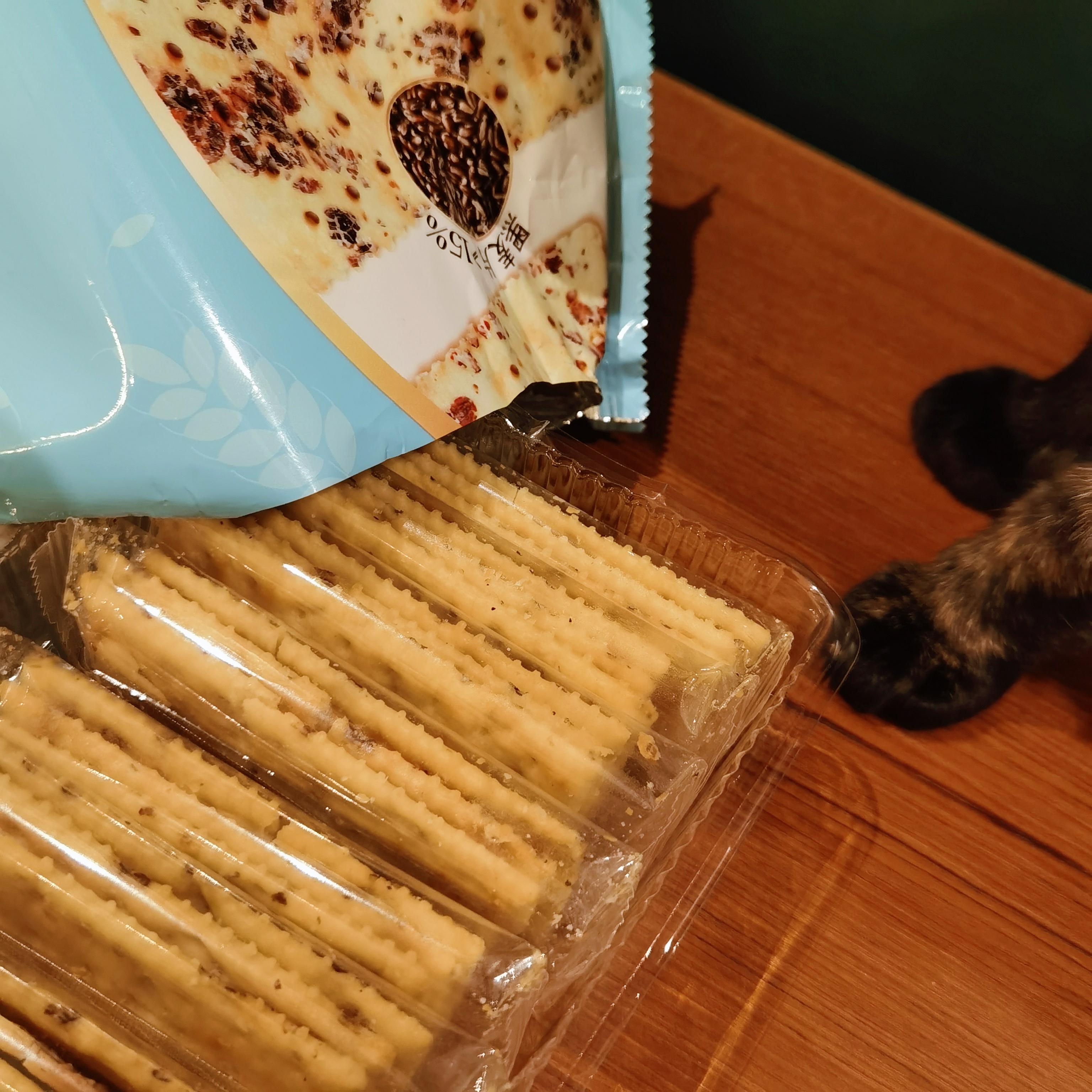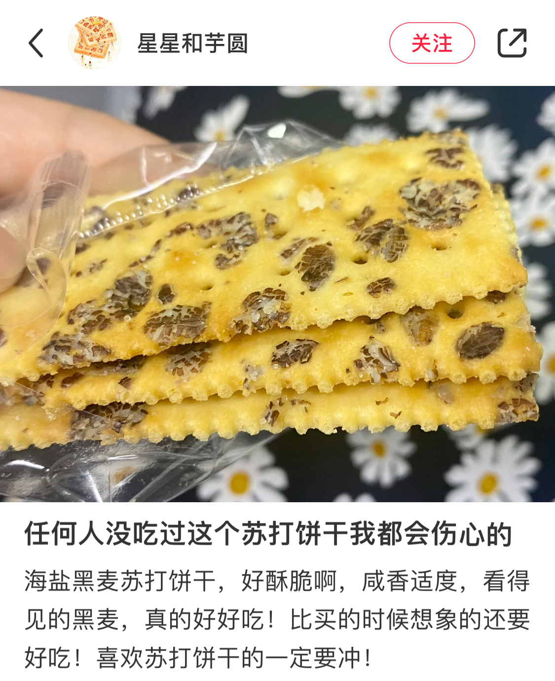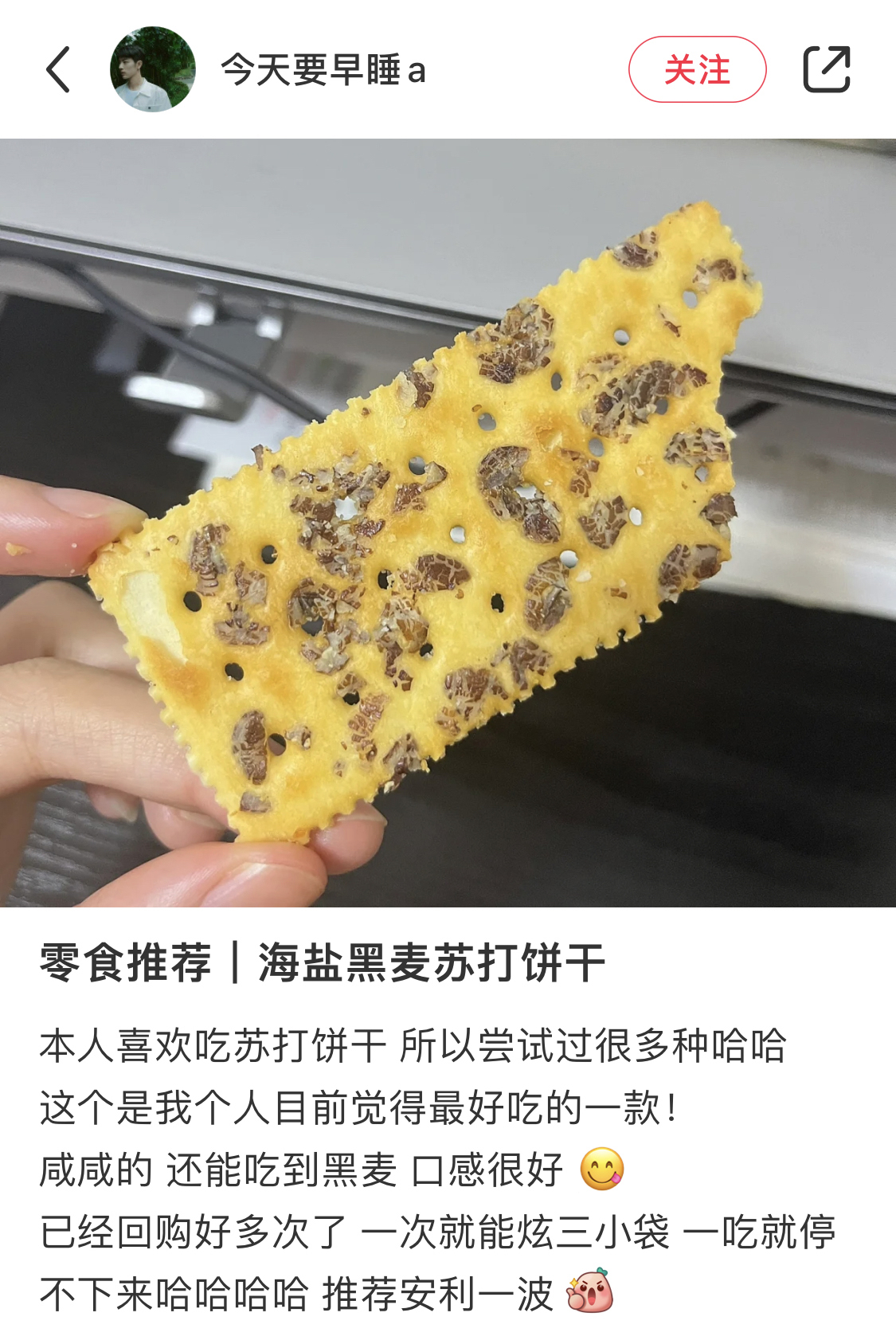 一袋黑麦海盐饼干有180g,分为8小袋。深褐色的黑麦片随机嵌在金黄色的饼干上,外形就很加分!麦香味,加上黄油的浓郁奶香味,以及海盐的咸香味互相交织,越嚼越香,忍不住吃完半包!本来每次来样品都会分一半给阿姨的,这次没有,全都留下!它不像消化饼干的那样敦敦实实,而是酥中有脆,一点也不觉得干噎。