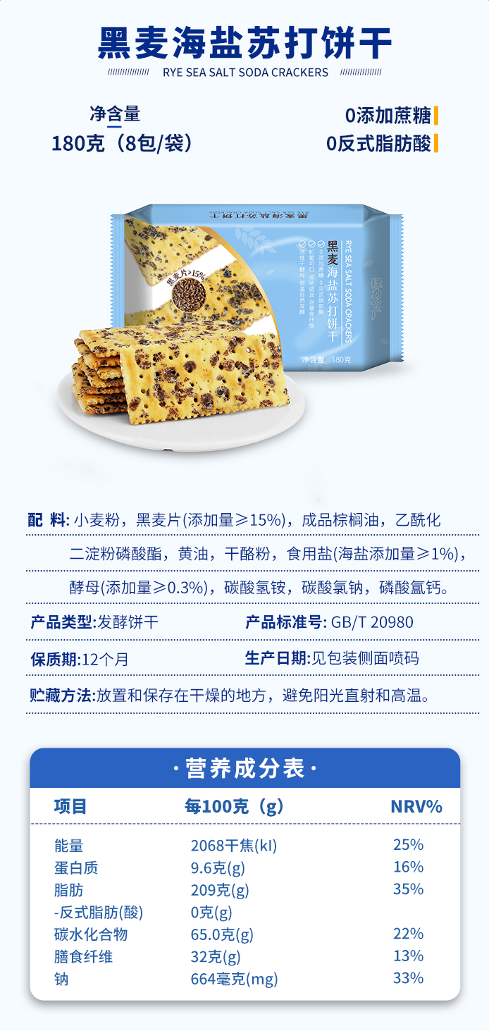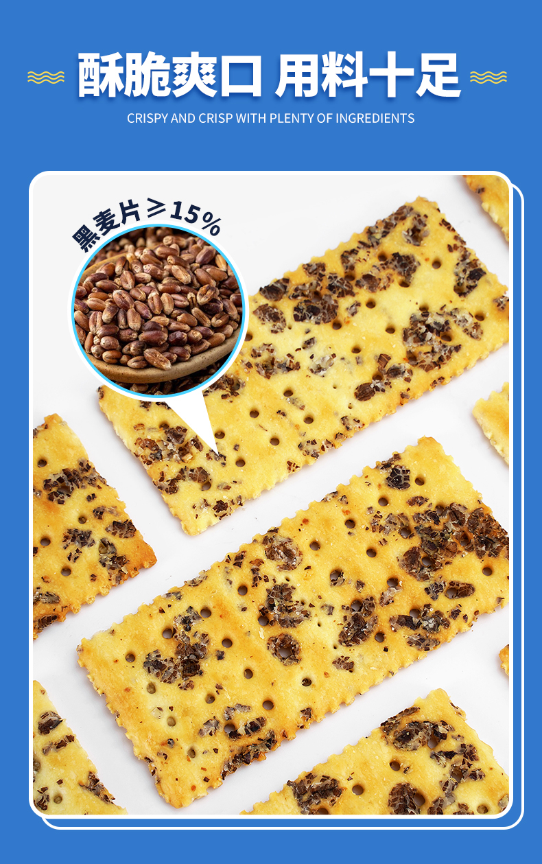 苏打饼一直是超市货架上的标配,但大多有个通病,就是入口太干,但怪力食厂黑麦饼干做到了例外!精选优质小麦、阿根廷黑麦、新西兰黄油、精选海盐和干酪粉为主要原料,光黑麦片就高达15%,使“黑麦”这个词不再是噱头,而是货真价实的存在!制作过程中,怪力食厂还采用活性干酵母恒温自然发酵,使得饼干的酥硬程度刚刚好,0添加蔗糖,0反式脂肪酸!