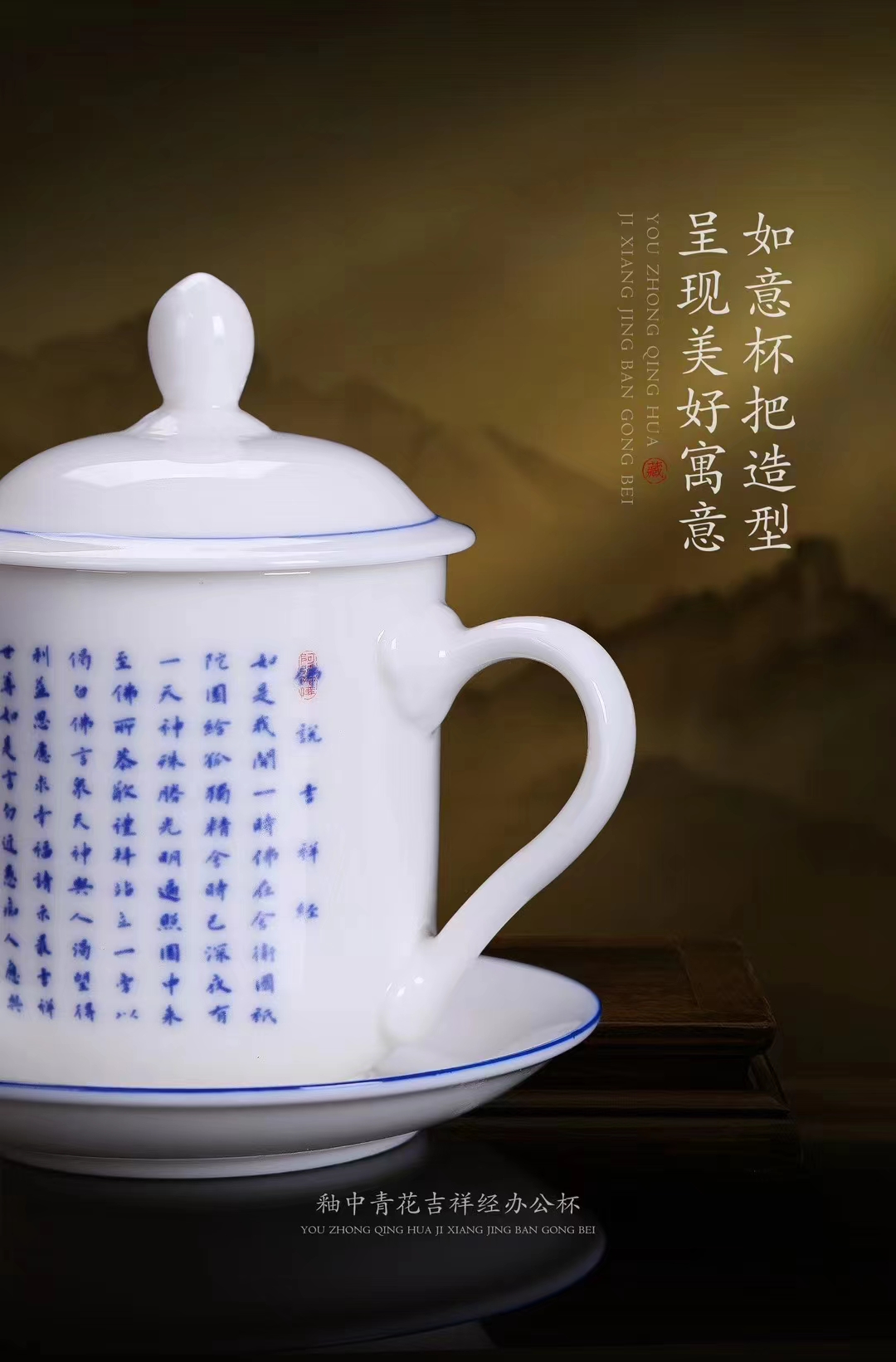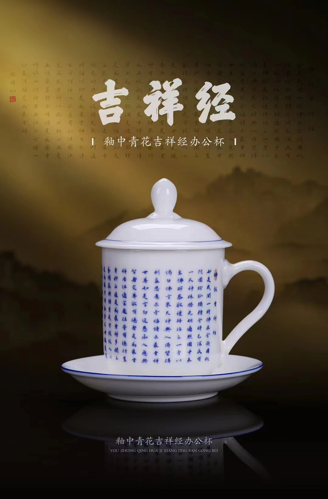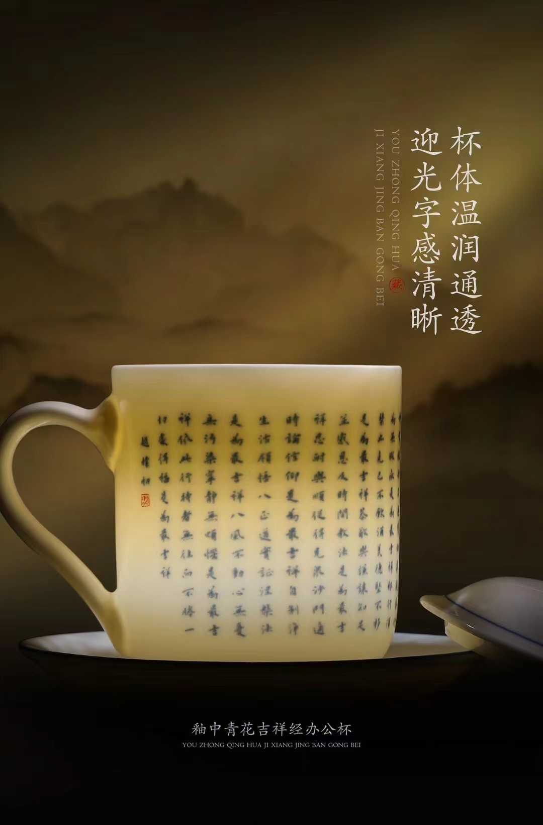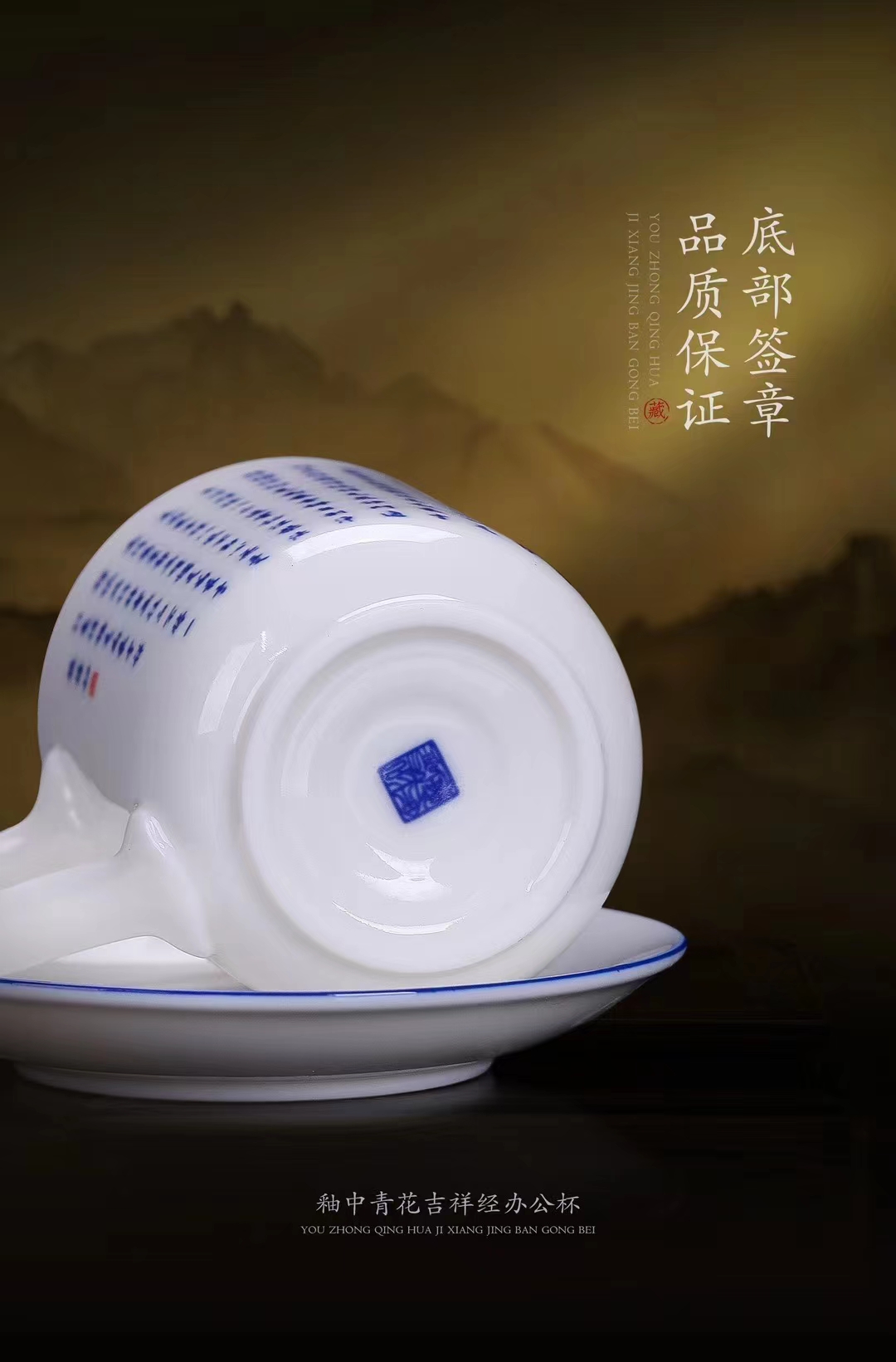 【吉祥经•釉中青花办公杯】德化优质高岭土,温润通透 字感清晰,作者签章 品质保证,包装精致 高端好礼