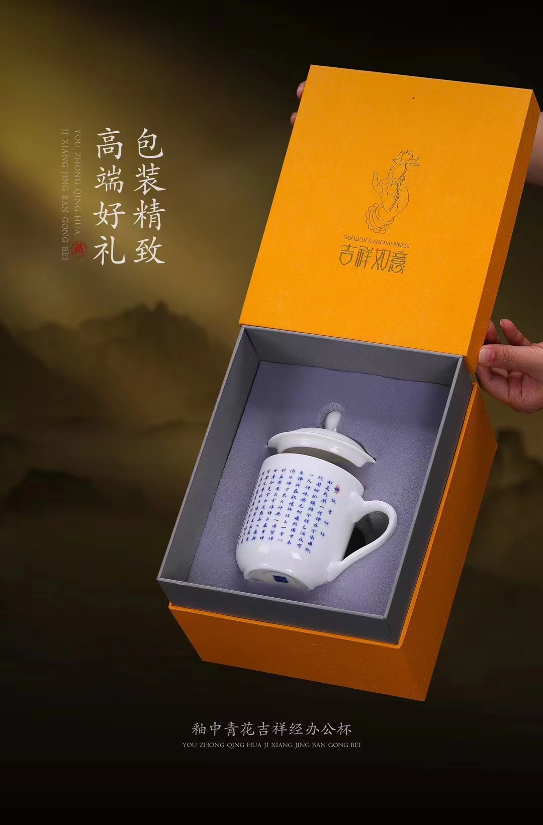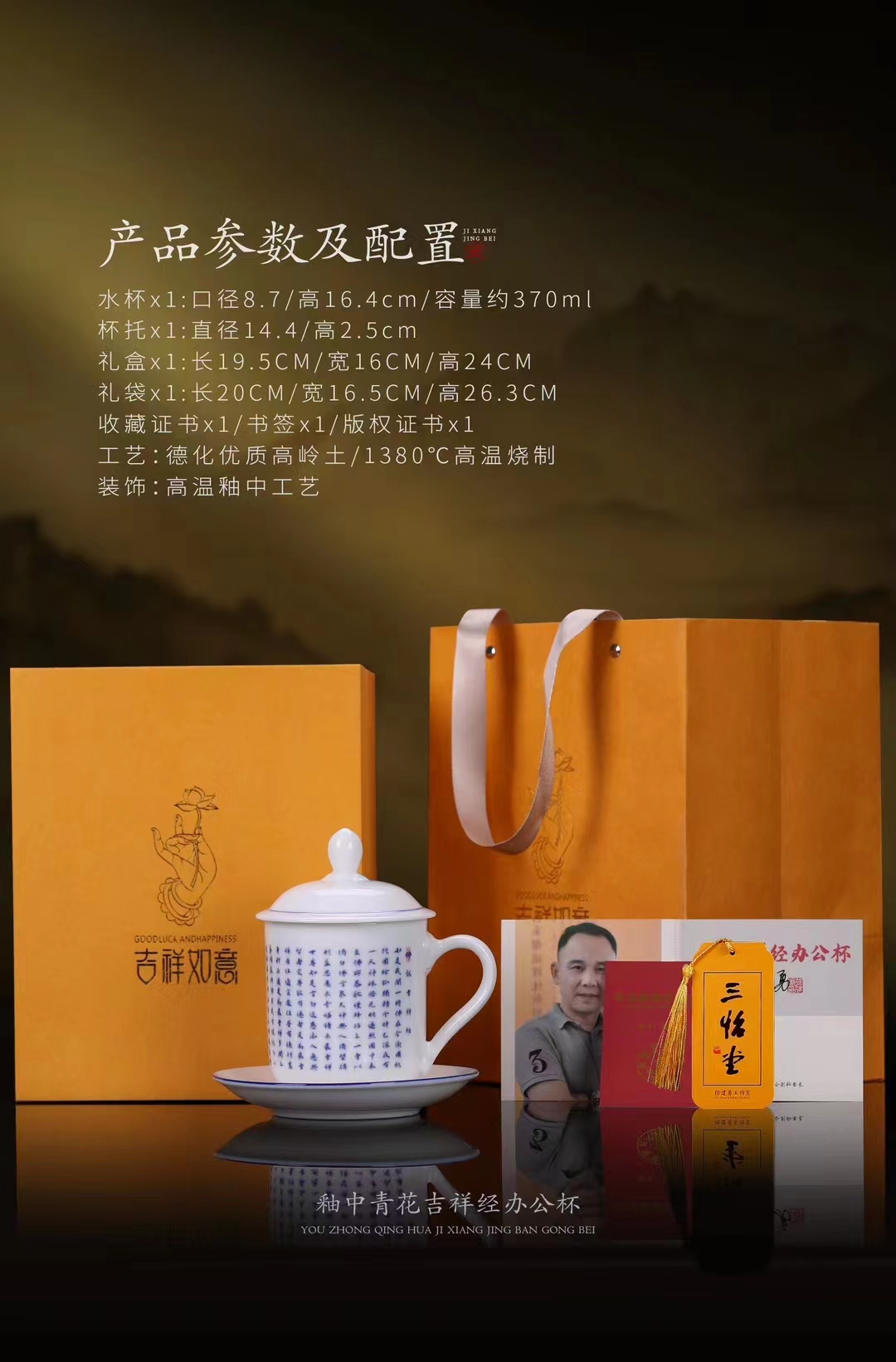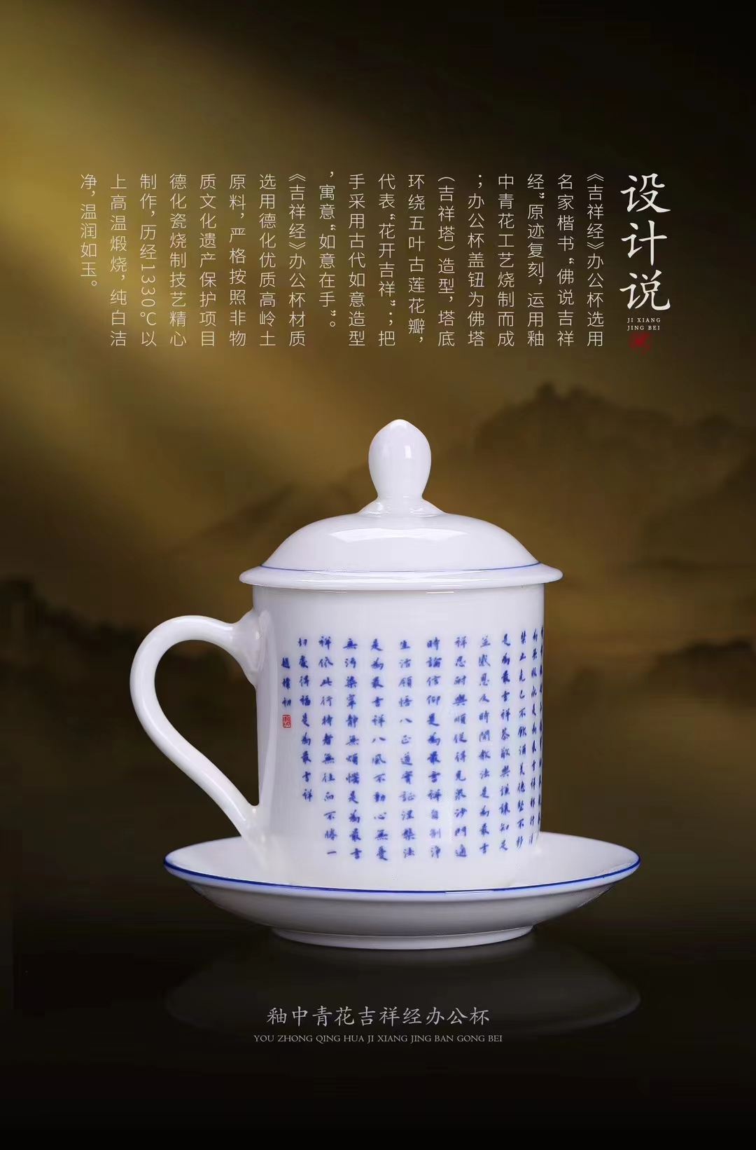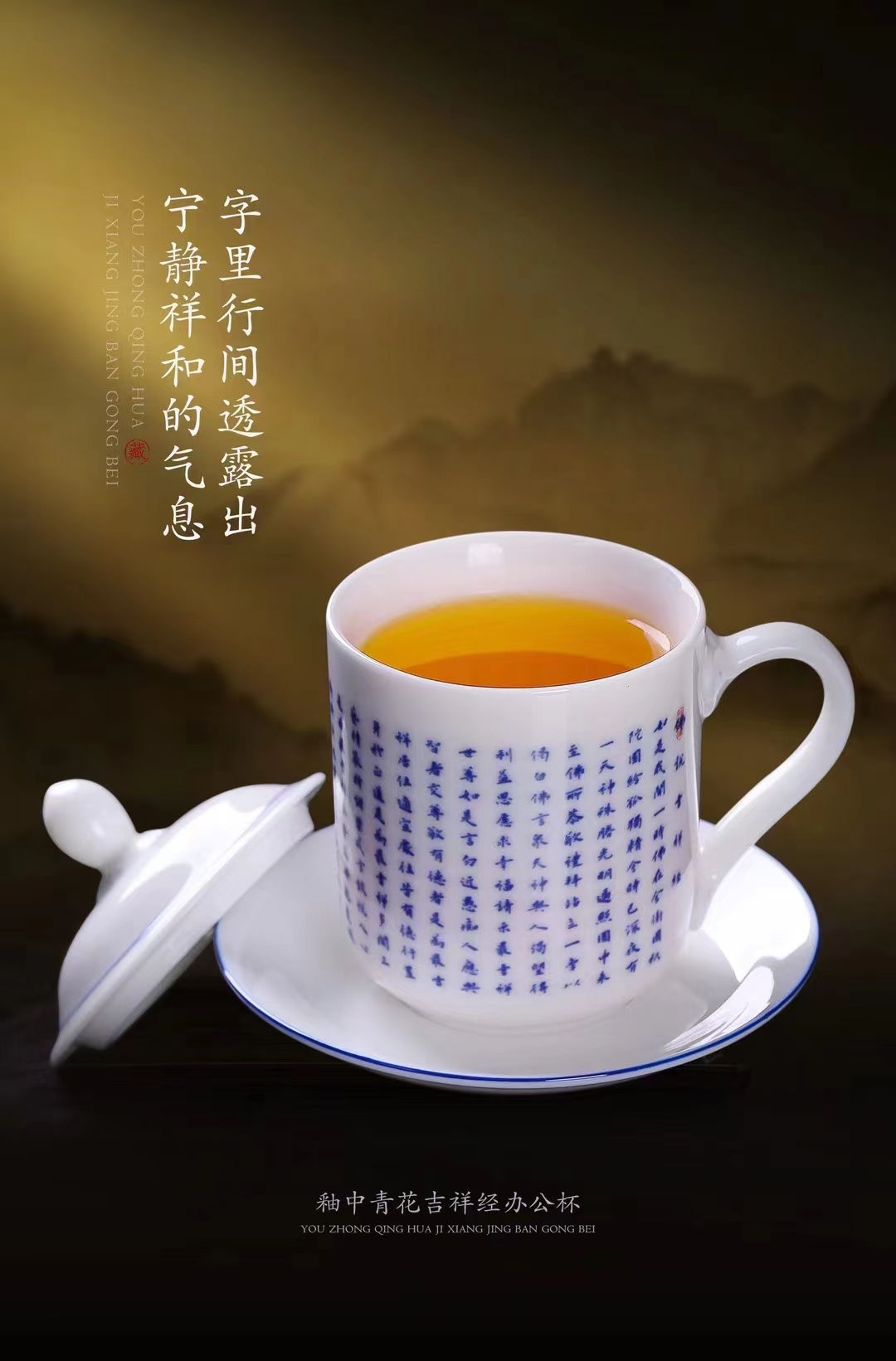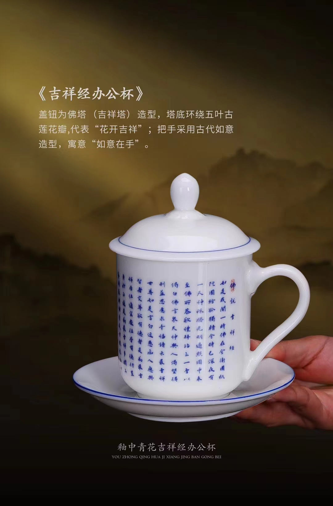 【吉祥经•釉中青花办公杯】德化优质高岭土,温润通透 字感清晰,作者签章 品质保证,包装精致 高端好礼