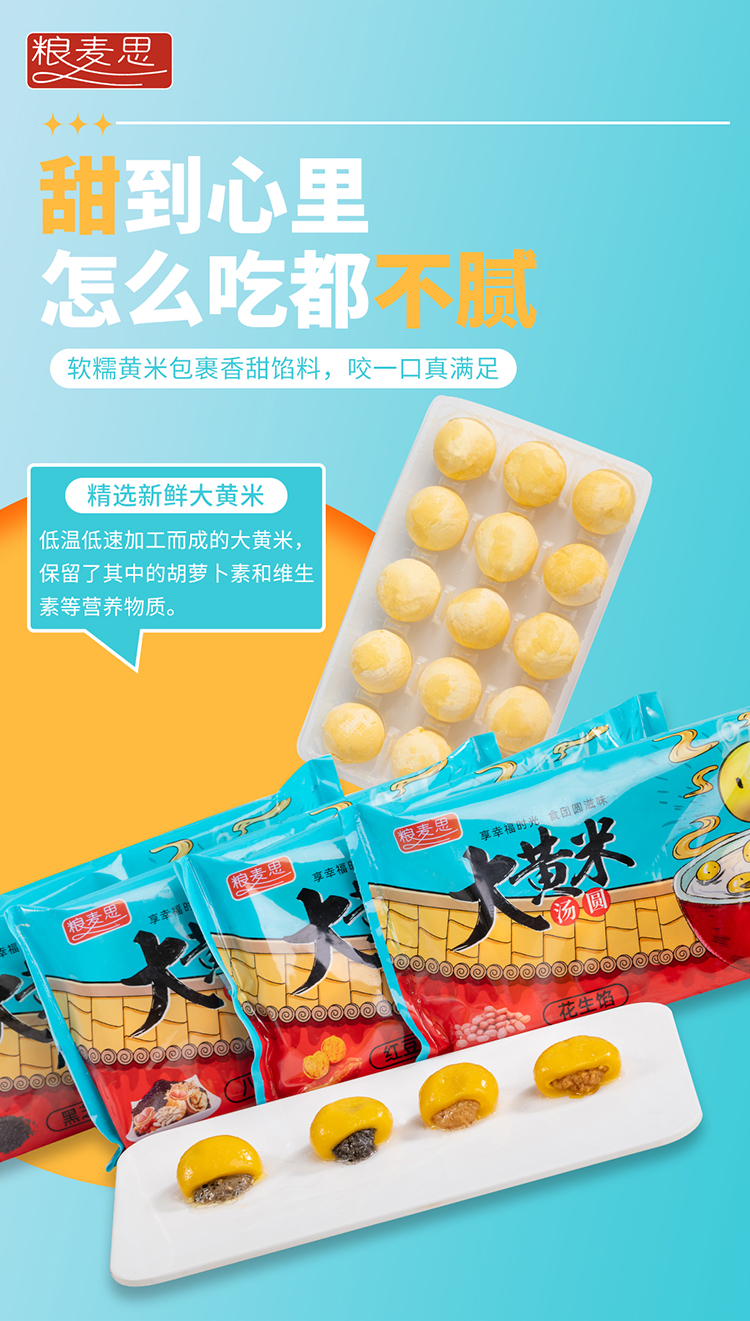 【粮麦思大黄米汤圆】享幸福时光,食团圆滋味,煮熟后的汤圆黄润软糯,米香浓郁,咬下去,醇香的内馅填满口腔,甜而不腻,细腻Q弹,老人小孩都爱吃。