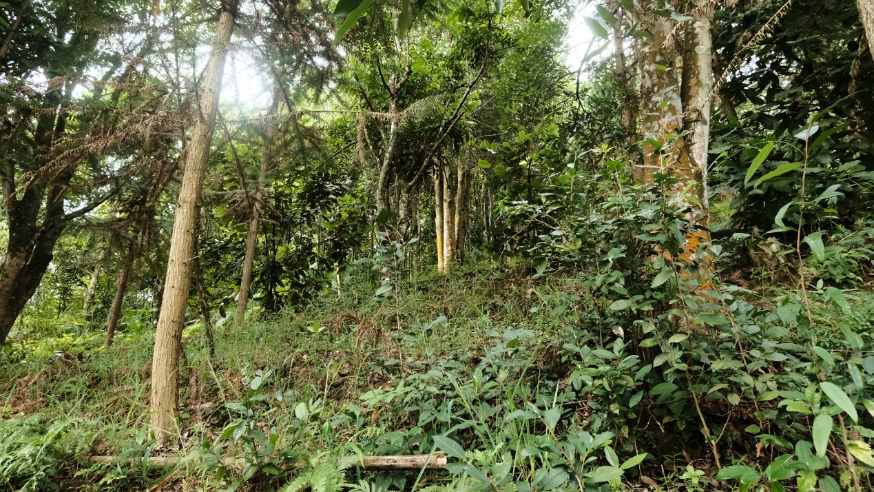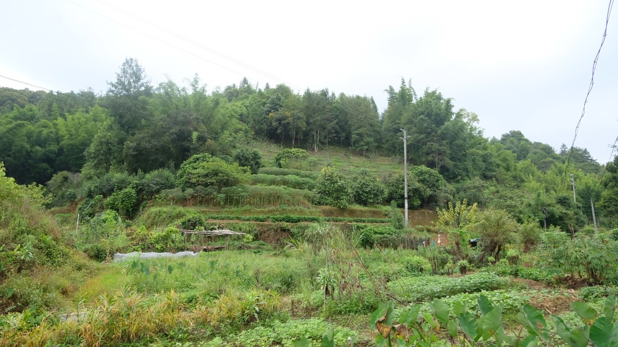 由下往上种植的作物依次为:蔬菜、芋头、姜等;中间层番薯、木薯、荔枝树等;再往上是茶油树、青梅树、八角树,还混杂了竹子和杉树;最高处就是杂木了。这些在当地是非常典型的农业景观。