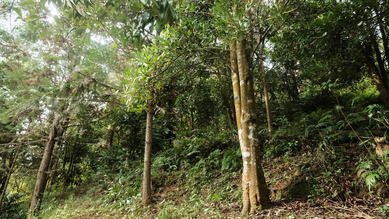 多种树木混杂,这片林子有茶籽油树、茶树、肉桂树、八角树、橄榄等,还有杉树、竹子