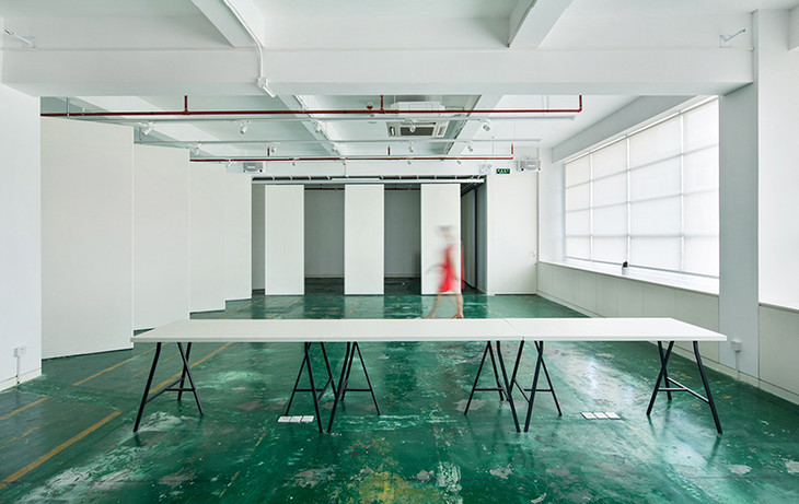 有方Studio是一处由工业厂房改造的极具质感的多功能空间。往日的机器生产留下了伤痕累累的老厂房地面,而我们以保护敦煌壁画般手法将其保留下来,呈现如同波洛克油画的非凡效果。天花板下悬挂的红色消防水管和喷淋头,沿南北向贯穿所有空间,我们因而特别设计了与之平行等高的线性灯槽系统,并与厂房外立面的钢窗垂直分格对应,叠加成独具特色的屋面网格。通过整合这些新旧元素,我们构筑出一种有力的空间秩序:既根植于原有肌理,又使整个空间焕然一新。