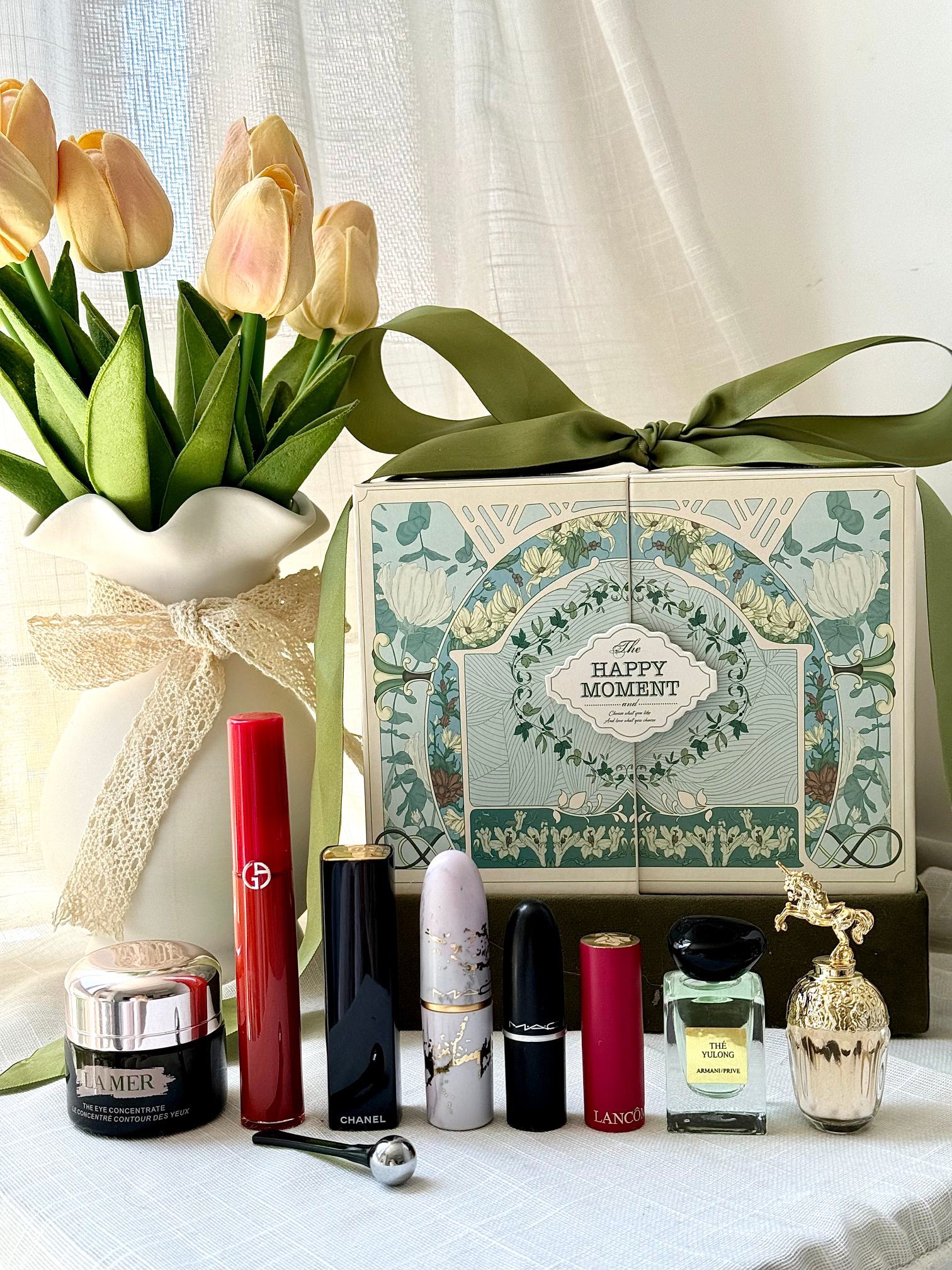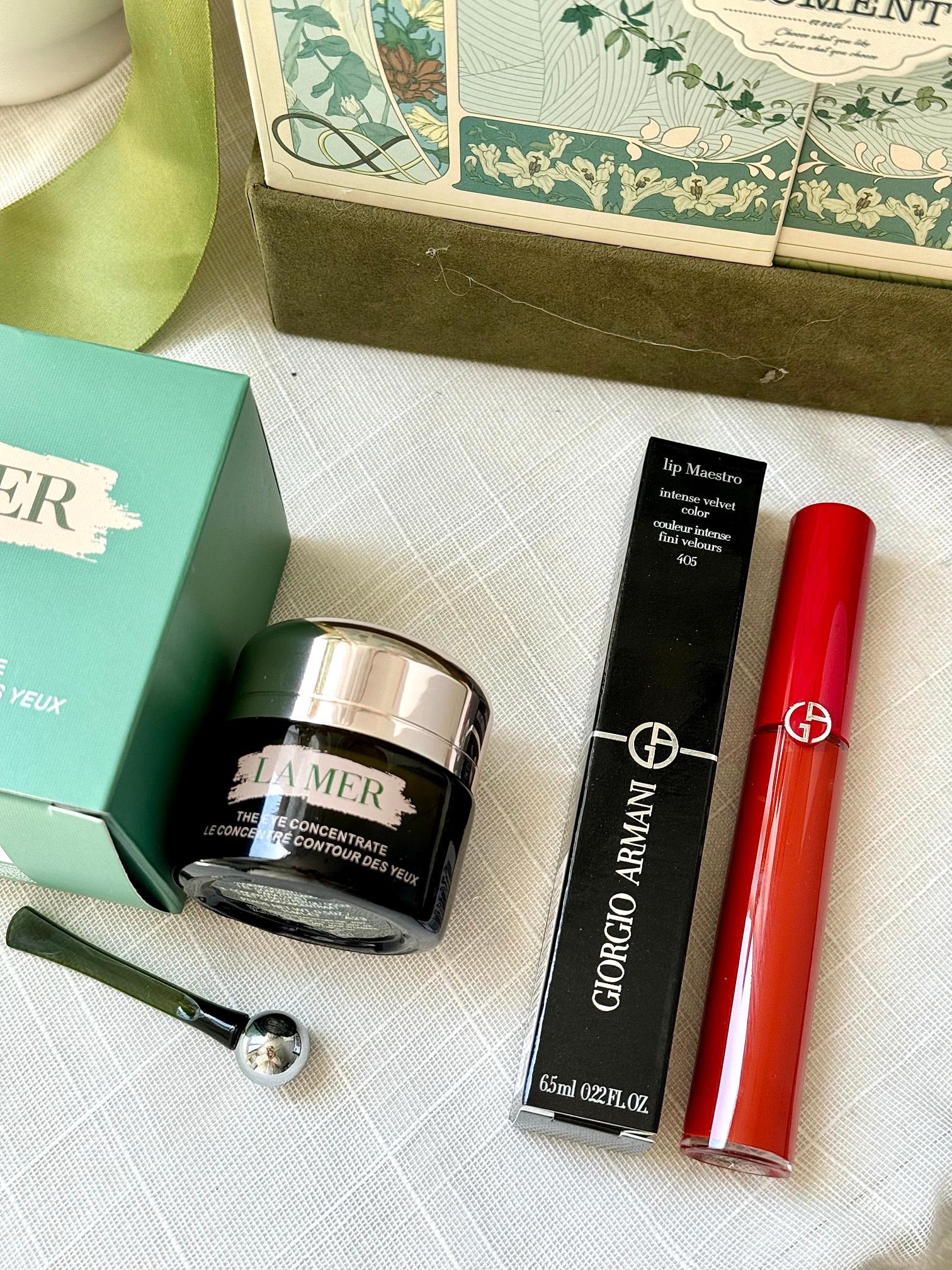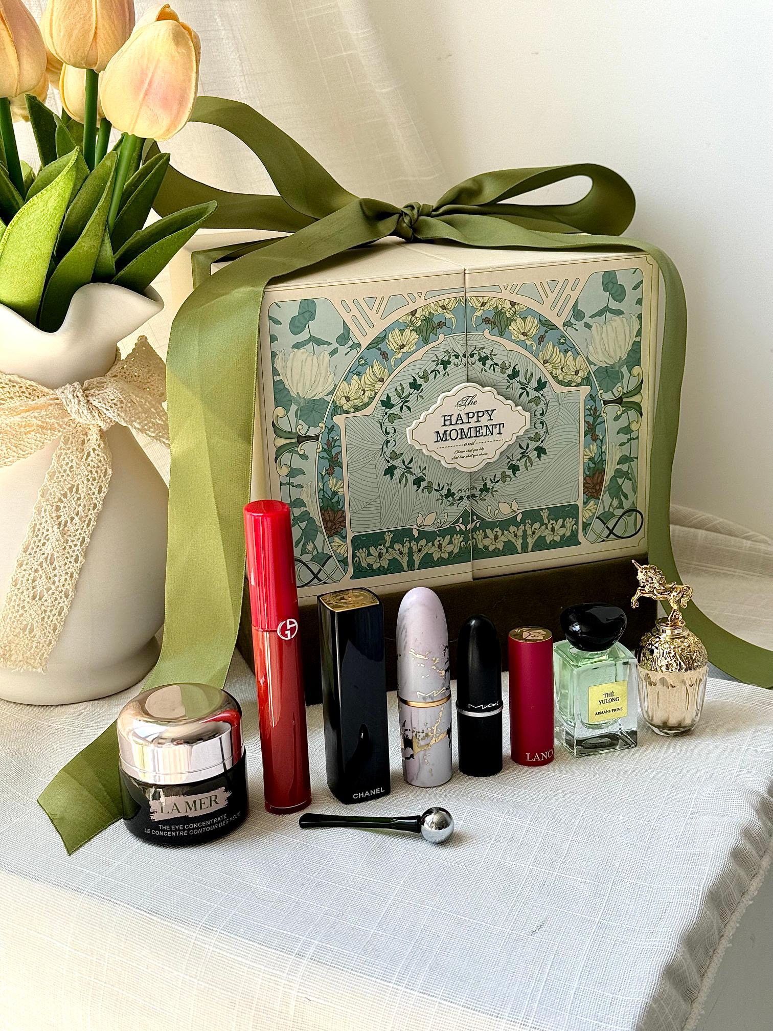 【眼霜香水彩妆森系对开蝴蝶礼盒】内含:眼霜15ml+香水5ml+唇釉405#+按压口红N58#+大理石+随机红管+黑管602+玉龙茶7.5ml+拉菲草!仪式感满满~ 都是热烈浪漫的爱意~