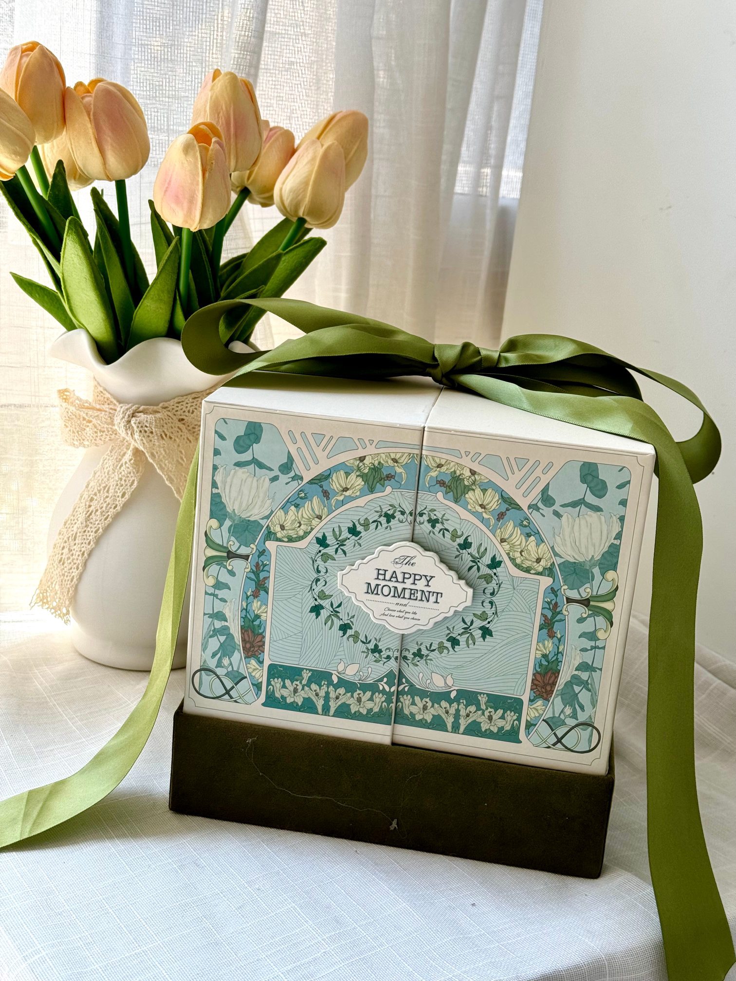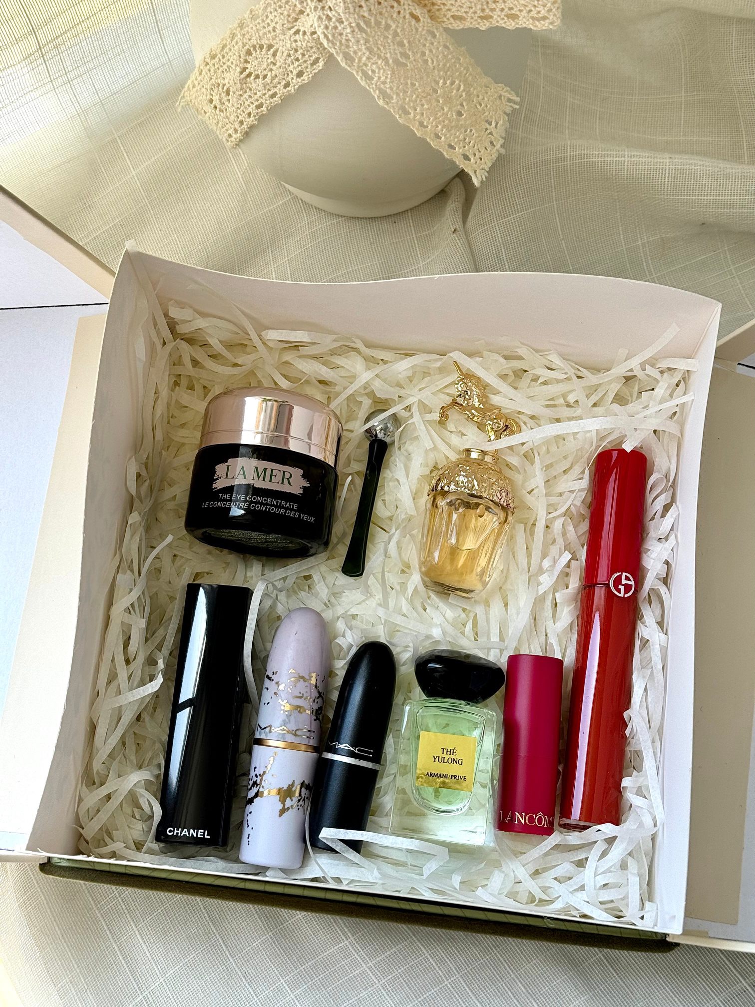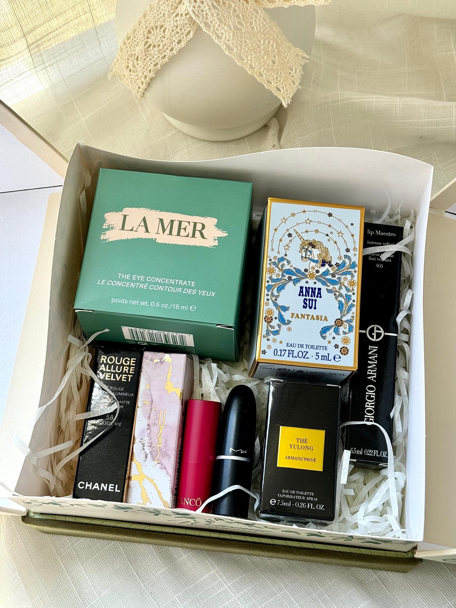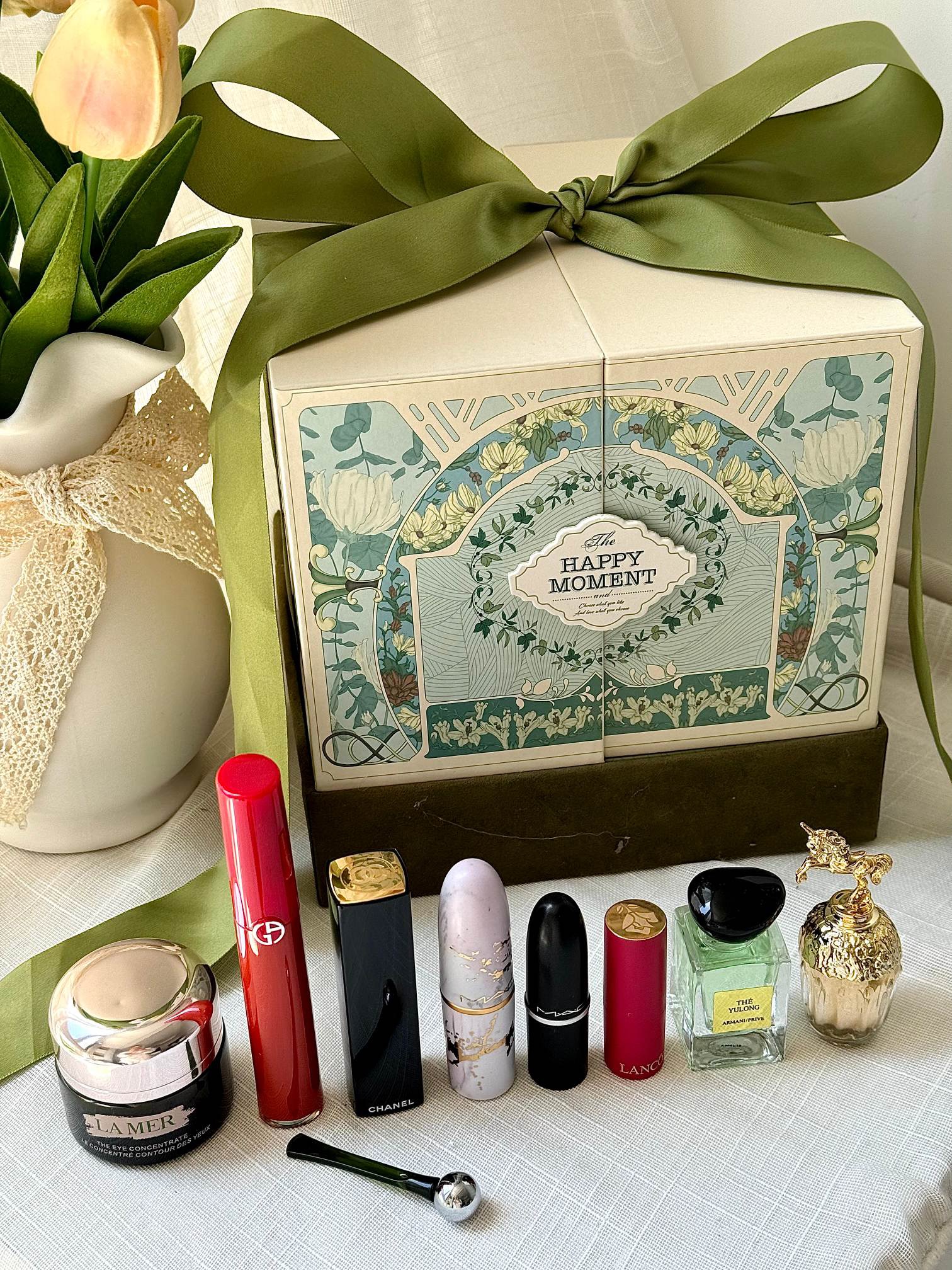 【眼霜香水彩妆森系对开蝴蝶礼盒】内含:眼霜15ml+香水5ml+唇釉405#+按压口红N58#+大理石+随机红管+黑管602+玉龙茶7.5ml+拉菲草!仪式感满满~ 都是热烈浪漫的爱意~