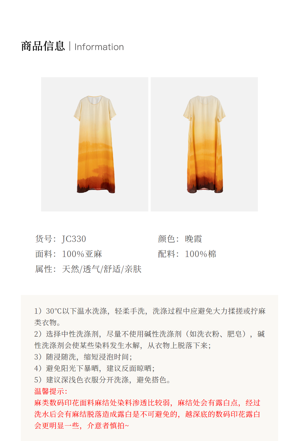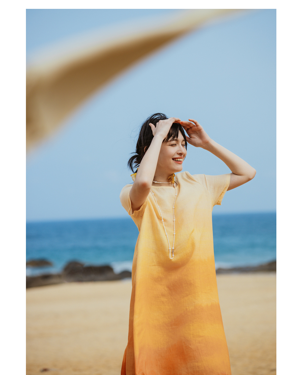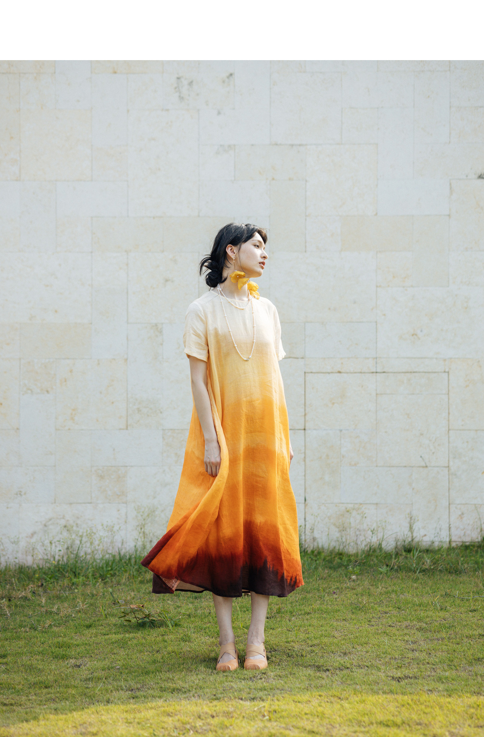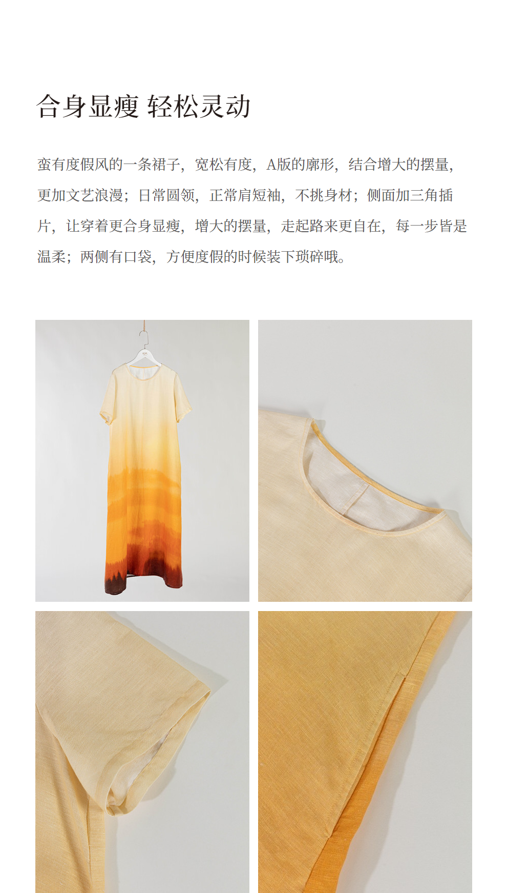 绽放旅行女装330朵/亚麻原创花型晚霞色度假旅游宽松短袖连衣裙